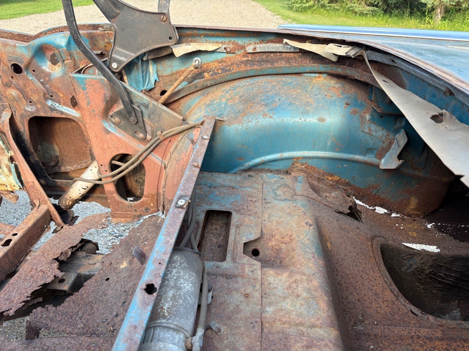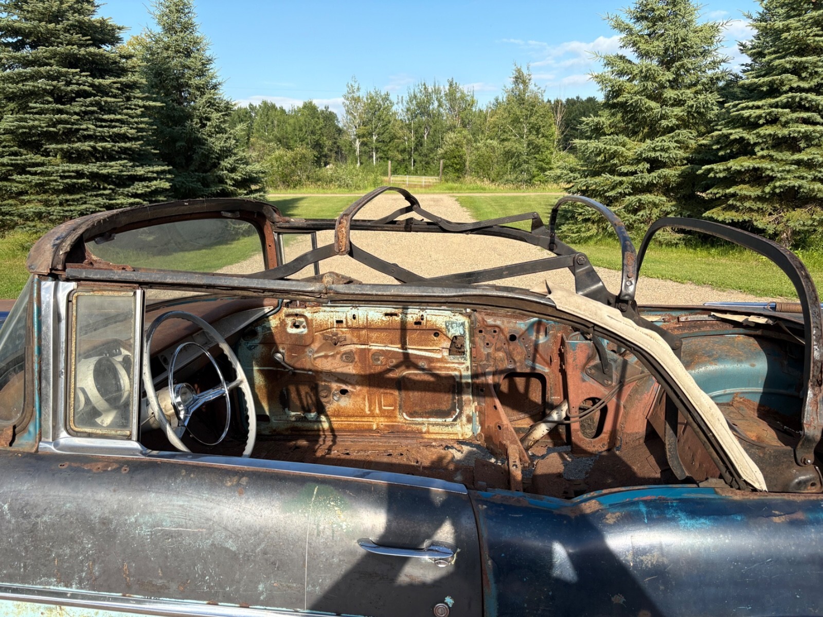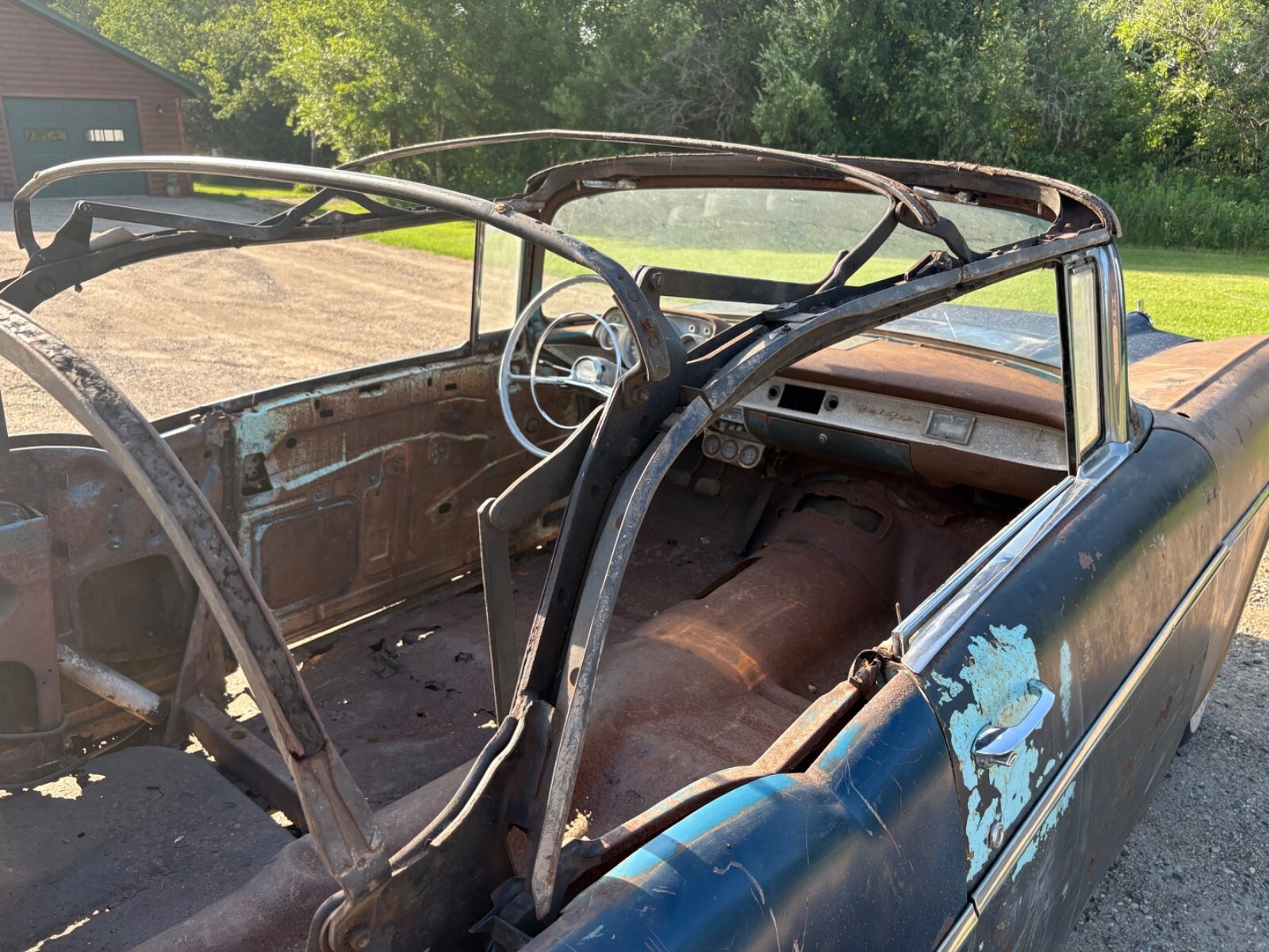 The frame has been blasted and painted some years ago prior to my ownership. It is overall usable but does have a few areas that will require repair In the rear of the skid plates. This car needs a lot of work but is a good start for someone wanting to build a real 57 Chevy convertible.