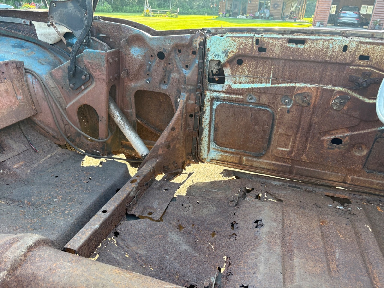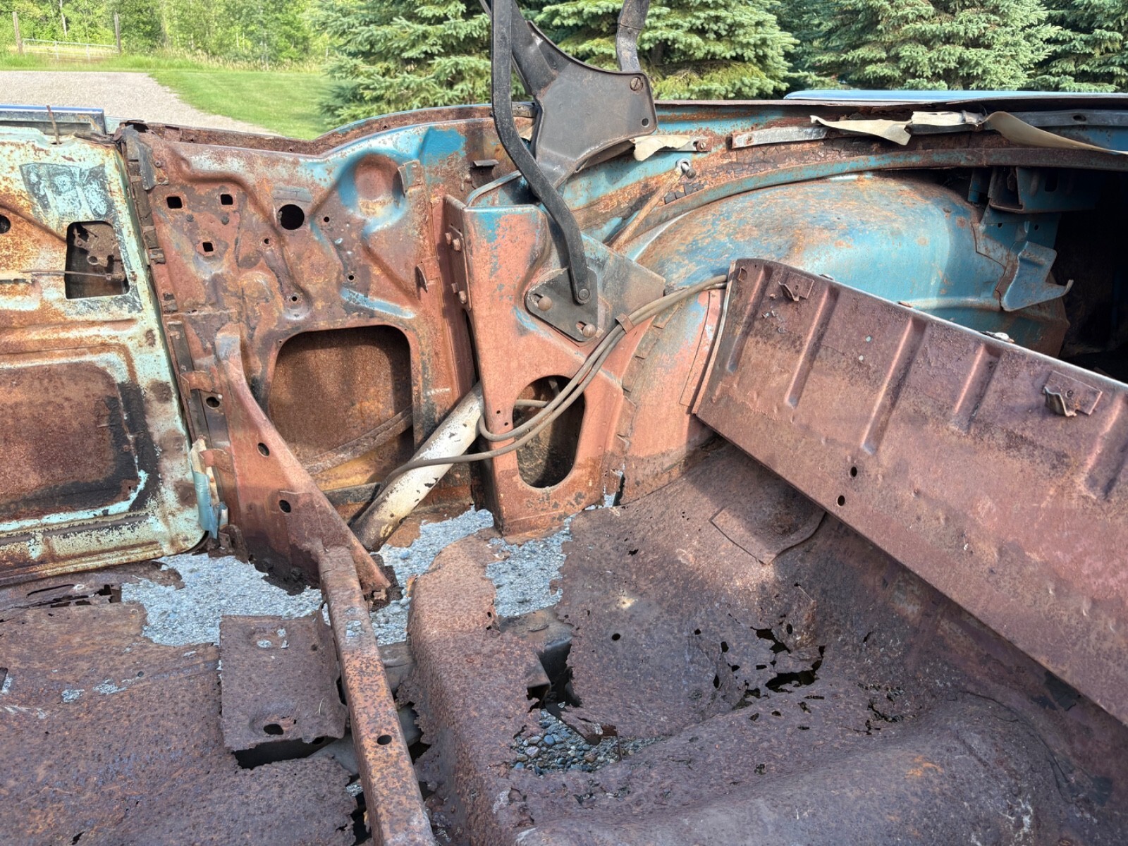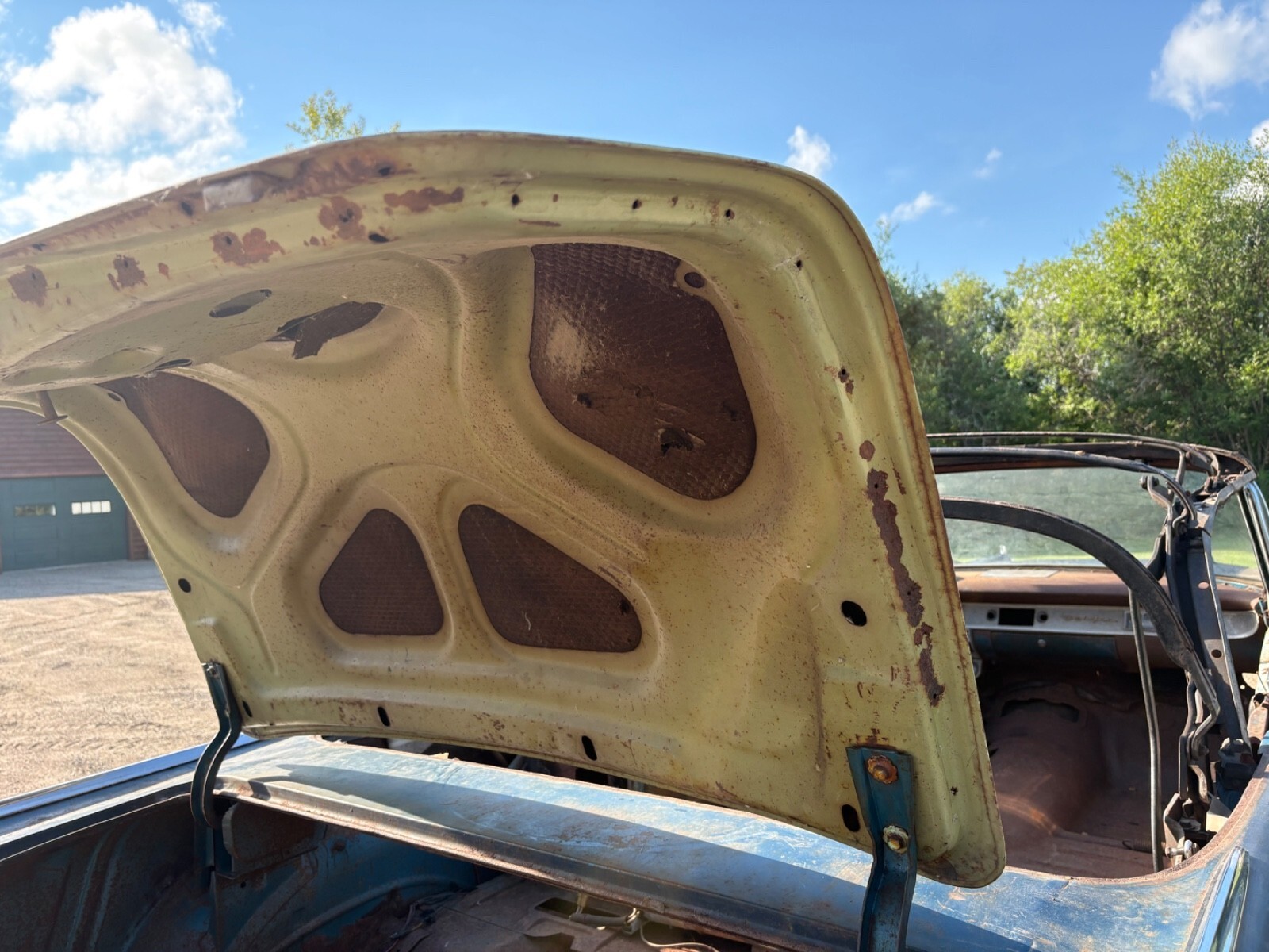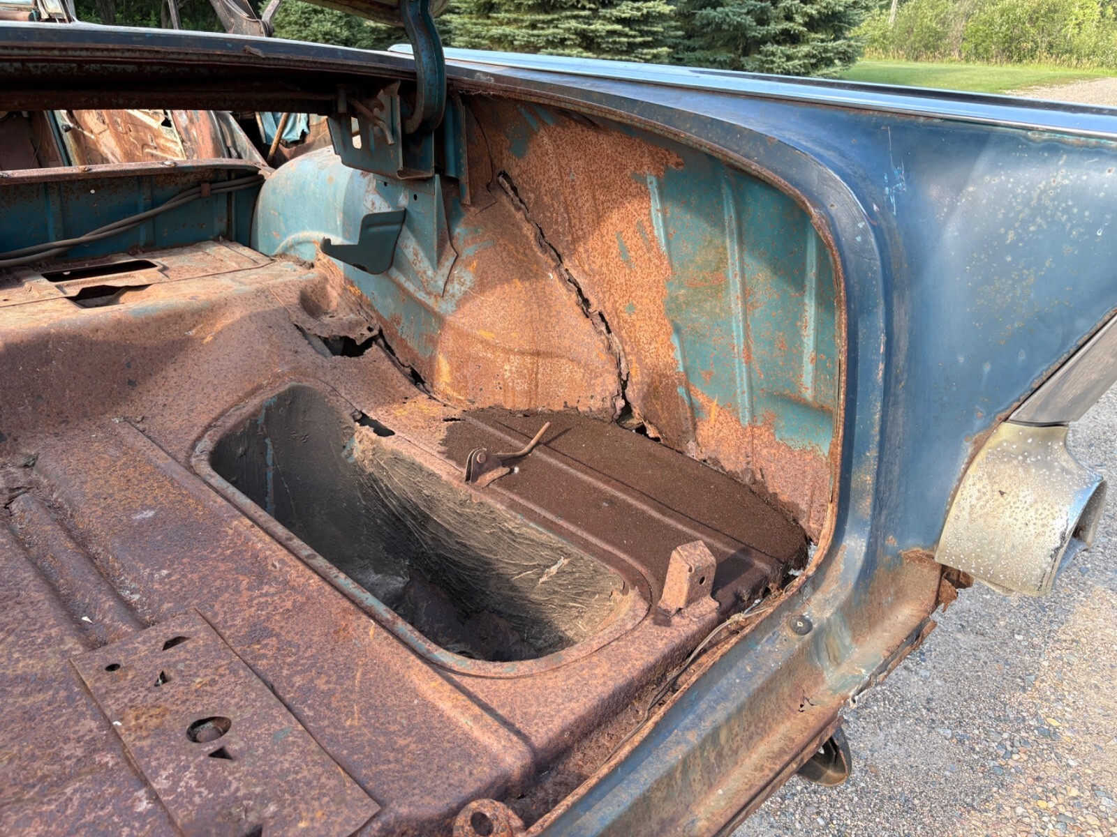 The frame has been blasted and painted some years ago prior to my ownership. It is overall usable but does have a few areas that will require repair In the rear of the skid plates. This car needs a lot of work but is a good start for someone wanting to build a real 57 Chevy convertible.