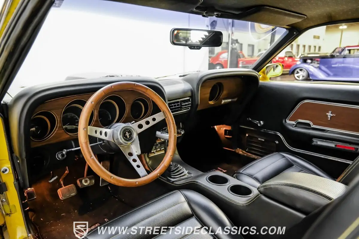 Finished just two years ago after a 20-year build, this 1970 Ford Mustang Mach 1 gleams in a custom yellow metallic finish that catches light from every angle. The iconic fastback silhouette features black accents strategically placed across the body – painted stripes on the hood and trunk with Twister Special decals along the sides. The aggressive stance is enhanced by 14-inch front and 15-inch rear Magnum 500 wheels wrapped in meaty 215/70R14 front and 275/60R15 rear tires. Additional exterior elements include the hood scoop, sleek rear window louvers, rear spoiler, and classic hood pins that add authentic muscle car character.