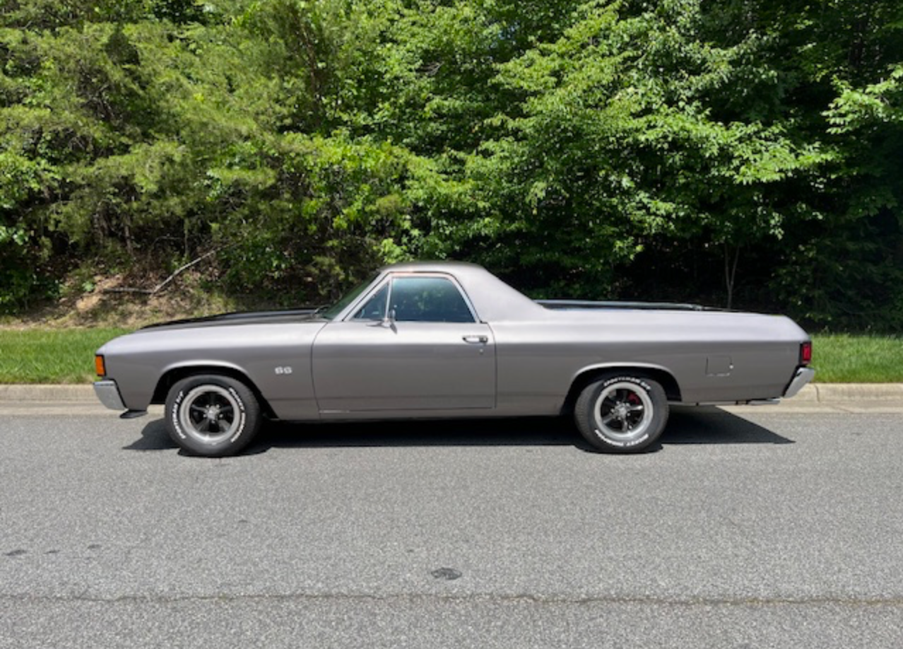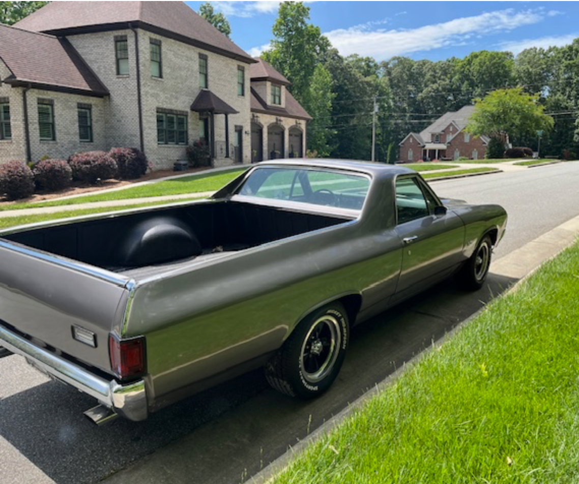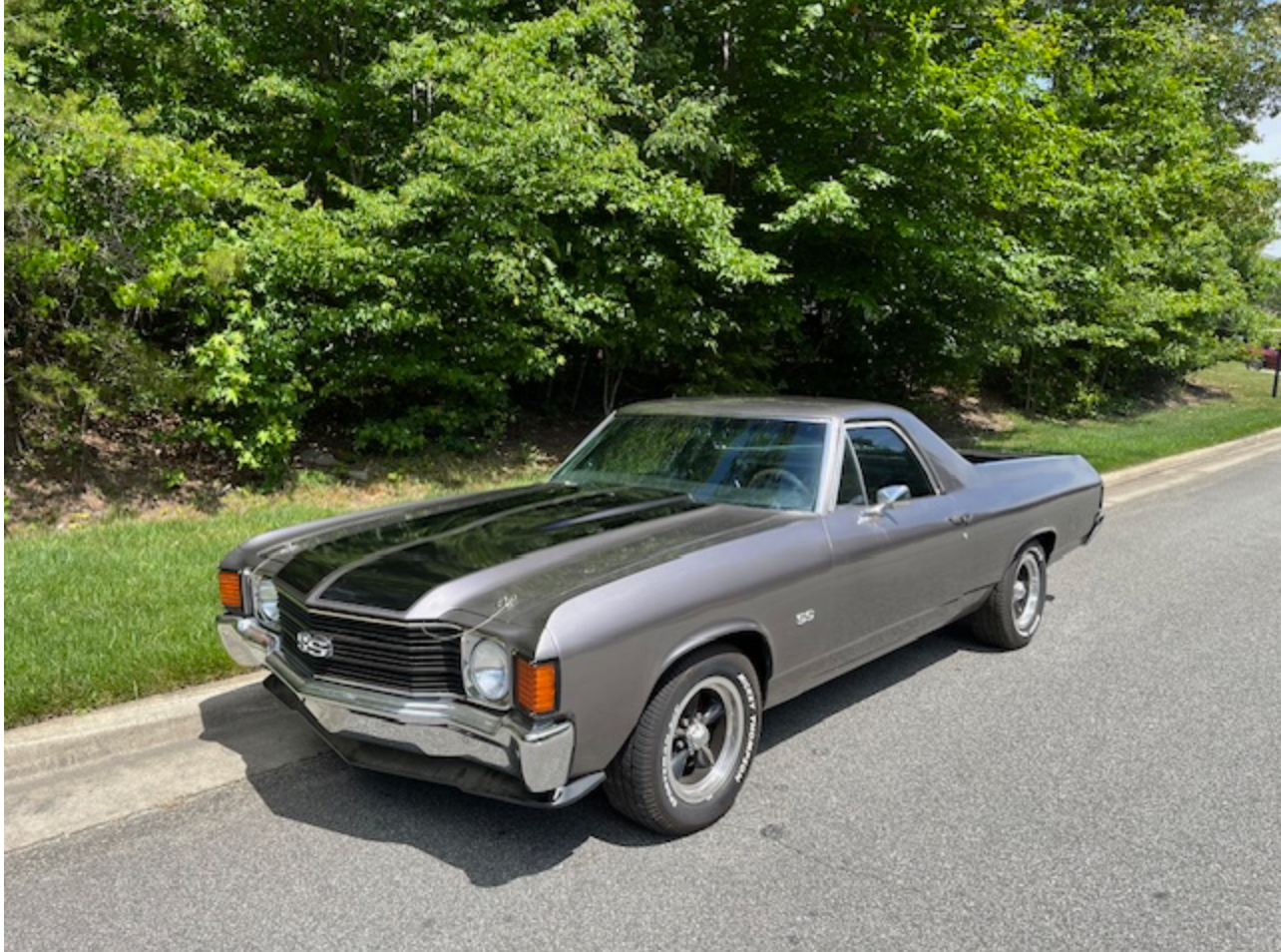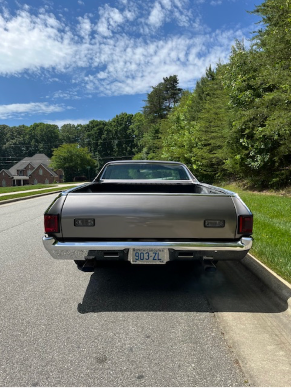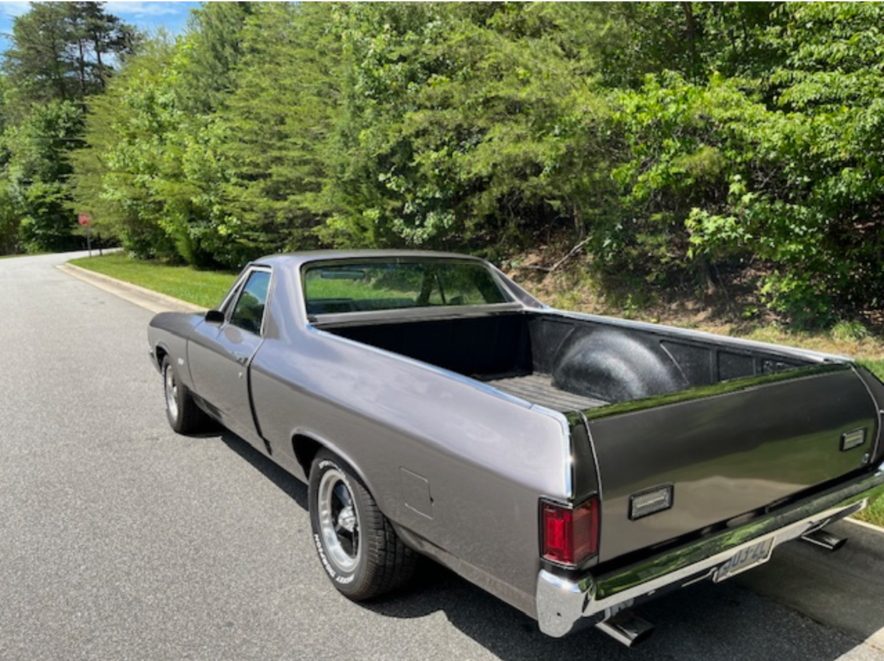 This classic El Camino has been restored to its classic beauty with a modern twist. You definitely won't see anything like this on your way to the grocery store. This car has kept its classic styling, but has modern upgrades, such as Vintage Air, four-wheel disc brakes with red calipers, and Bluetooth stereo.BODY OVERVIEW: The body of this El Camino is in good condition with a few minor areas under the paint that need rust repair. The "John Wick" inspired paint job showcases a gunmetal gray with black racing stripes. All chrome trim for the exterior is brand new: front and rear bumper, door handles, truck bed trim, windshield wipers, and badges. The front features a spoiler below the bumper to give a more aggressive look. The brakes have all been upgraded to four-wheel disc with red brake calipers that really pop against the gunmetal gray paint job. This is definitely not your dad's El Camino.UNDER THE HOOD: The engine is a small block Chevy 400 that has been upgraded with all new spider intake, 750 carb, duel fan radiator with cooling regulator, chrome headers, chrome valve covers, serpentine pulley system, brand new battery, brand new alternator, brand new fuse box, and brand new inner fenders.The transmission is automatic with overdrive that is perfect for cruising!INTERIOR: Everything in the interior is brand new with an all back color scheme that fits this car perfectly. It features a brand new bench seat, brand new carpet, chrome steering wheel with tilt, power steering, walnut steering wheel, brand new rear view mirror, brand new door locks, door handles, and door panels, Dakota digital SS style gauges, Vintage Air, and a classic car stereo with Bluetooth capability. This El Camino is perfect for someone seeking a classic muscle car with modern conveniences. It's ideal for cruising, going to car shows, or just enjoying the weekend. It's going to be next to impossible to find an El Camino in this good of condition with these upgrades for this price. It does need some minor paint and body improvements, but that has been reflected in the price.