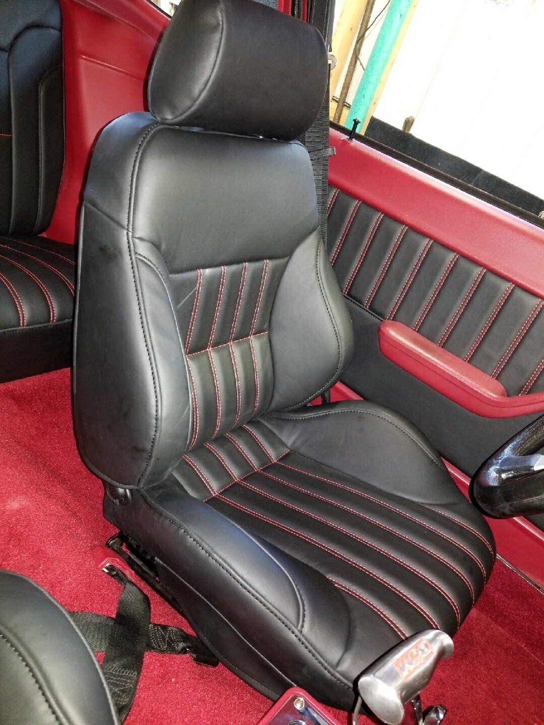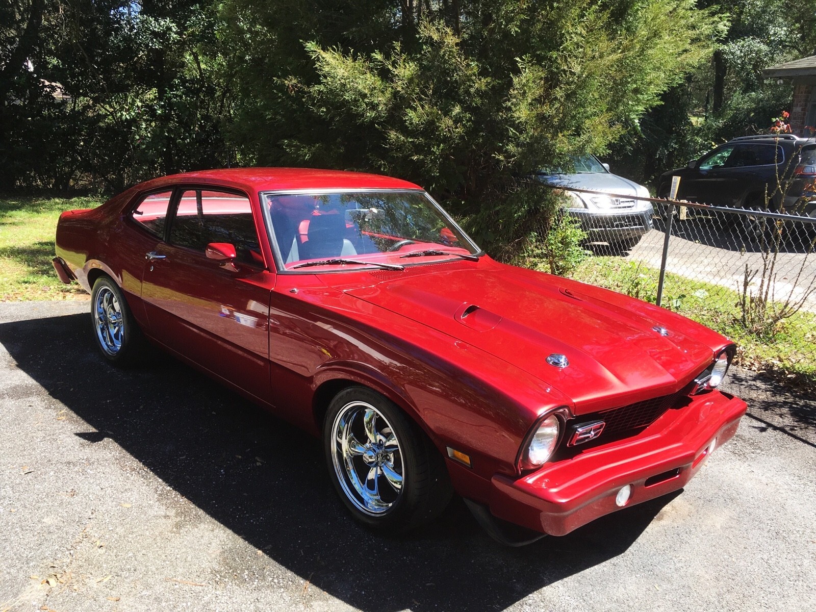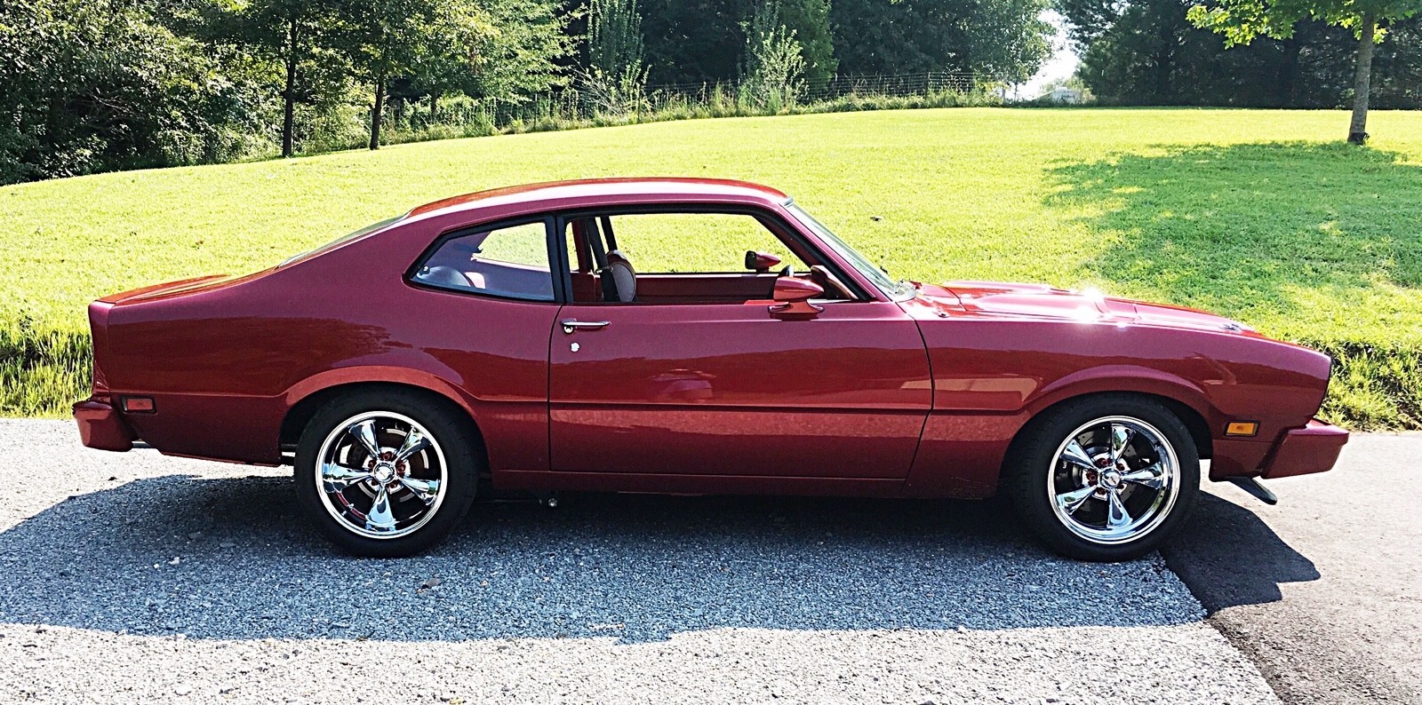 Very Nice Interior, looks like leather but is marine grade vinyl ultra leather. Reupholstered ProCar Rally Bucket Seats Front and Stock Maverick back seat reupholstered that matches pattern of buckets. Interior was installed approximately 5 years ago. All new carpet was installed at same time with with Maverick logo carpet floor mats front and rear. Headliner looks like new. Car has Tach, Oil Pressure, Oil Temp, Water Temp, Volt Meter, Trans Temp, Vacuum Gauge, which all work. All other original dash gauges and lights work properly. AM/FM/CD Stereo.