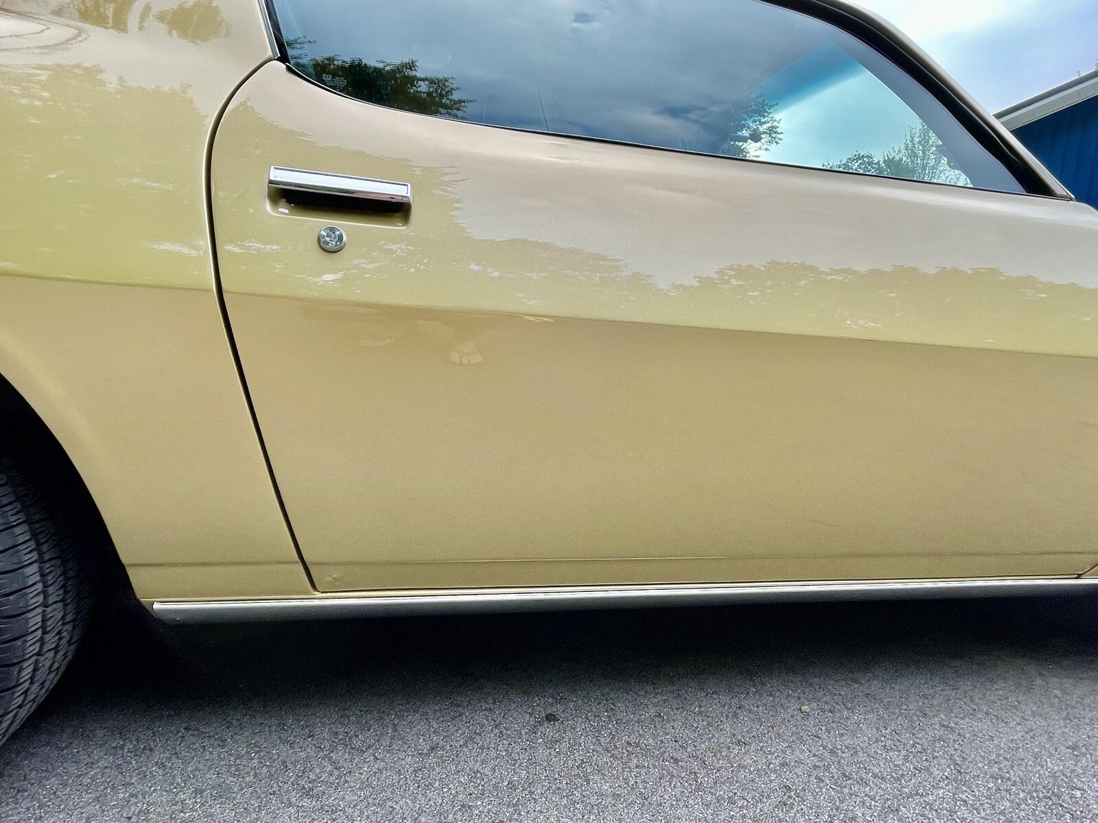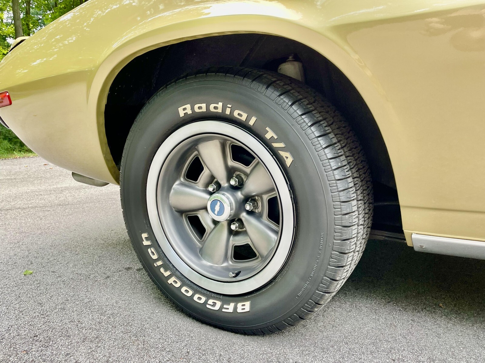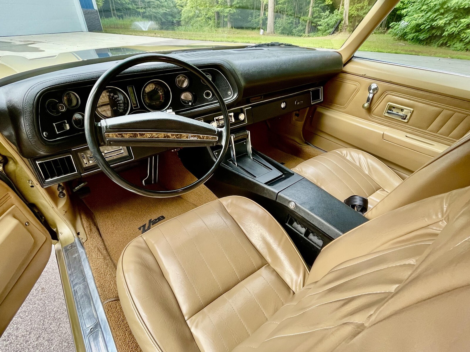 The factory-original Placer Gold paint was expertly reapplied during a full restoration completed around 2012 in Florida. The finish is deep and rich, accented by black painted rally stripes and sitting over all original GM sheet metal, including original quarters—something rarely seen. The body is laser straight, and we find no signs of prior accident damage or major repair. There are a few very minor cosmetic imperfections to note: some small blisters on the lower edges of both doors, a small repair inside the driver's door jamb where the rubber door stop rests, and a few minor touch-ups. Overall, the car presents incredibly well and draws attention wherever it goes.