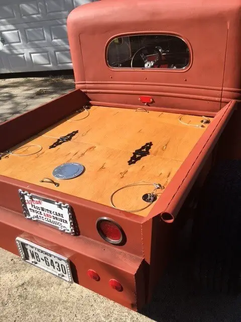 1935 International PickupToyota FrameDisc brakes front and rearTires like newWeld chrome rims350 cubic inch/.30 over cam with650 Holly CarbVortex HeadsNew MirrorsNew TechNew Fuel GaugeNew Electric Fuel PumpNew BatteryLots of new chromeNew Fan and RadiatorNew Horn, Wipers, Turn signalsDecals on door peel off inside and outDual mufflers or straight pipes350 Turbo TransmissionAll new insulation in cabNew bomber seatsPush button startQuick disconnect steeringPhone adapter plugRoll up glass in the doors3/4 maple deck lid bi-fold