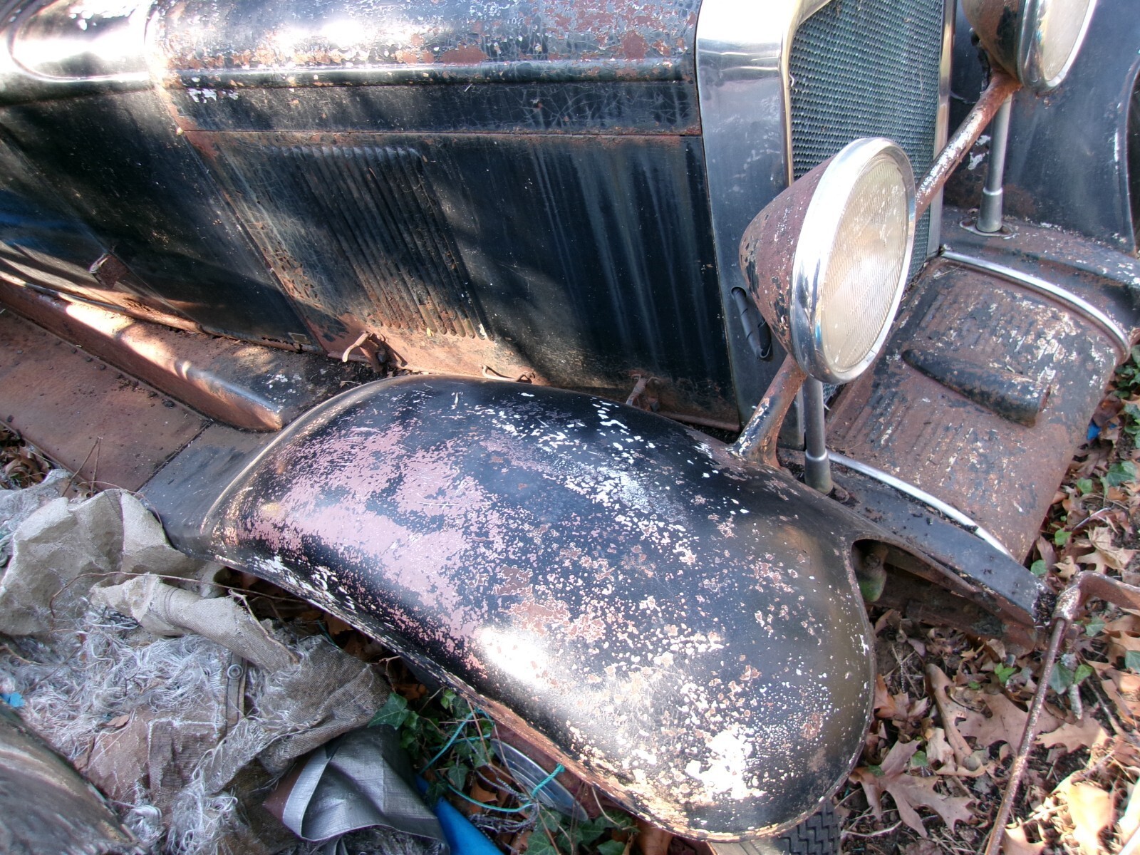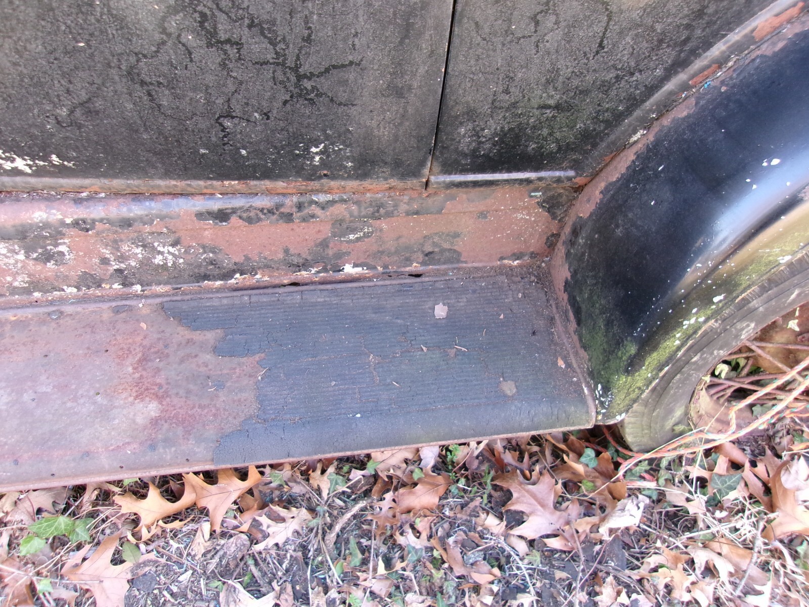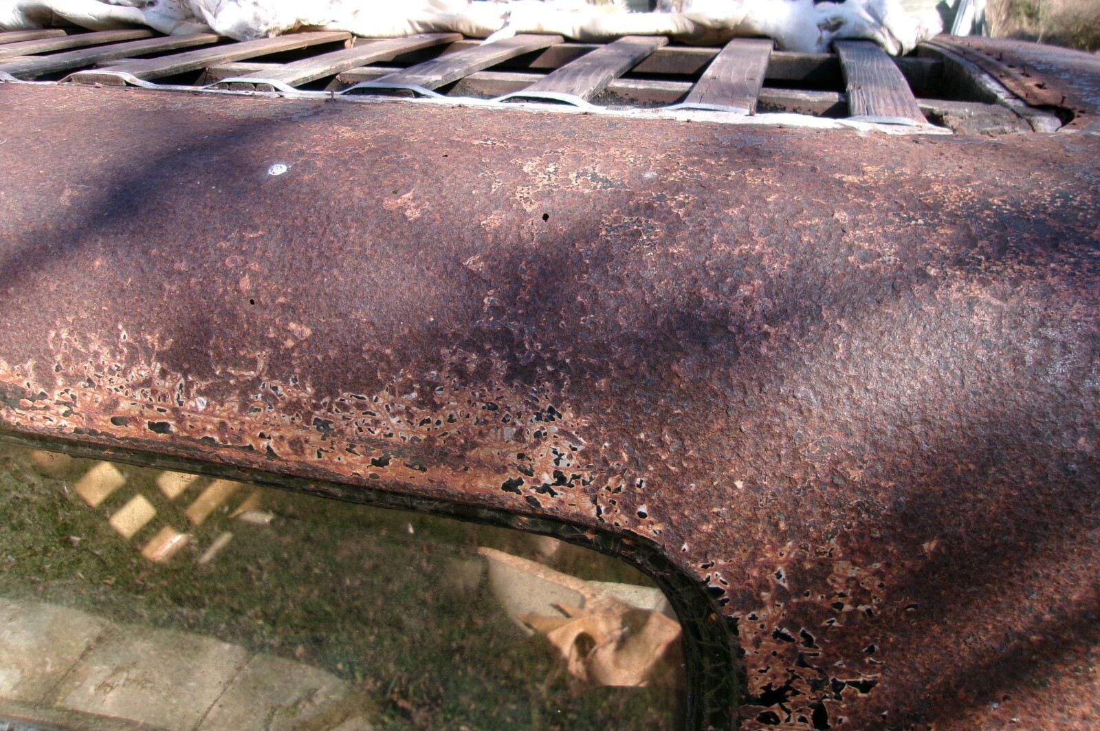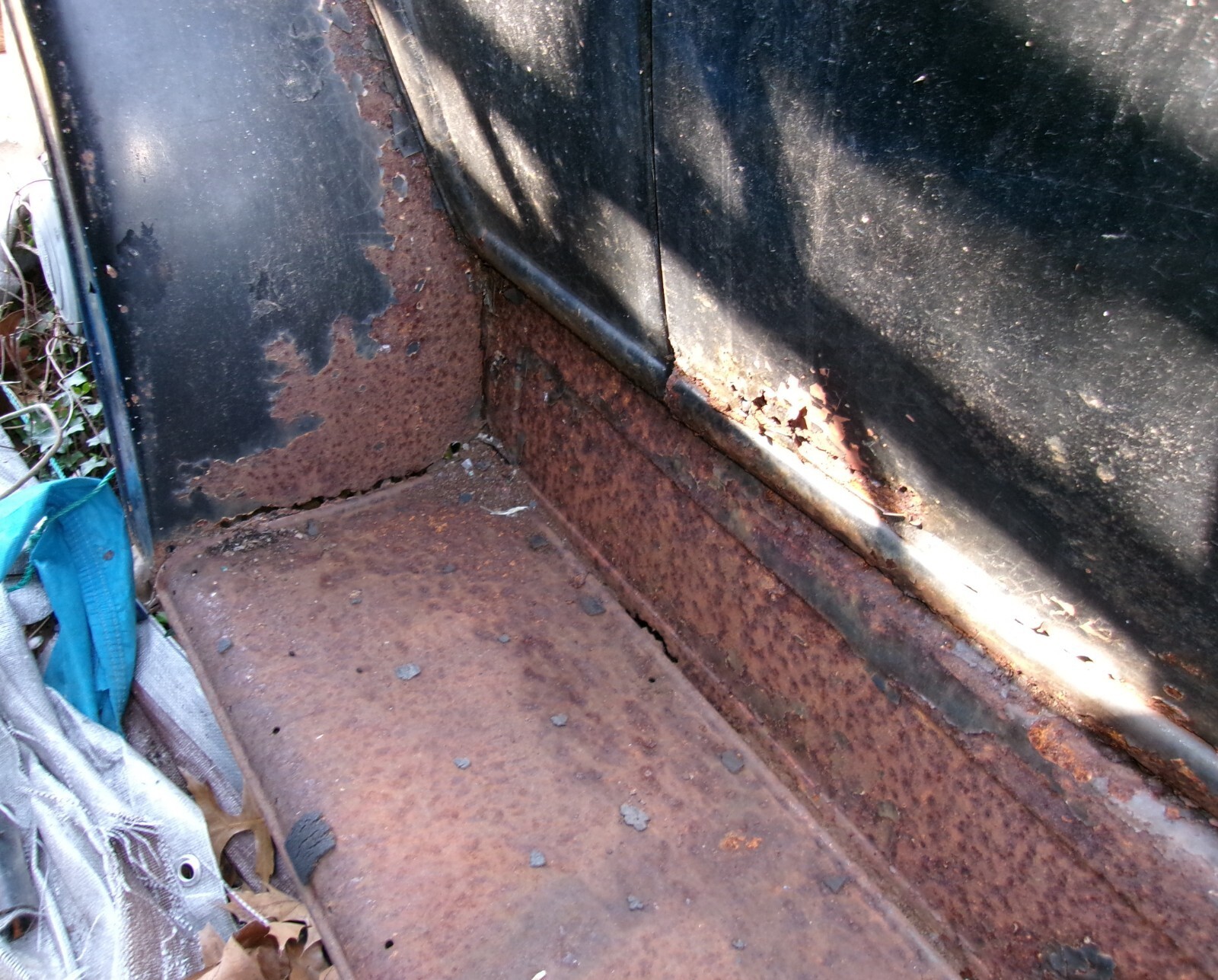 The roof is heavily pitted, and the rear section (above the rear window) is rusted through from the tarp that was on it. The hood is seized. Door bottoms, bottom of cowl, and the splash aprons/running boards are rusted through. Most, if not all, of the wood will have to be replaced.