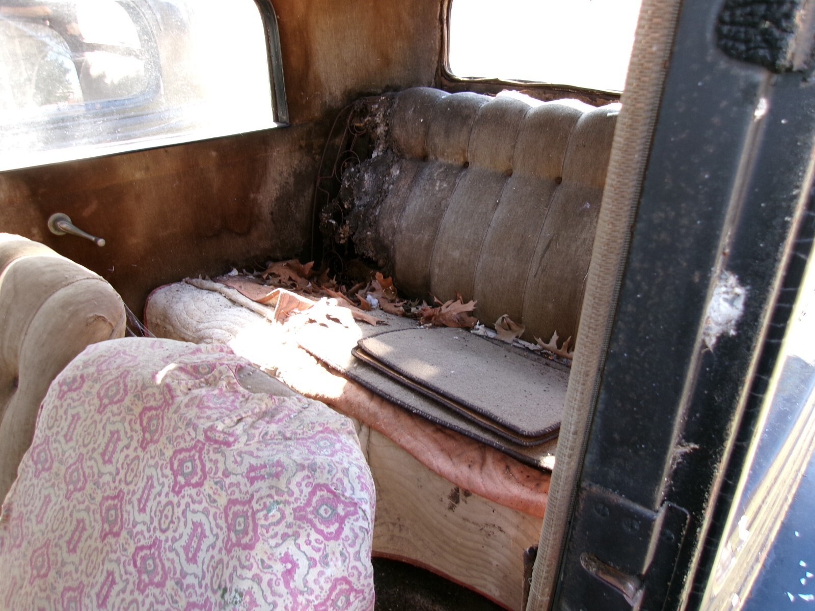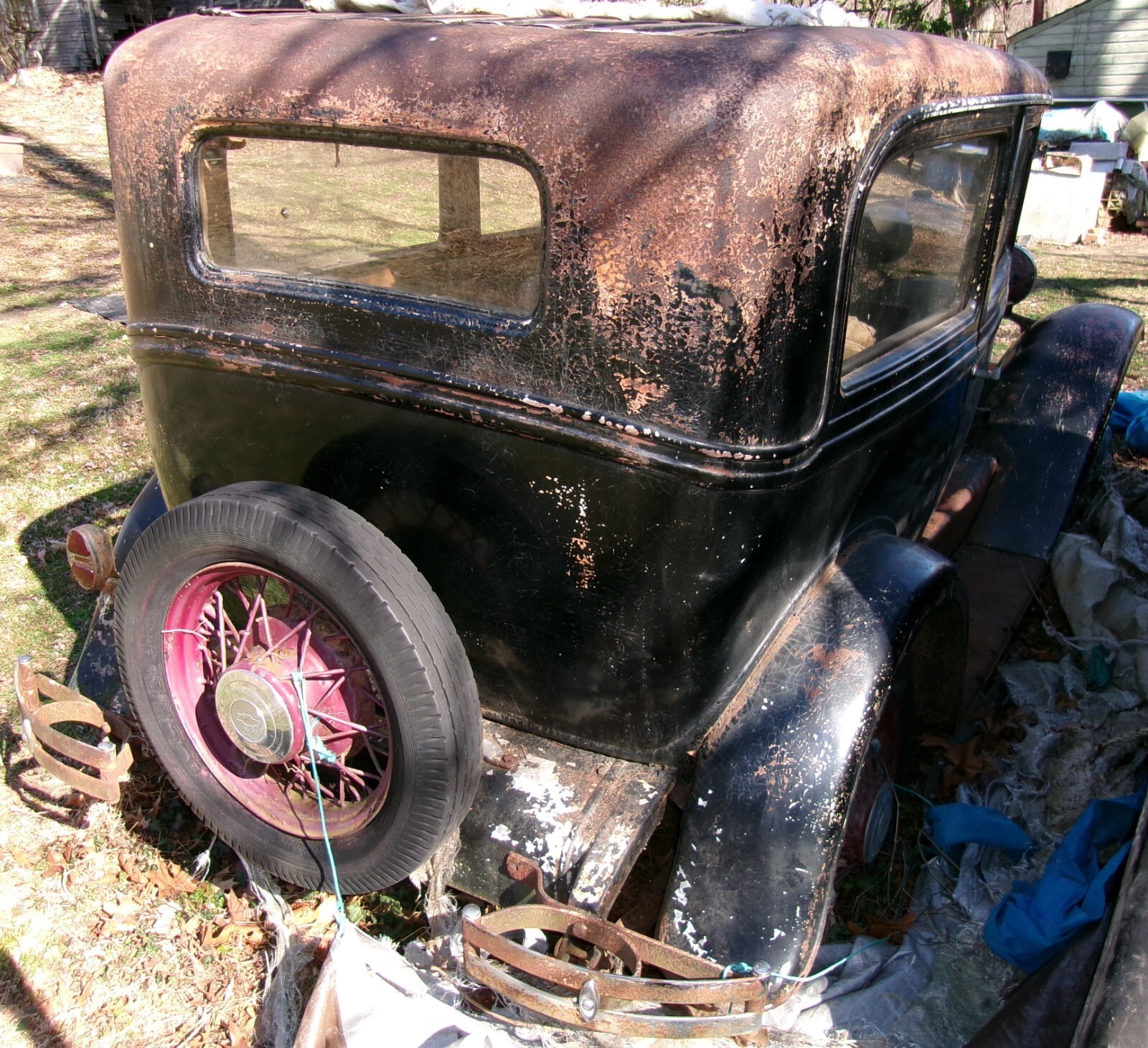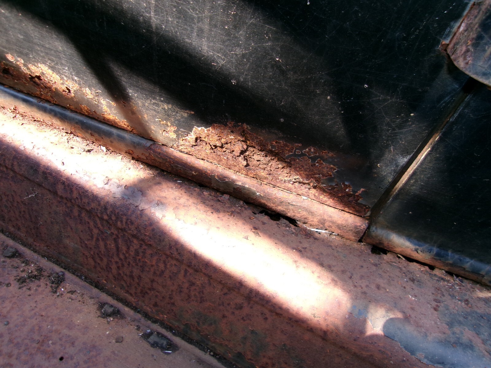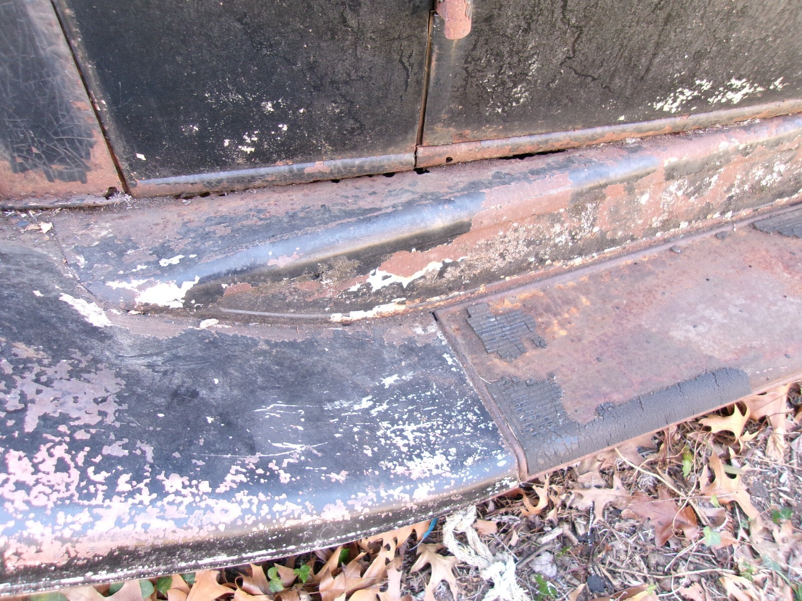 The roof is heavily pitted, and the rear section (above the rear window) is rusted through from the tarp that was on it. The hood is seized. Door bottoms, bottom of cowl, and the splash aprons/running boards are rusted through. Most, if not all, of the wood will have to be replaced.
