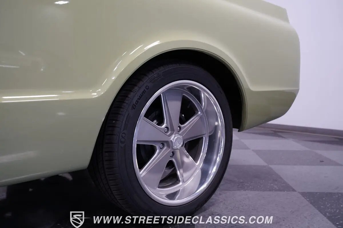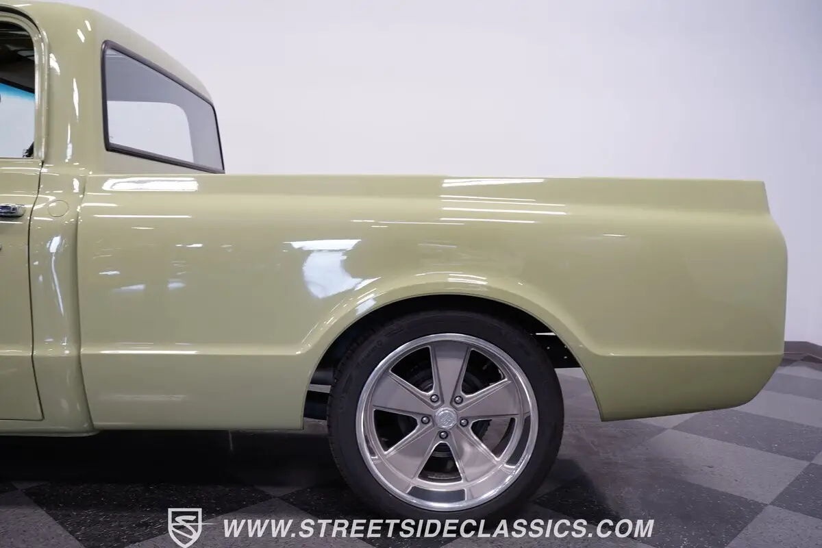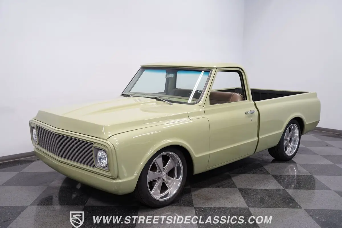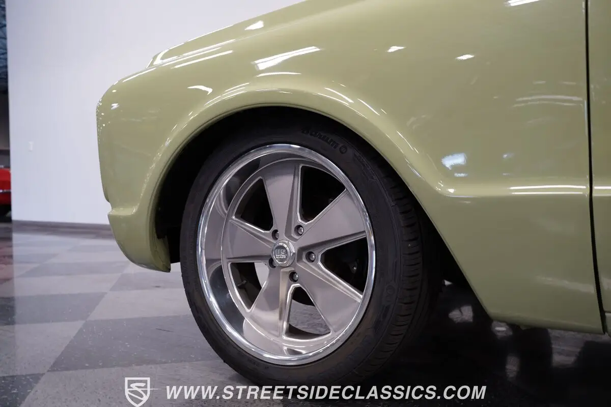 Monochromatic magnificence defines this 1971 Chevrolet C10, finished in a clean non-metallic green that amplifies its lowered, aggressive stance. A custom steel cowl induction hood tops this truck's straight body, complemented by a molded steel front panel replacing the traditional chrome bumper. US Mags 20" wheels fill the wheel wells perfectly, wrapped in Bravirius tires (245/45R20 front, 275/45R20 rear) for a balanced look. The tailgate has been welded shut, while the bed received a durable Rhino coating for maximum utility and clean appearance. Aftermarket headlights and a custom grill complete this C10's modernized exterior aesthetic.