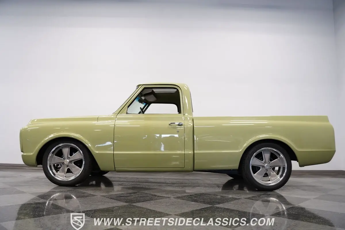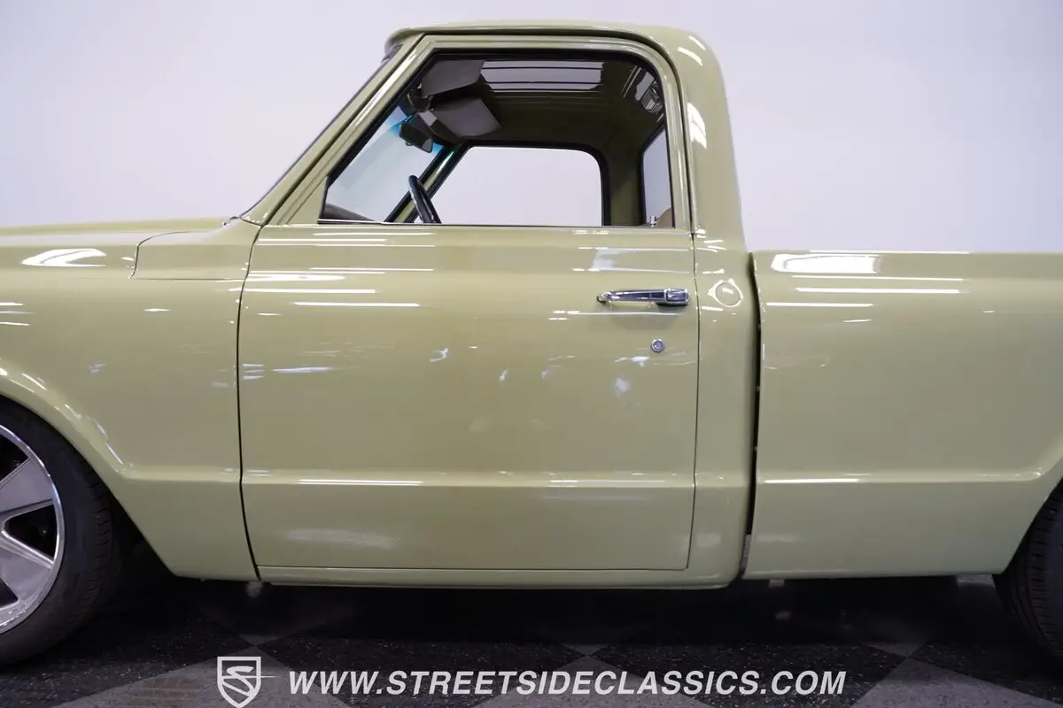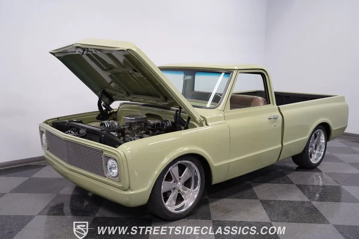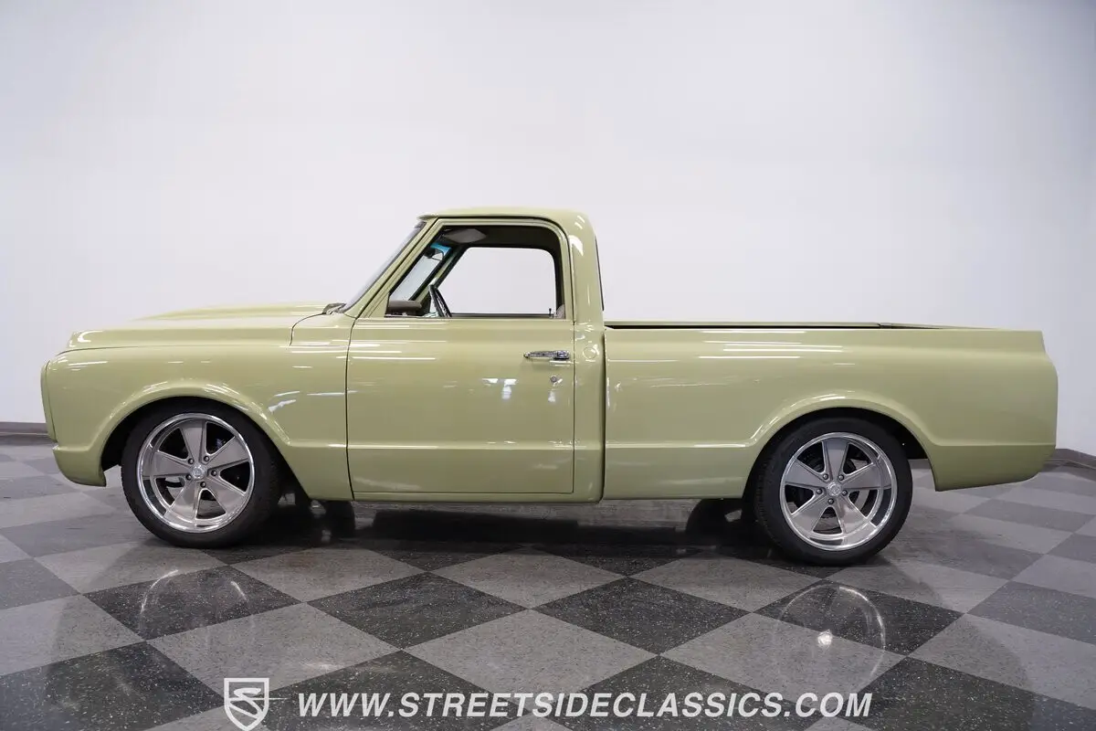 Monochromatic magnificence defines this 1971 Chevrolet C10, finished in a clean non-metallic green that amplifies its lowered, aggressive stance. A custom steel cowl induction hood tops this truck's straight body, complemented by a molded steel front panel replacing the traditional chrome bumper. US Mags 20" wheels fill the wheel wells perfectly, wrapped in Bravirius tires (245/45R20 front, 275/45R20 rear) for a balanced look. The tailgate has been welded shut, while the bed received a durable Rhino coating for maximum utility and clean appearance. Aftermarket headlights and a custom grill complete this C10's modernized exterior aesthetic.