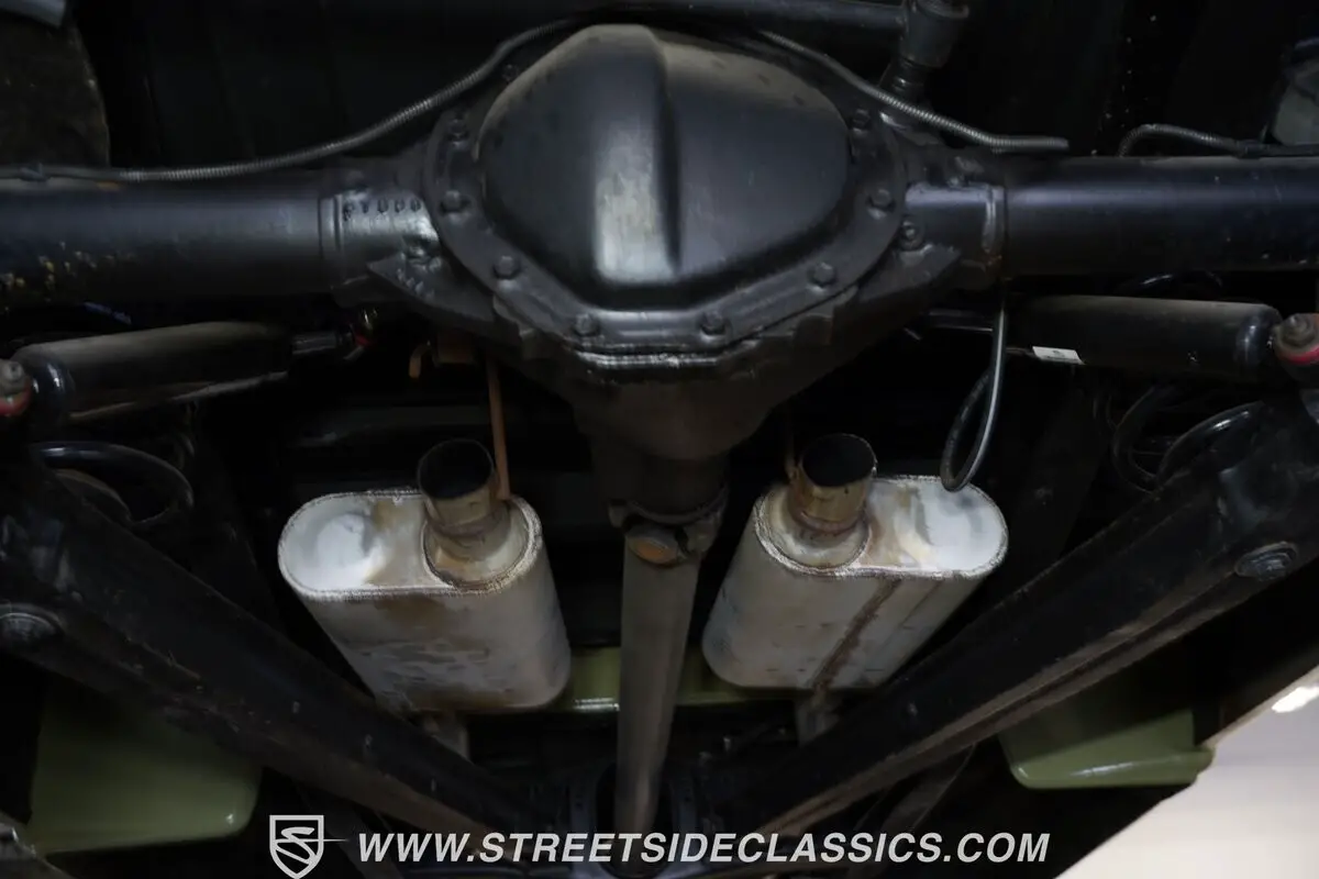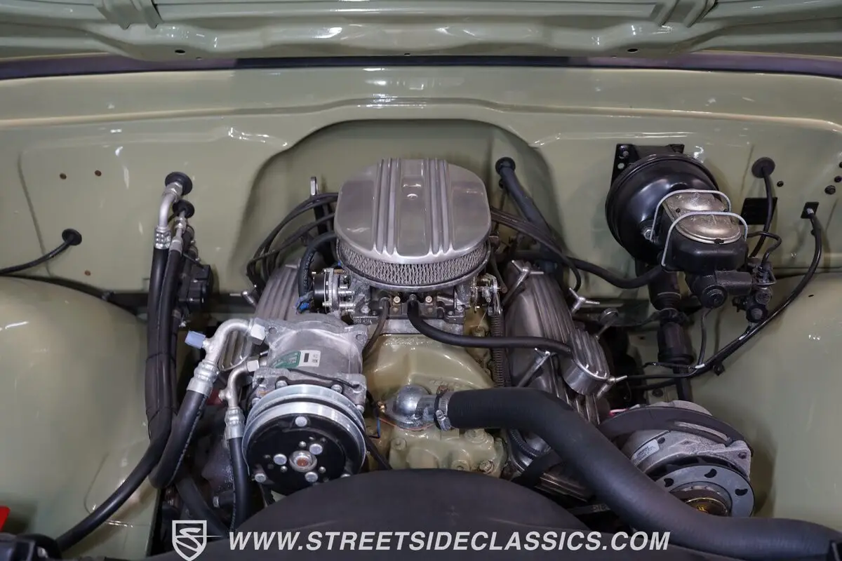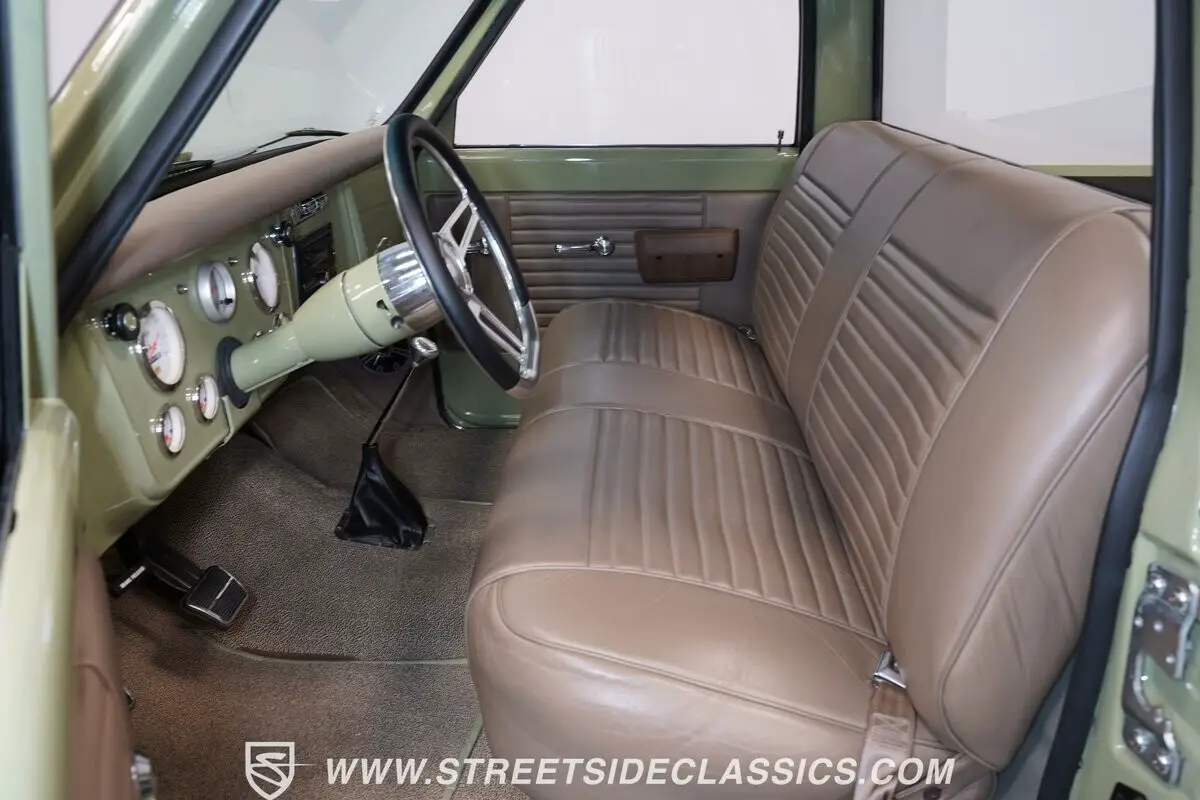 Tan vinyl wraps the comfortable bench seat of this C10's meticulously crafted interior. The dash pad and door panels utilize matching materials for a cohesive look, while the instrument panel and dash wear the same green as the exterior. New RPC gauges monitor vital functions, and a working clock adds functionality. Air conditioning vents and controls integrate seamlessly into the dash design. Entertainment comes via a Kenwood CD radio with Bluetooth microphone mounted to the steering column. Like-new carpet covers the floor, and a Lokar shifter rises from the transmission tunnel for precise gear selection.