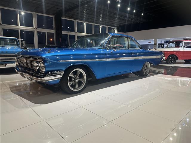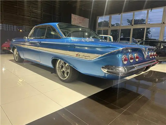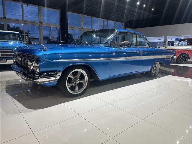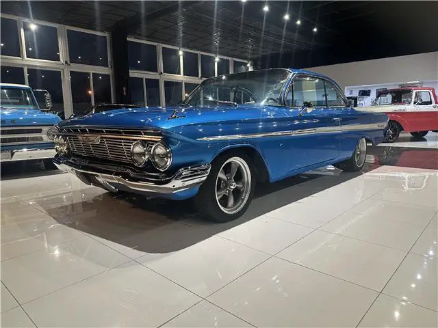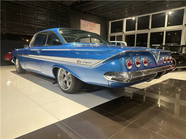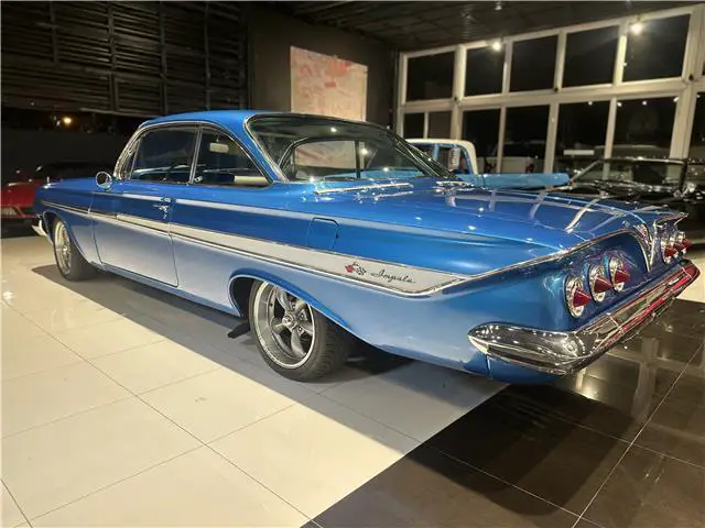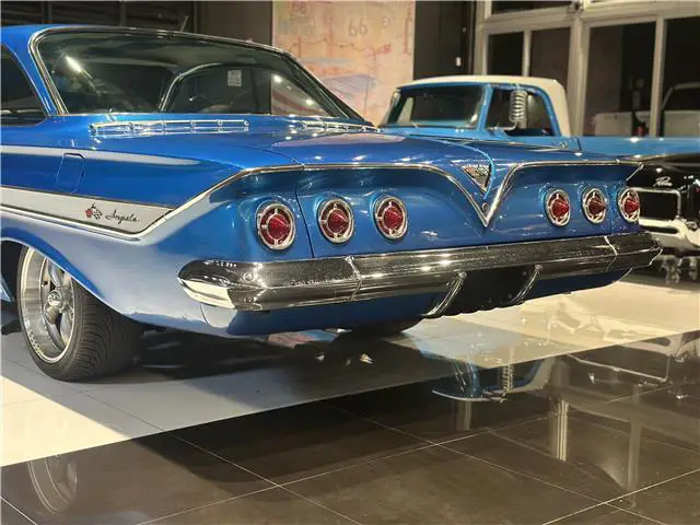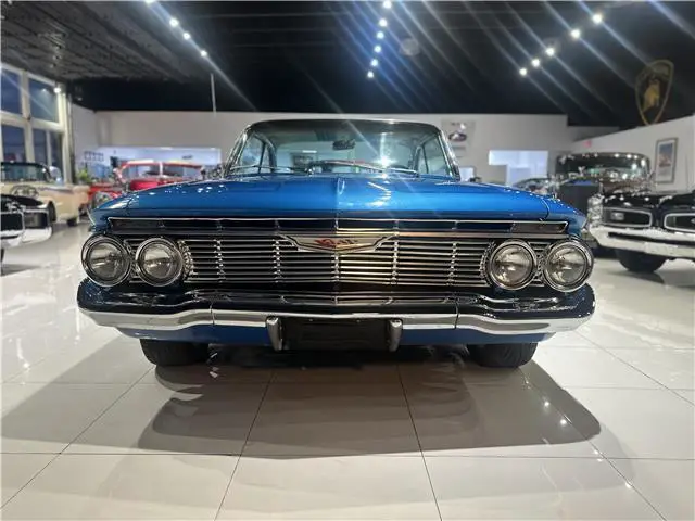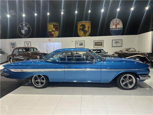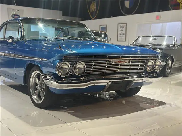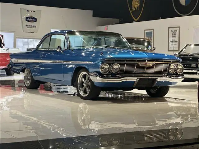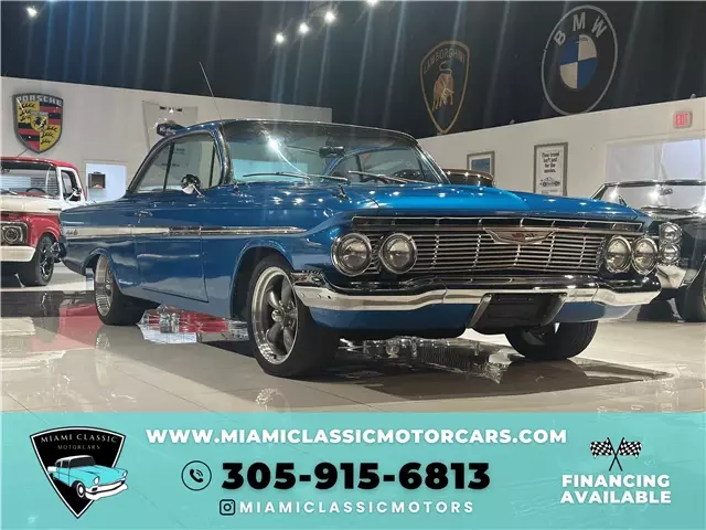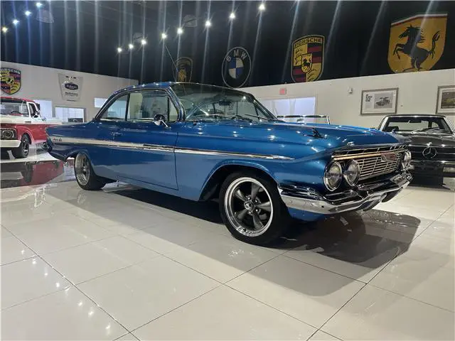 This 1961 Chevrolet Impala Bubble Top Coupe is powered by a 454 cid V8 paired with an automatic transmission. Finished in Oriental Blue over a matching blue and white interior, the car features power steering, front disc brakes, chrome accents, a custom Chevy-logo side-pipe exhaust and the signature Bubble Top.