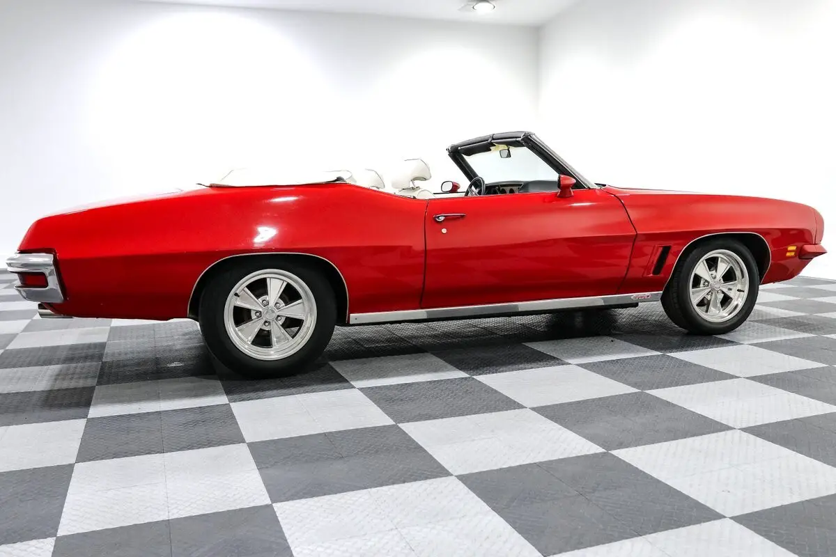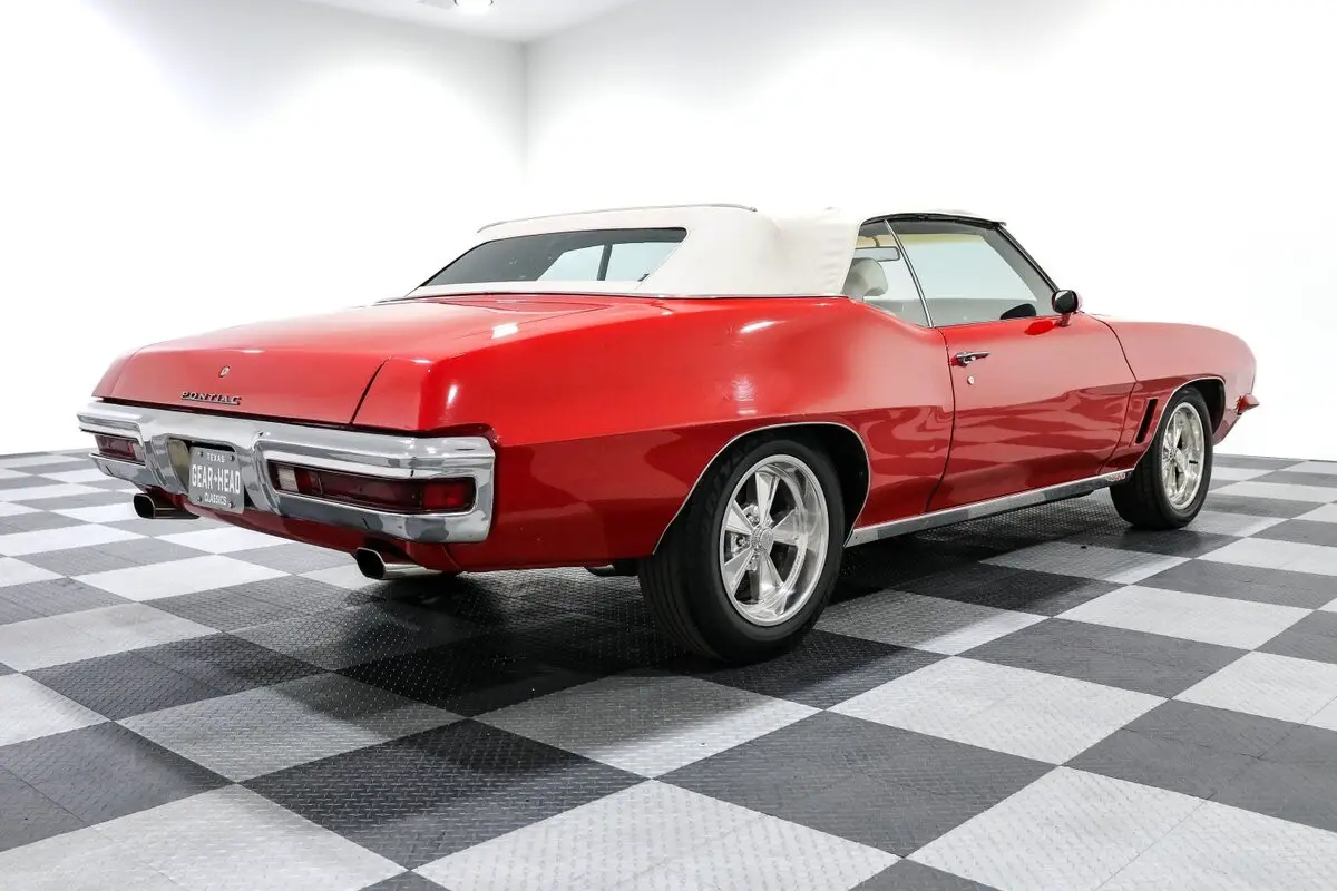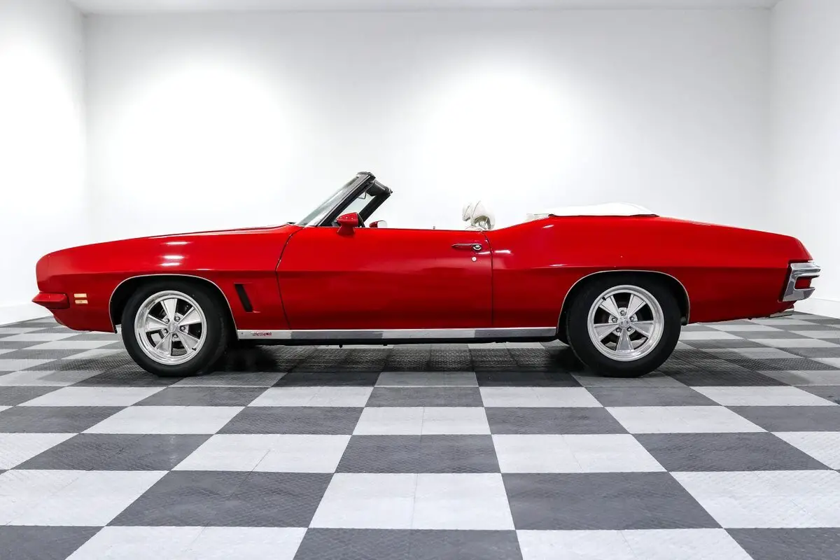 Pontiac's engineering focus on balance shows here too. Power steering and front disc brakes make handling precise, while the dual exhaust lets the small-block V8 bark with authority. The power convertible top drops to reveal a white vinyl bucket seat interior, clean and ready for weekend cruises or local shows. Every touch inside feels like a callback to a time when cars had character, chrome, and confidence.