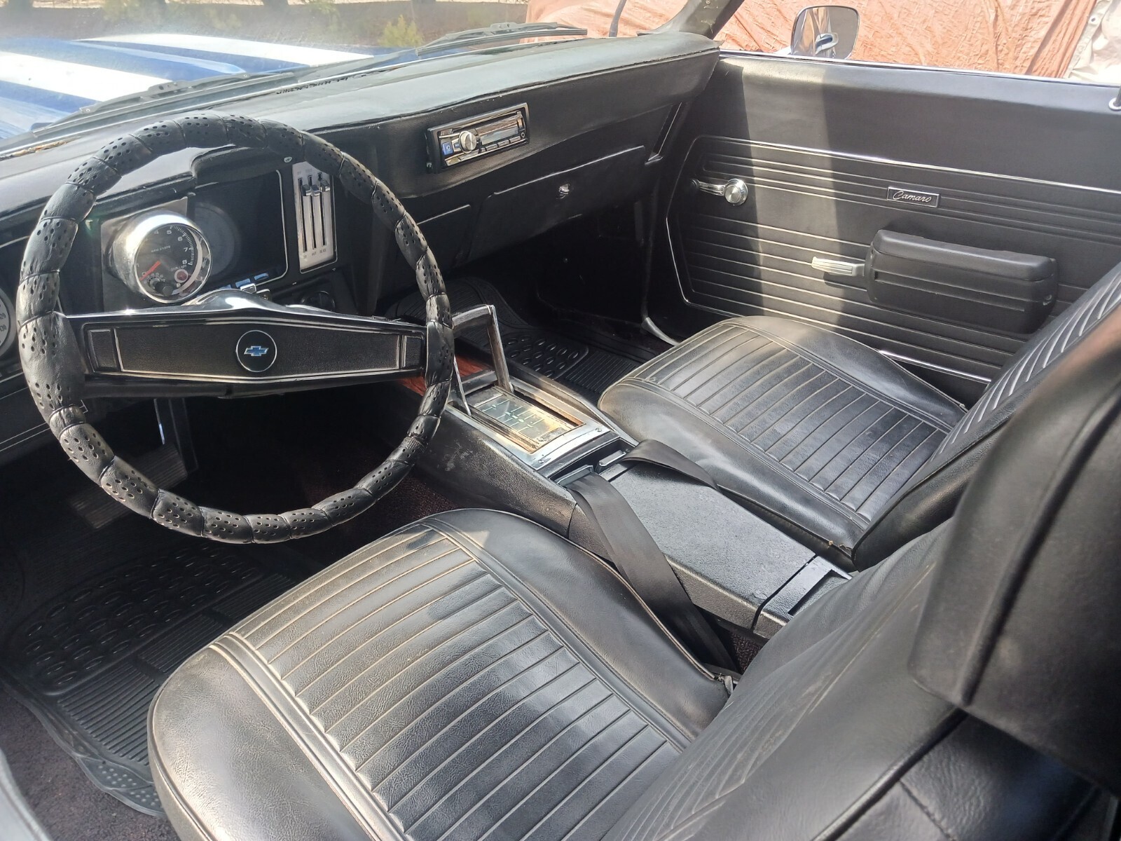 Interior looks GREAT. NEW door panels, NEW armrests, NEW headliner, dash pad looks ok with cutout for aftermarket radio. Carpet in good shape, just older. Seats look good, couple small rips in them but hard to see. Overall good driver quality interior.