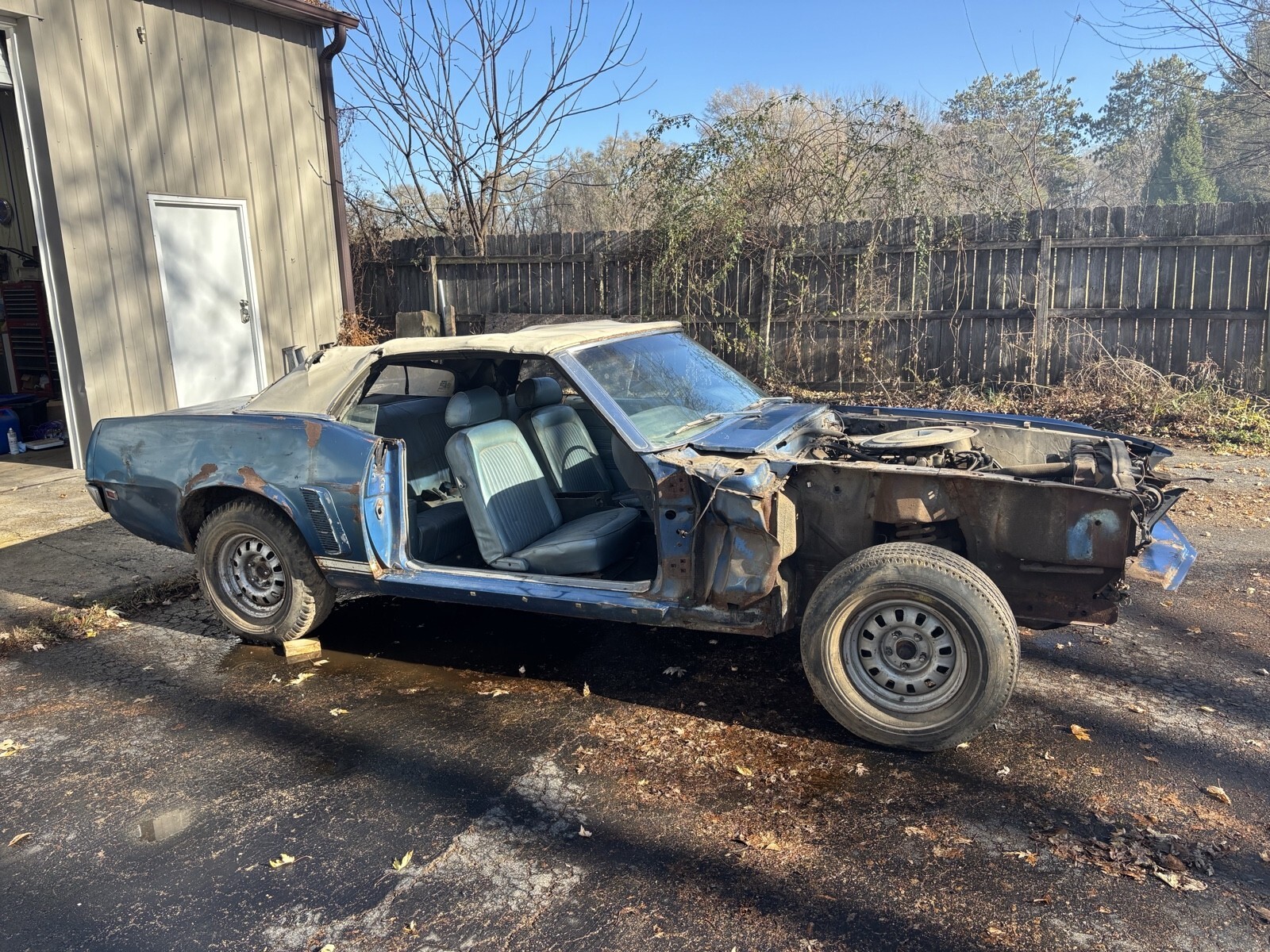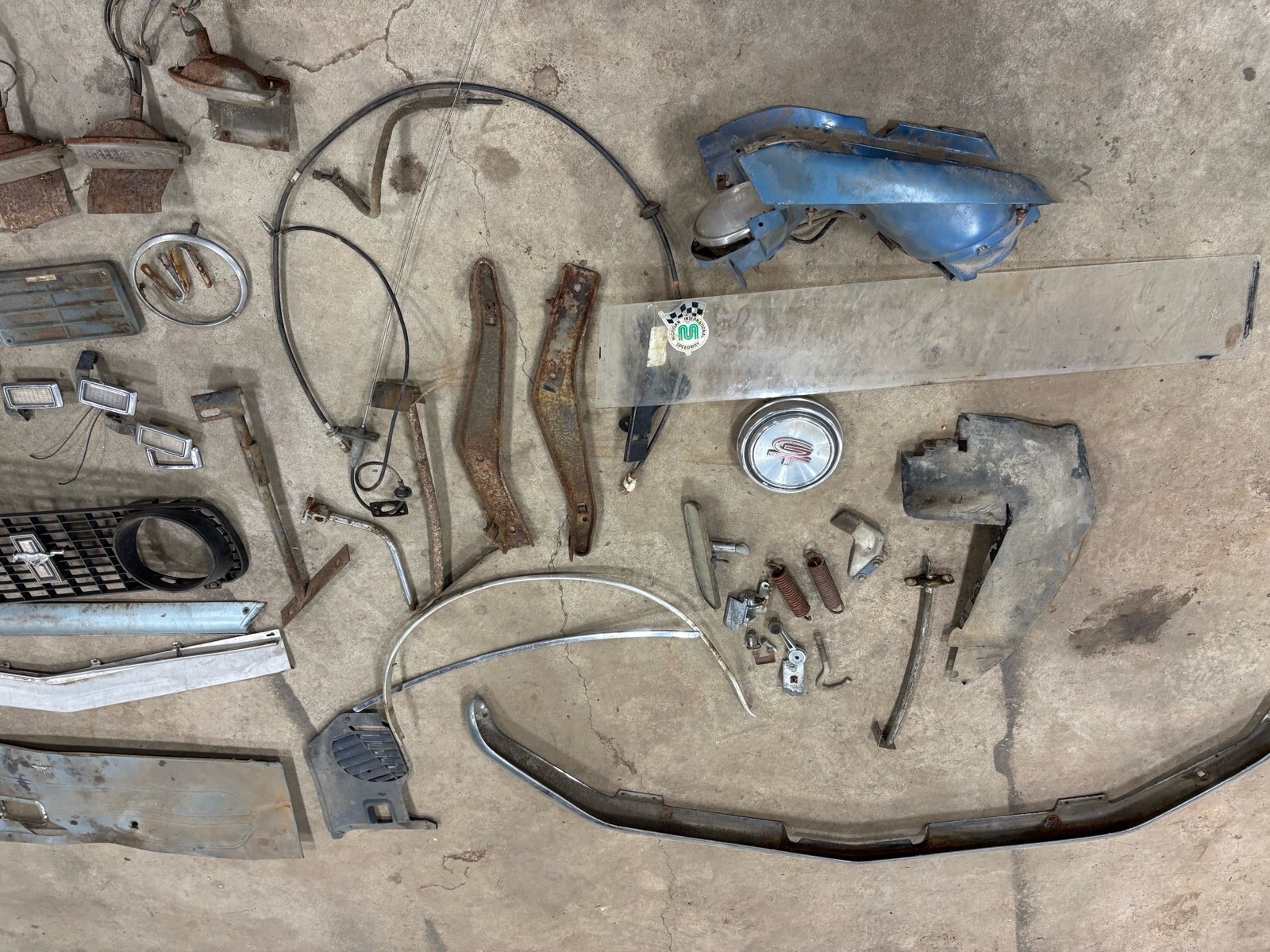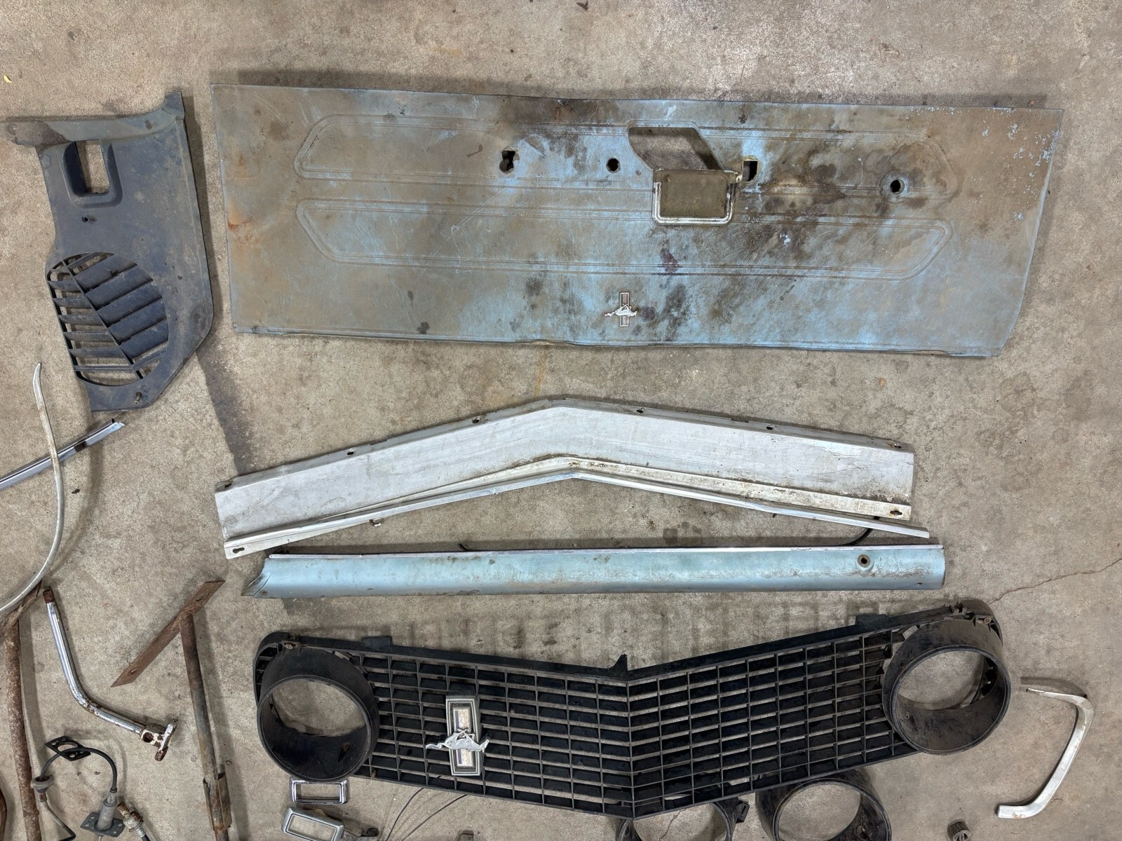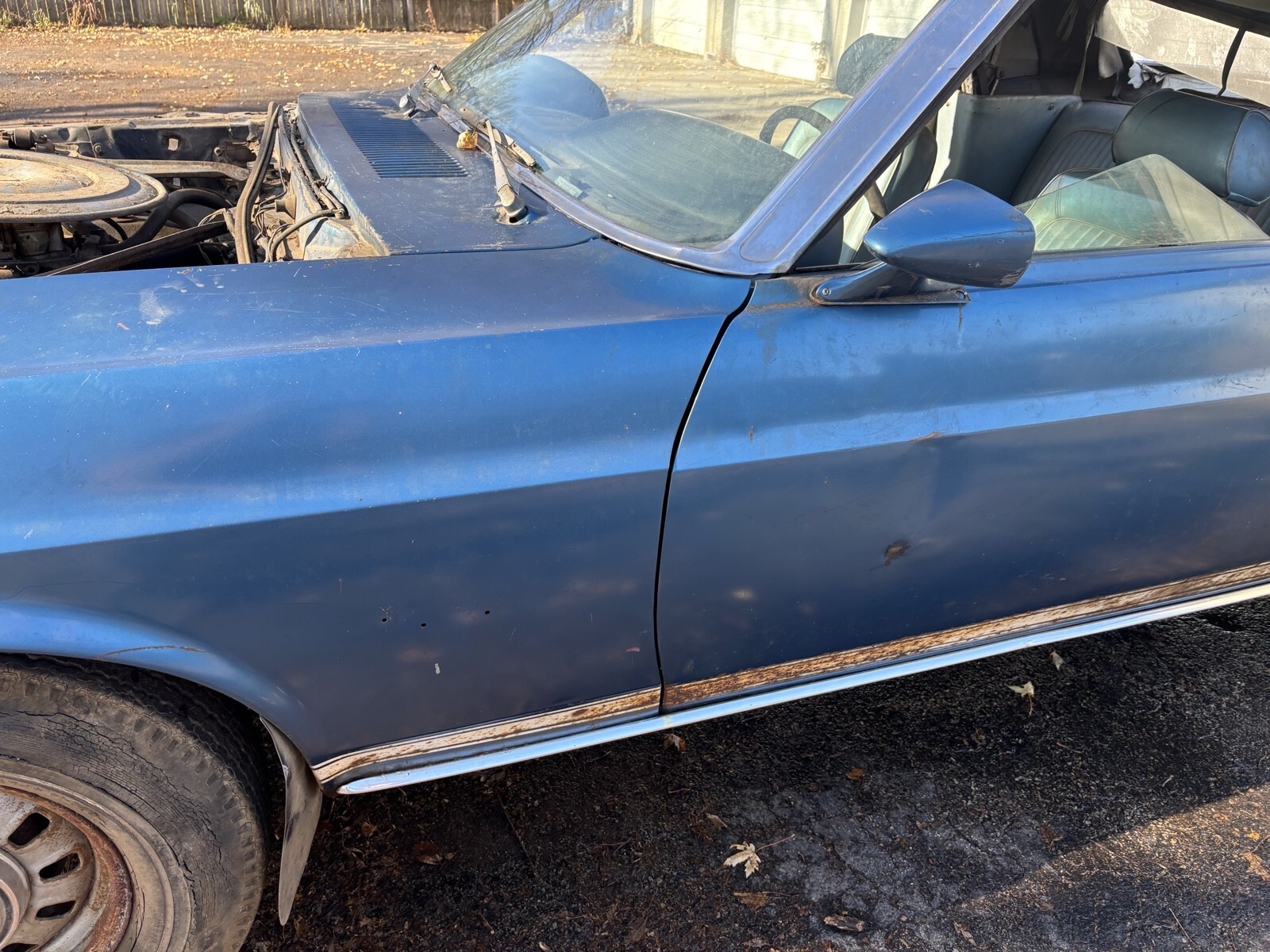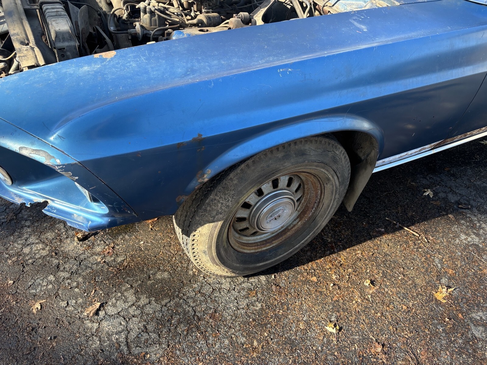 My dad bought this car in the current condition in 1980. He never got around to this one. This is a 69 gt convertible with a 390 and a 4 speed. Hit in the rear and the right front. The passenger side cowl and door hinge post are bent. I do not have the passenger side fender, door, tail lights, front pan or rear pan. Something fell on the roof over 20 years ago, looks like the convertible top supports need to be straightened. Brake drums have been removed so the car rolls. The engine does not turn over. Vin 9f03s……. 9 for 69 model year, f is the Dearborn plant, 03 is a 2 door convertible and s engine code for a 390. Door tag has 76a for a 2 door convertible with standard bucket seats, color code 6 for Acapulco blue, 2b trim is light blue Corinthian vinyl and light blue kiwi grain vinyl, 10b is a build date of February 10th, dso 56 is Davenport Iowa, r axle code is a 3.25 limited slip 9 inch and trans code 5 is for a 4 speed manual. Car needs quarters, all floors, probably all torque boxes, the right rear frame rail has a visible rust hole. Front frame rails and rockers look to be savable and maybe the left rear frame rail. The convertible seat reinforcements look like they can be saved as well. The door and fender could be patched up but I would buy new and the deck lid has some rust along the edge. The hood isn’t bolted on and it looks like the mounts for the hinges are missing, so if you use an open transport, the hood needs to be strapped down. I trailered it on an open trailer from the storage location to my home, it was fine. This has to be a somewhat rare combo, there were not that many big block convertibles, let alone 4 speed big block gt convertibles.
