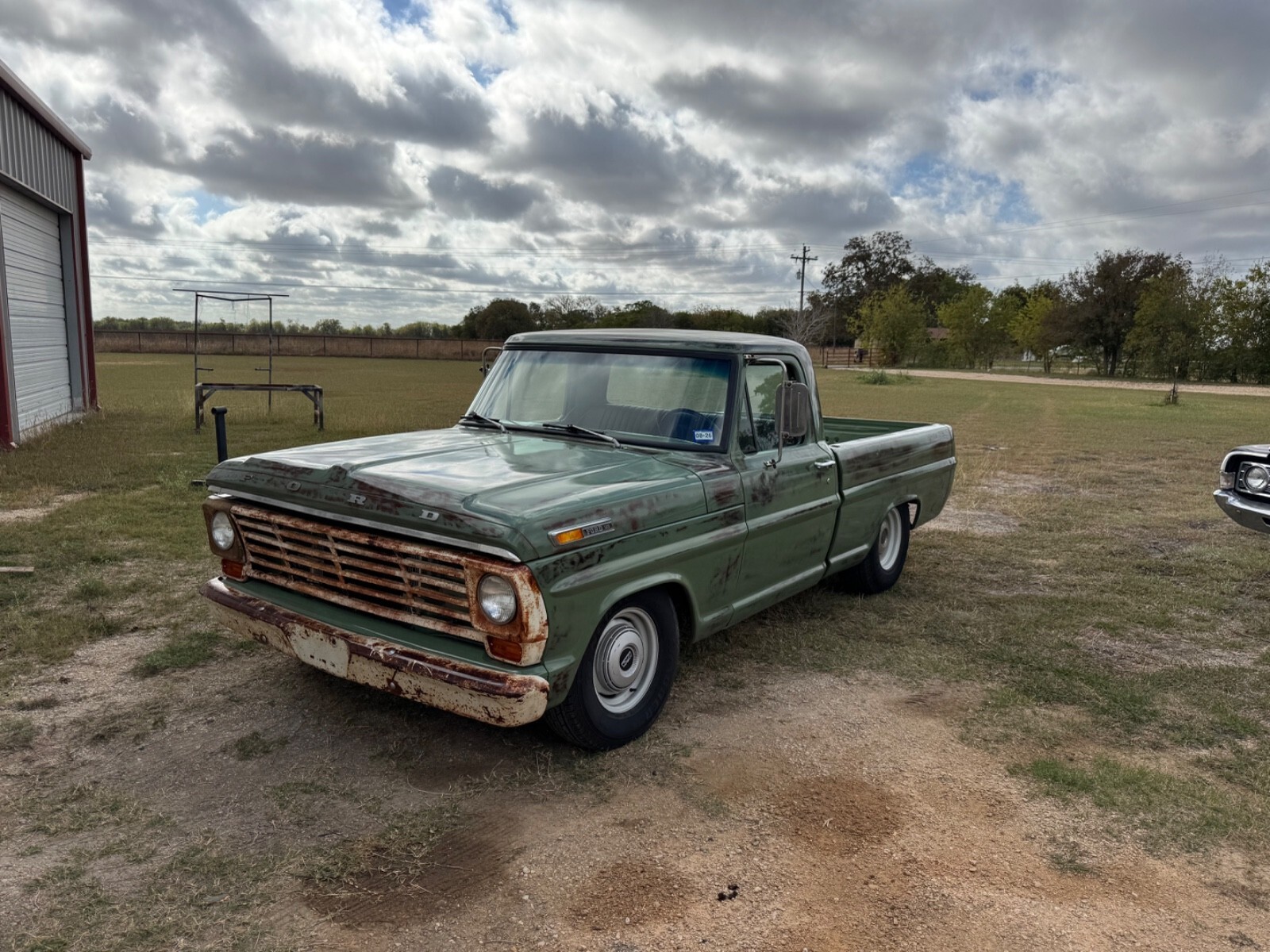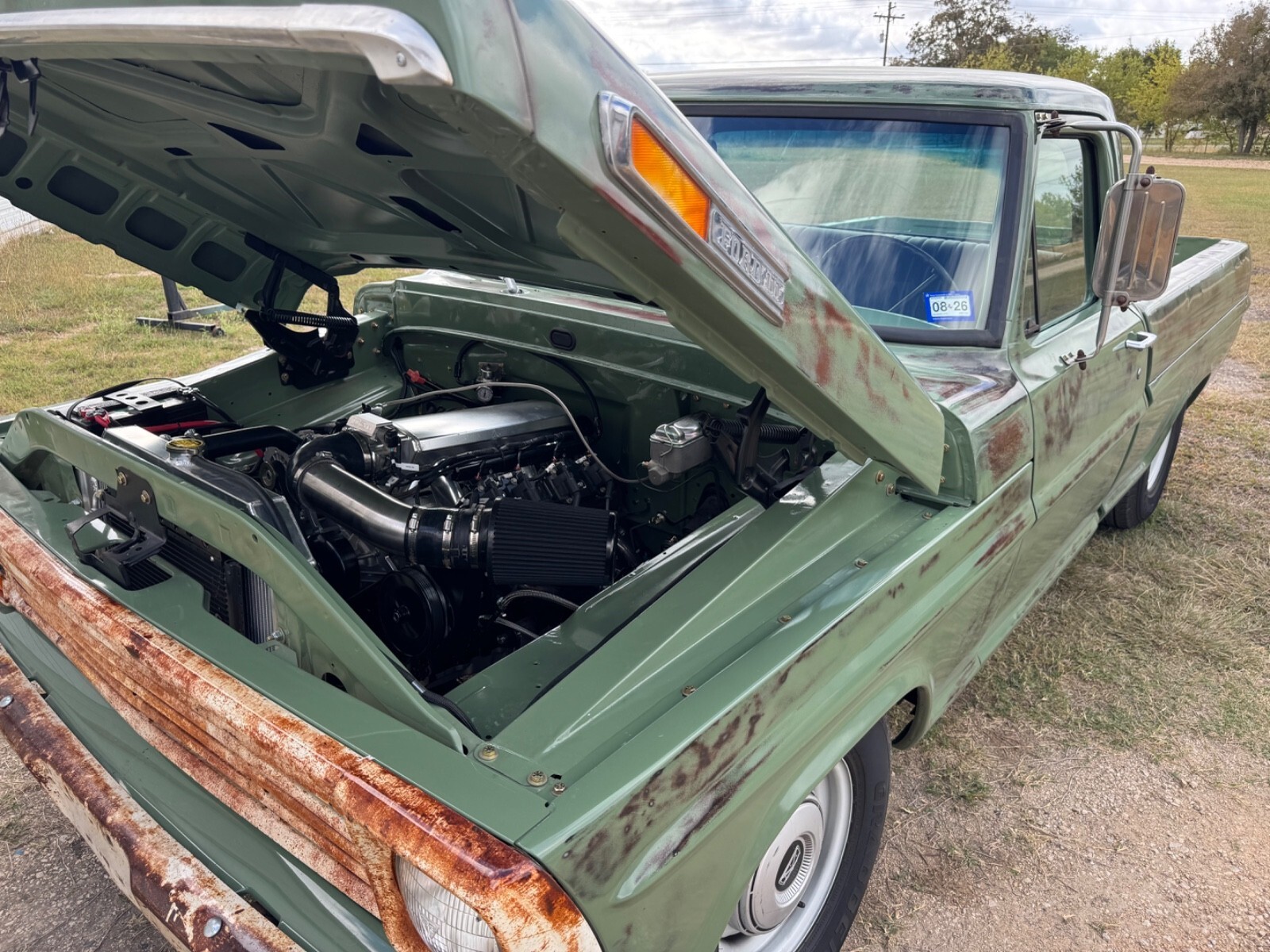 “Ranch water” is a 1969 ford f100 restomod. This truck began life as a nice two owner long bed. Most the sheetmetal was blasted clean, to make room for the boxwood patina paint work. Frame was shortened and tig welded to convert from long to short bed. Bed is an uncut shortbed we had from previous build. Truck features brand new 3 yr warranty 5.3 liter engine and fresh 4L60 4 speed automatic and stainless exhaust. Texas speed supplied the harness and summit racing supplies the sheetmetal intake. DJM lowering beams and axle flip got this farm trucks stance on point. CPP front disc brakes handle the stopping power. Brand new wheel vintiques steel wheels, general tires and factory caps keep the sleeper look. Brand new steering box, nostalgia air ac, refinished seat, new vintage gauge cluster, modern wiring, aluminum rad and electric fan. Original dealership warranty papers included . Please contact for further information, see YT video. Registered and titledhttps://youtu.be/ep7NpHR0c1Y
