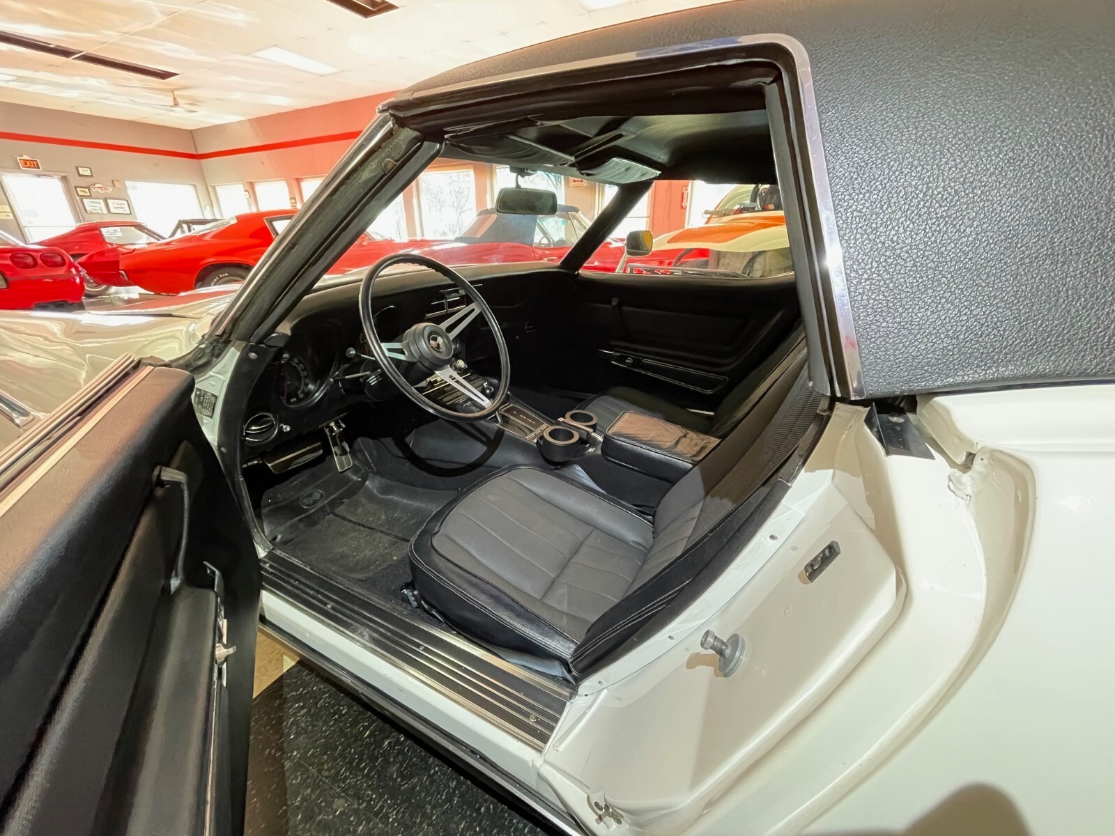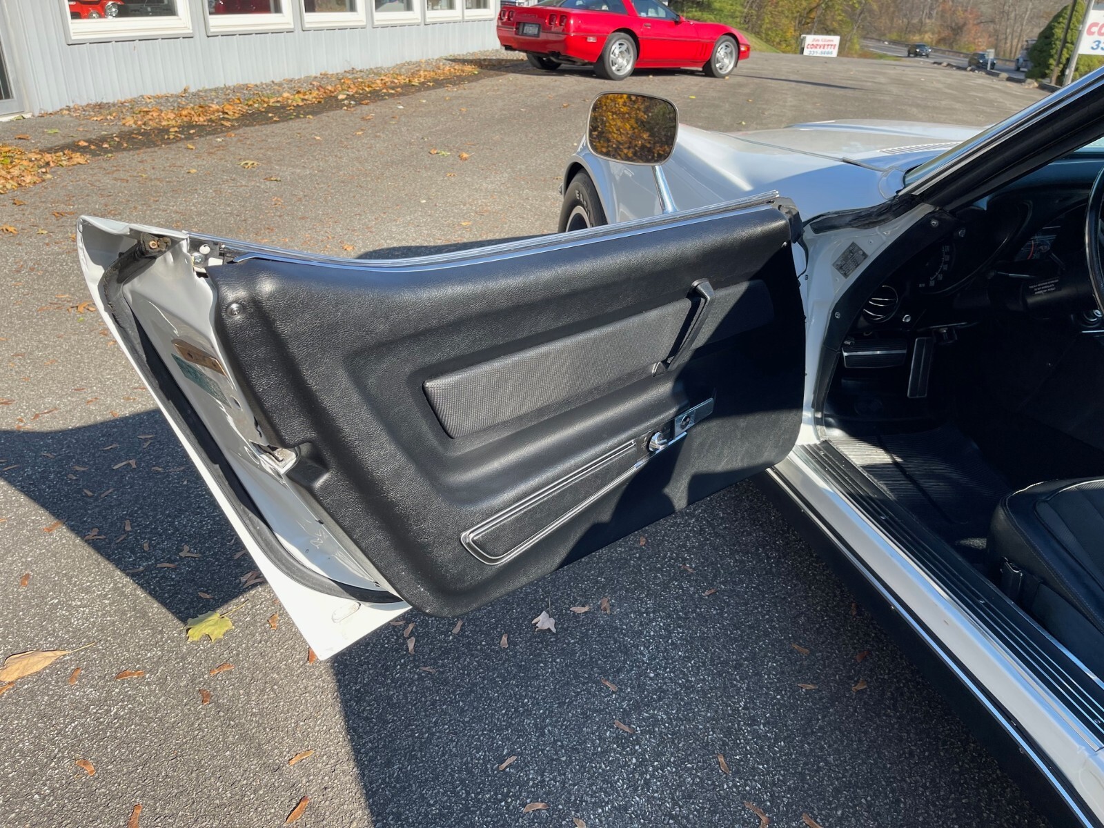The paint and brightwork is in very nice condition as well. Originally Daytona Yellow, this Corvette is now finished in white, retaining its correct black standard vinyl interior. There is a slight tear in the the passenger seat back, as pictured.