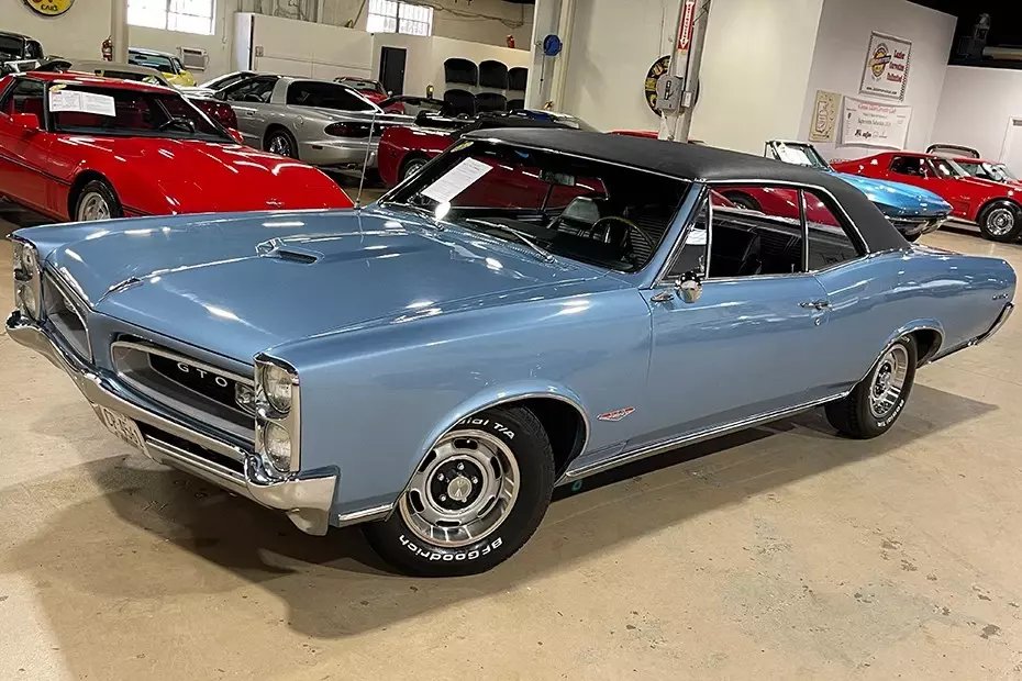 This BODY-OFF RESTORED 1966 GTO is in nice condition, and has been professionally converted to a 4 speed manual with factory style center console. Odometer currently reads 16,935 miles; however, we are unable to document actual miles on this car, so it will be sold as "MILEAGE EXEMPT". This car's paint is in overall good condition, with a good shine. Black vinyl top is vg. Chrome bumpers show a vg finish, and exterior door handles show a good condition finish. Pontiac Rally I wheels are in good condition, with vg trim rings and center caps. BF Goodrich Radial T/A raised white letter tires show an average of 10/32nds tread depth remaining. The interior of this 1966 GTO shows vg seats, center console, dash pad, door panels, and GM seatbelts, and good-vg, carpet. Correct appearing AM radio is in place. 389ci Pontiac engine shows YS suffix. Frame is solid and rust-free. Included with this car will be PHS documentation, and photos of the car before and during the body-off restoration. Call us today to bring home this 4 speed A/C GTO!