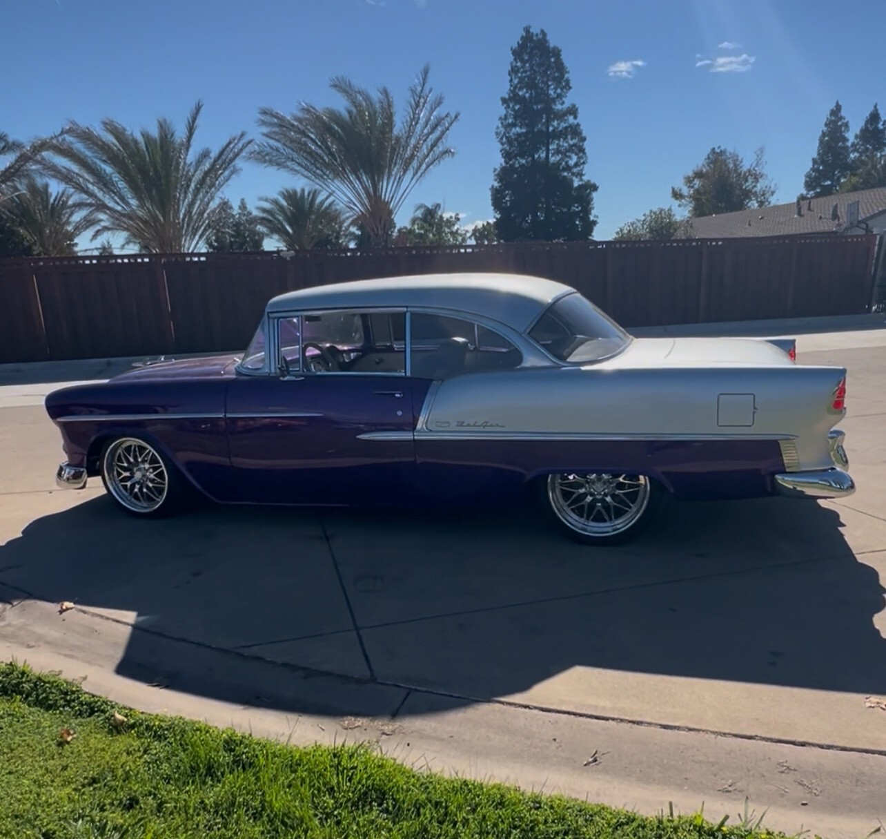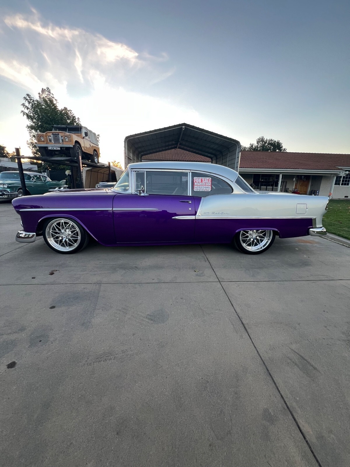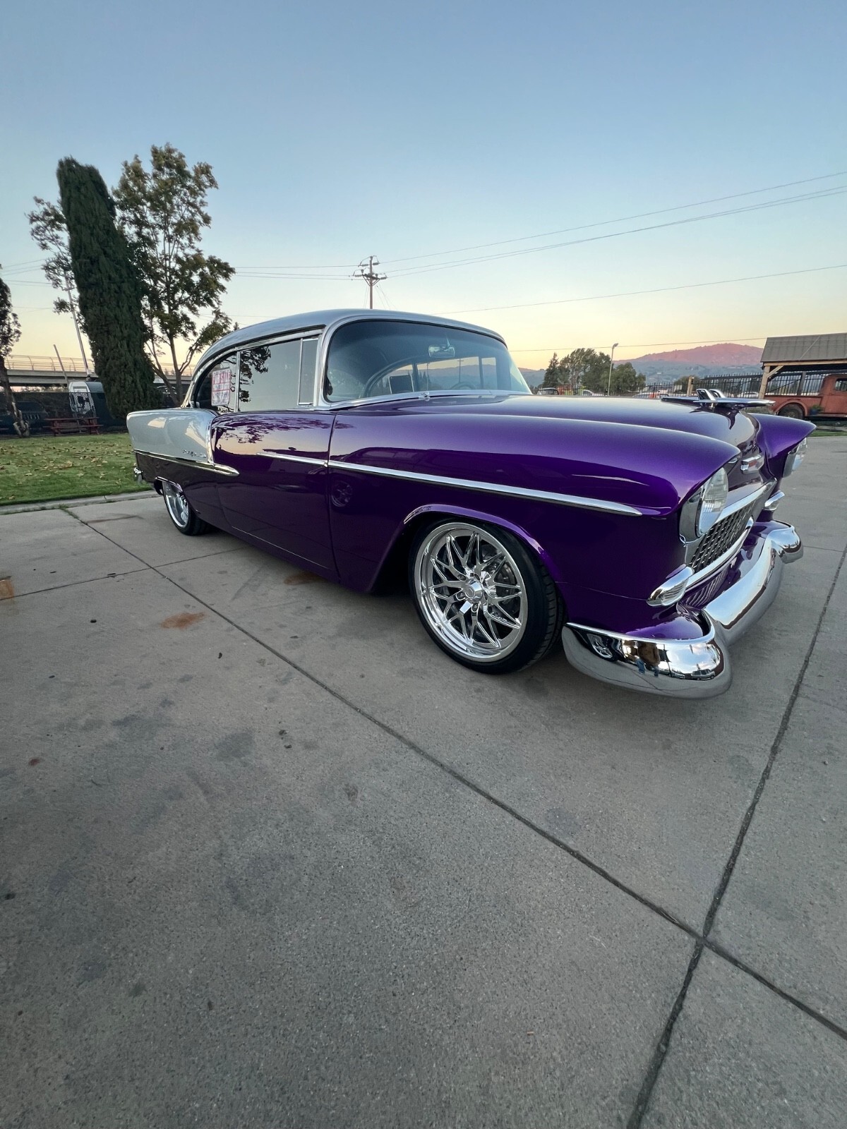 1955 Chevy Bel Air Resto-Mod. House of Kolor Two Tone Paint Passion Purple/Silver White. Restored Factory Bright Work, Chromed Grill & Smoothed Front Bumper, Smoke Tinted Glass, Custom One Off 19”/18” Savini Wheels with Falken Speed Rated Radials.