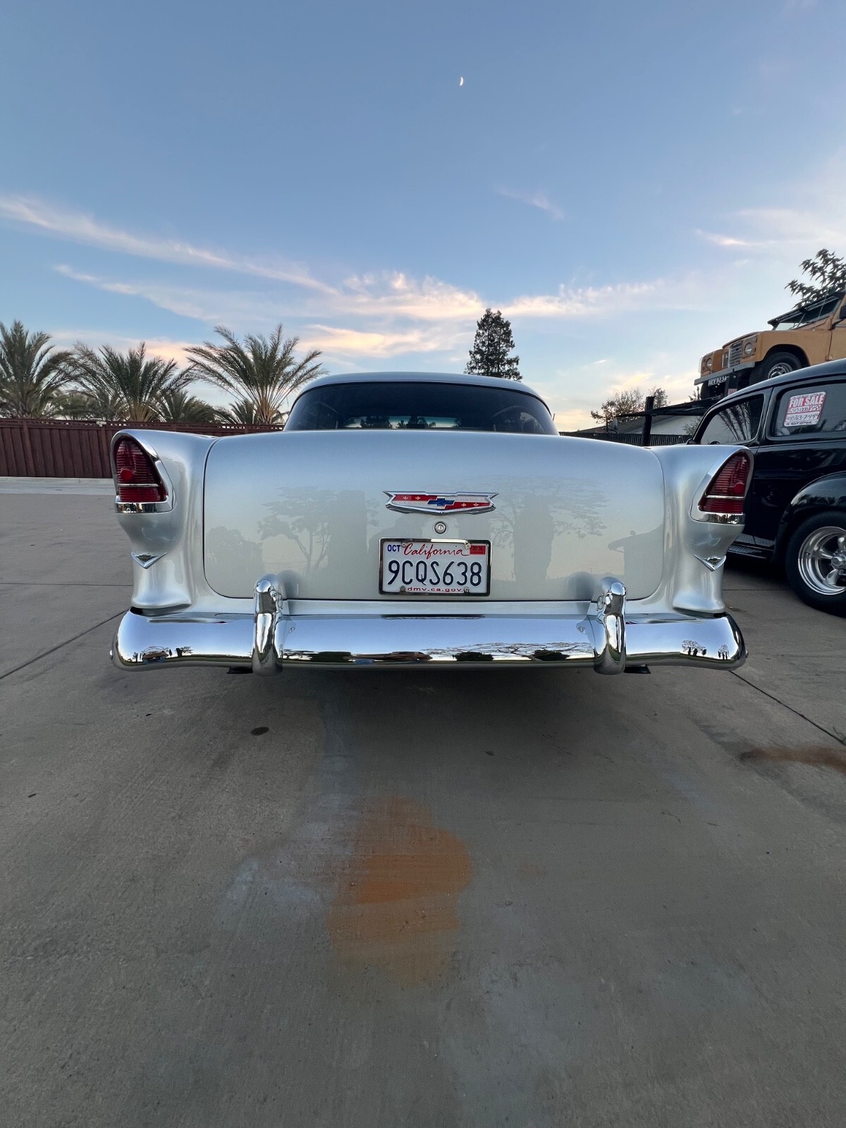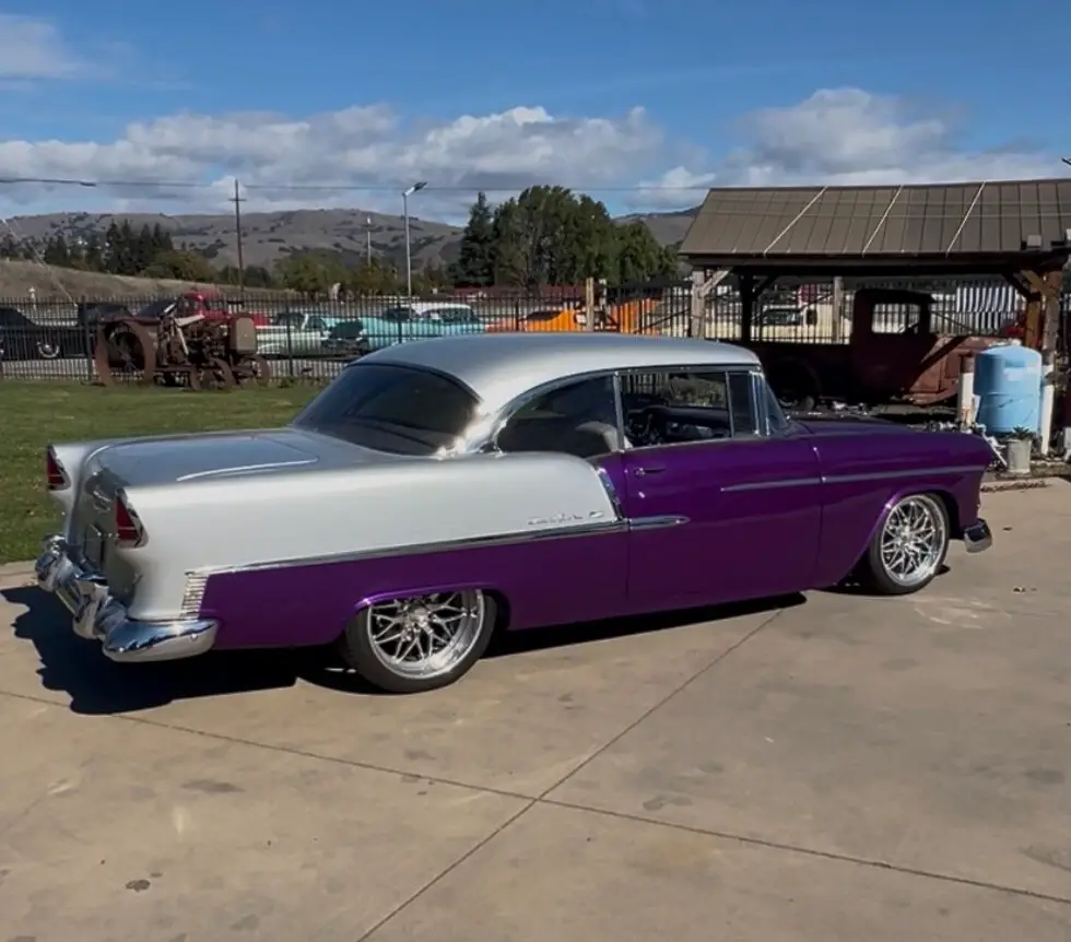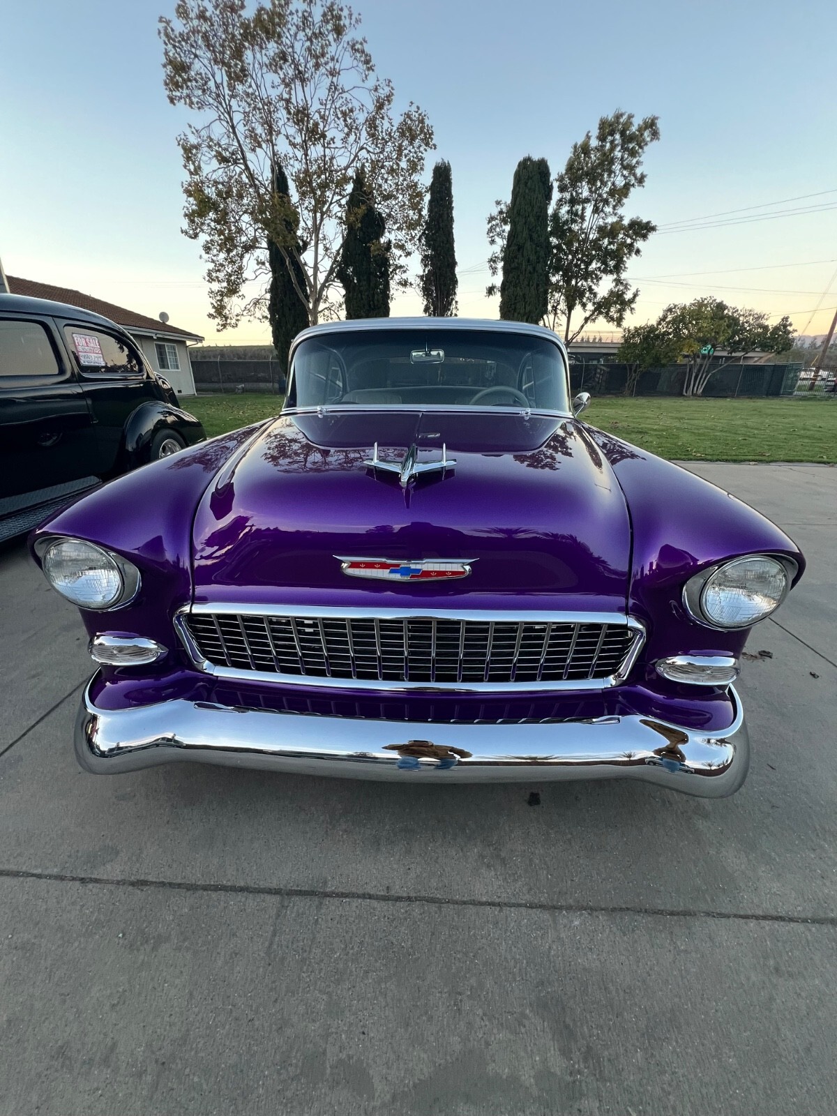 1955 Chevy Bel Air Resto-Mod. House of Kolor Two Tone Paint Passion Purple/Silver White. Restored Factory Bright Work, Chromed Grill & Smoothed Front Bumper, Smoke Tinted Glass, Custom One Off 19”/18” Savini Wheels with Falken Speed Rated Radials.