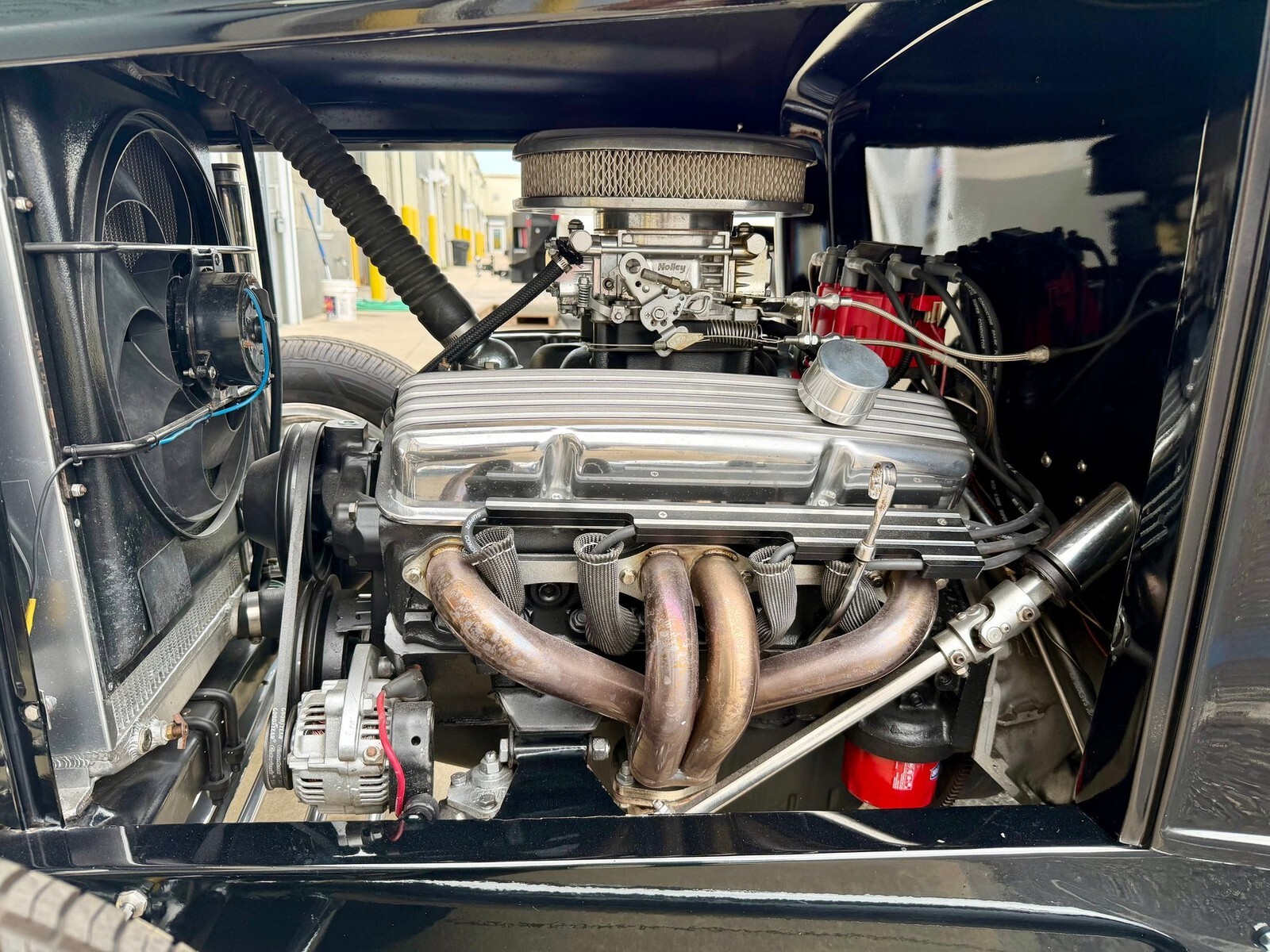 The interior is bright red which brings a nice pop of color against the all black exterior. Stewart Warner gauges sit in a polished bezel in the dash. Tilt steering column, billet pedals, and a classic banjo steering wheel finish off the show quality interior. Under the hood sits a 350 CID V8, that is believed to be stroked to 383 cubic inches, but we do not have documentation on that. It is backed by a smooth shifting 700R4 making this Model A ready to hit the highway and cruise!