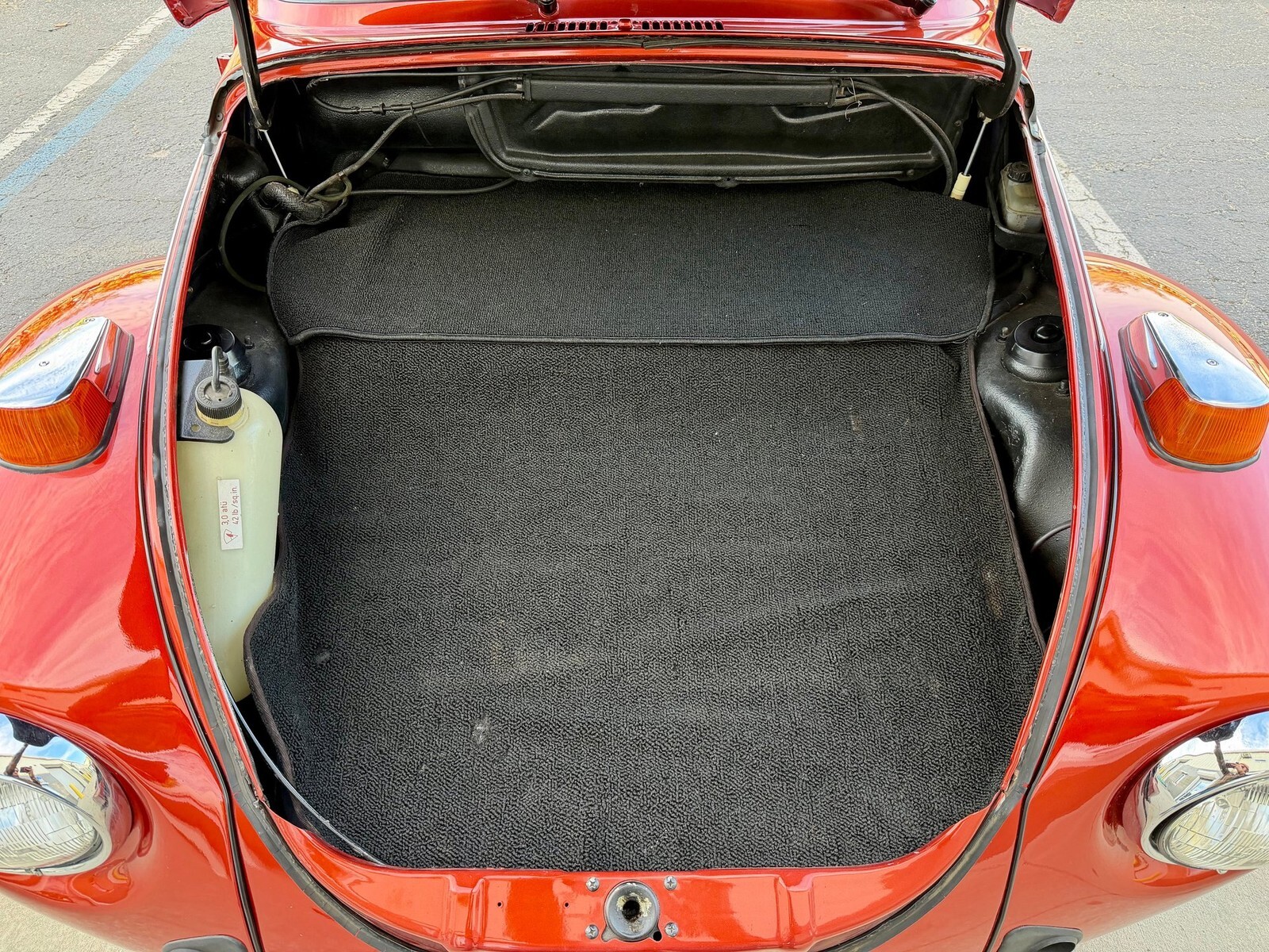The trunk is very clean with a nice carpet mat and the spare tire in place.