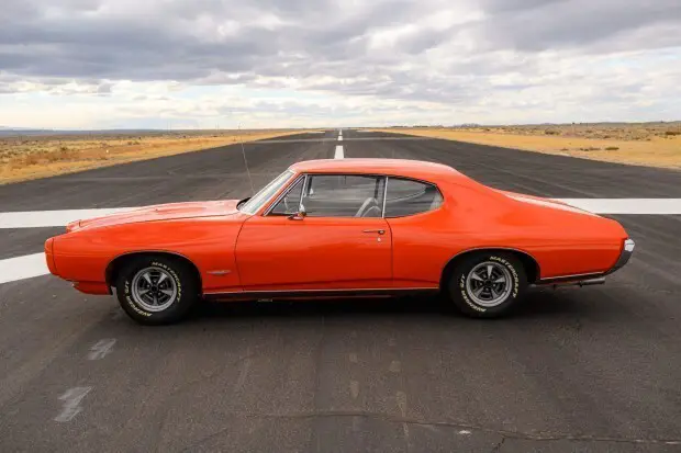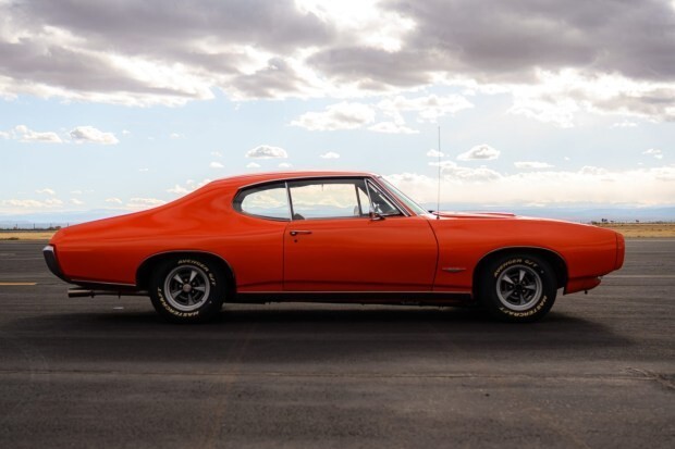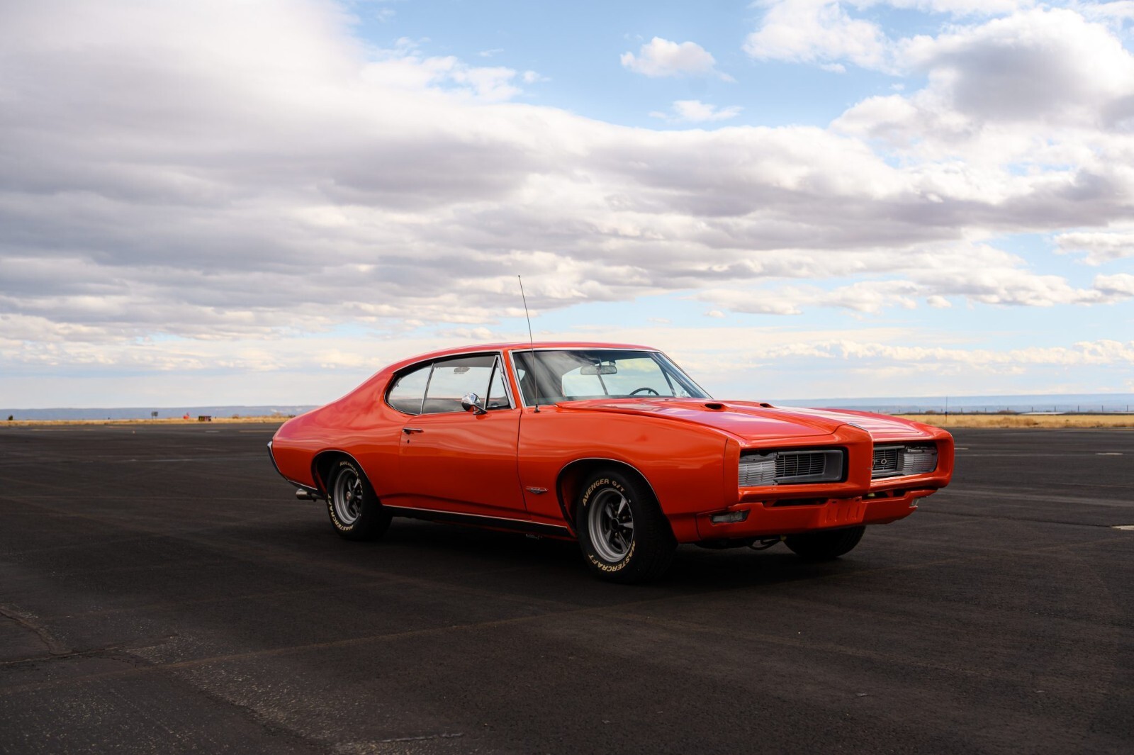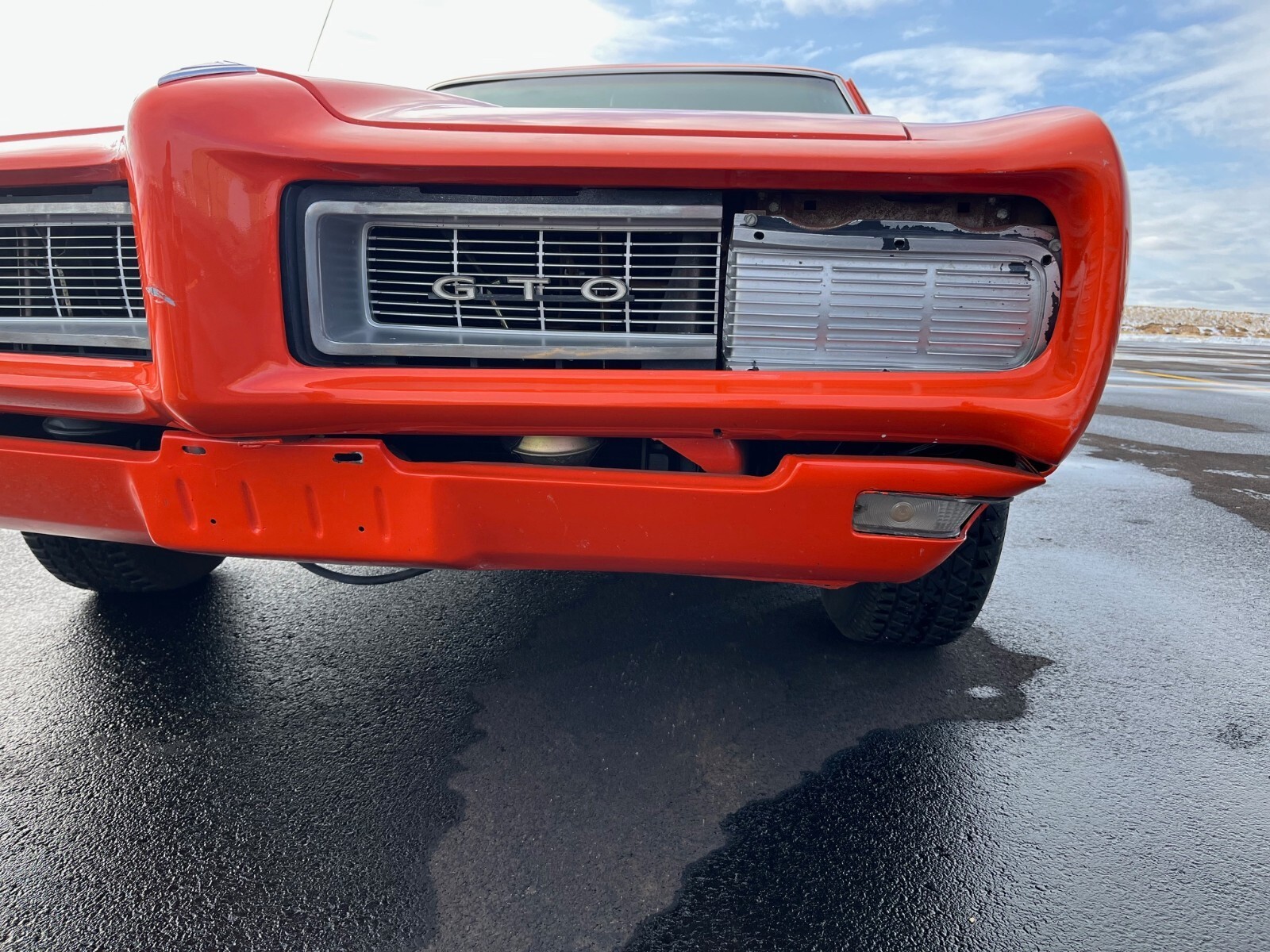 The car was refinished in orange in 2013 following bodywork that involved replacing the fenders and the quarter panels. Exterior details include a bright split front grille, hood scoops, GTO badging, and bright trim. Quad headlights with retractable headlight covers are fitted, but do not work correctly. There is a scrape on the front of the nose, and the hood is misaligned.