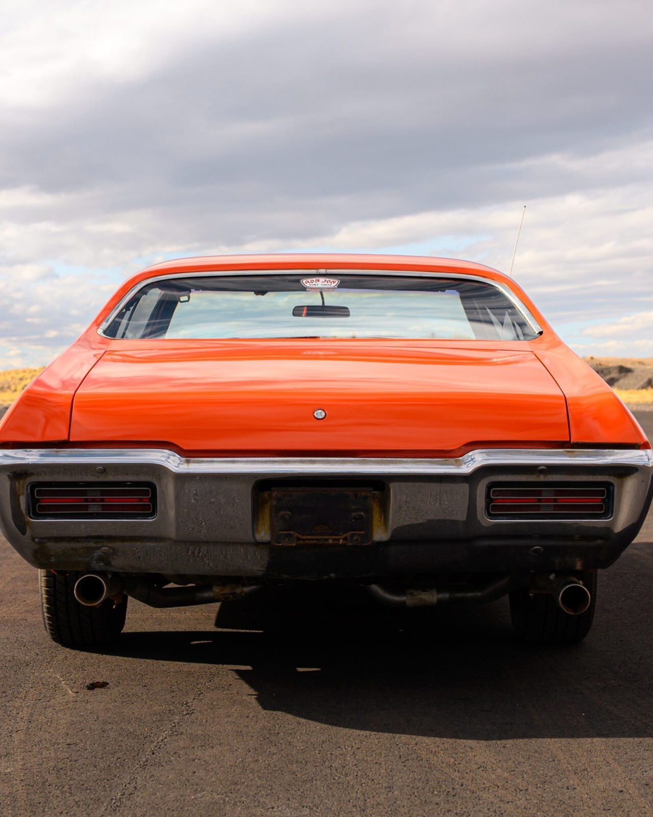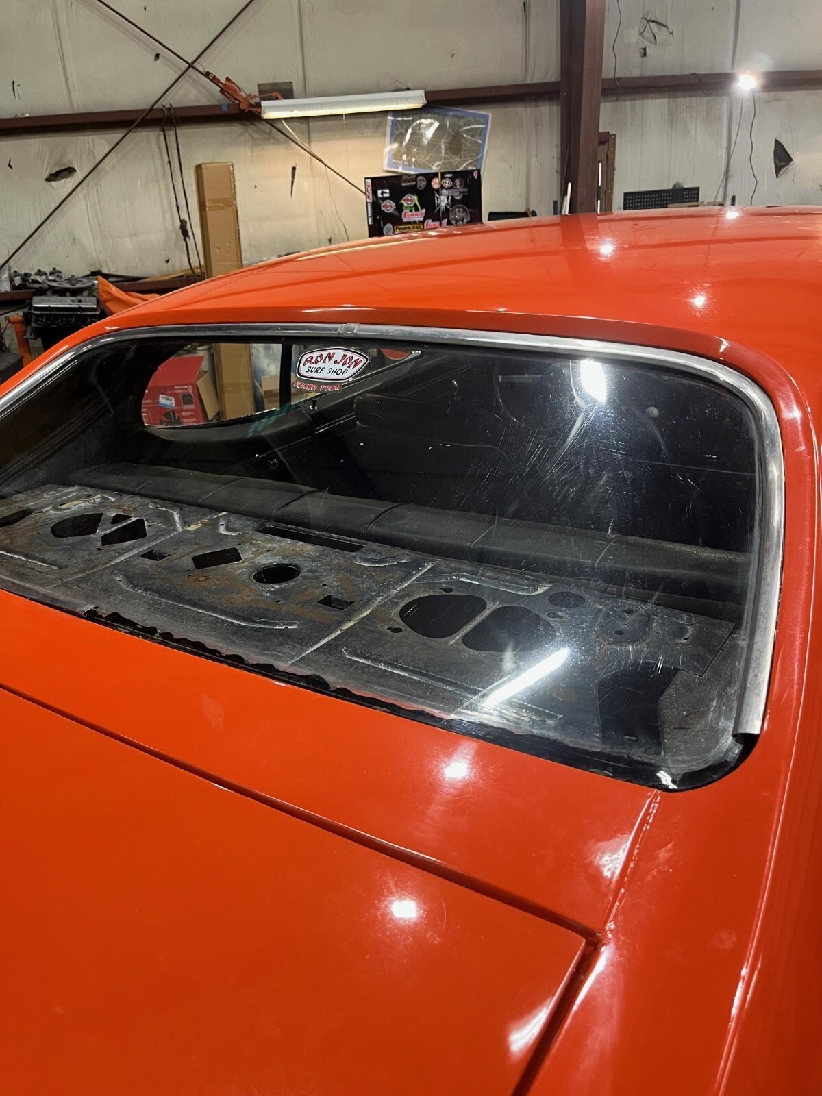 The front bucket seats and the rear bench are upholstered in Black Morrokide, and interior equipment includes a center console, a Hurst shifter, a cassette stereo, and a cabin heater. The package shelf and part of the headliner are missing, the driver’s seat is tornInstrumentation consists of a 120-mph speedometer, an optional 8k-rpm tachometer, and a fuel-level gauge as well as a pair of auxiliary gauges under the dashboard. The five-digit odometer shows 98k miles, approximately 5k of which were added under current ownership.