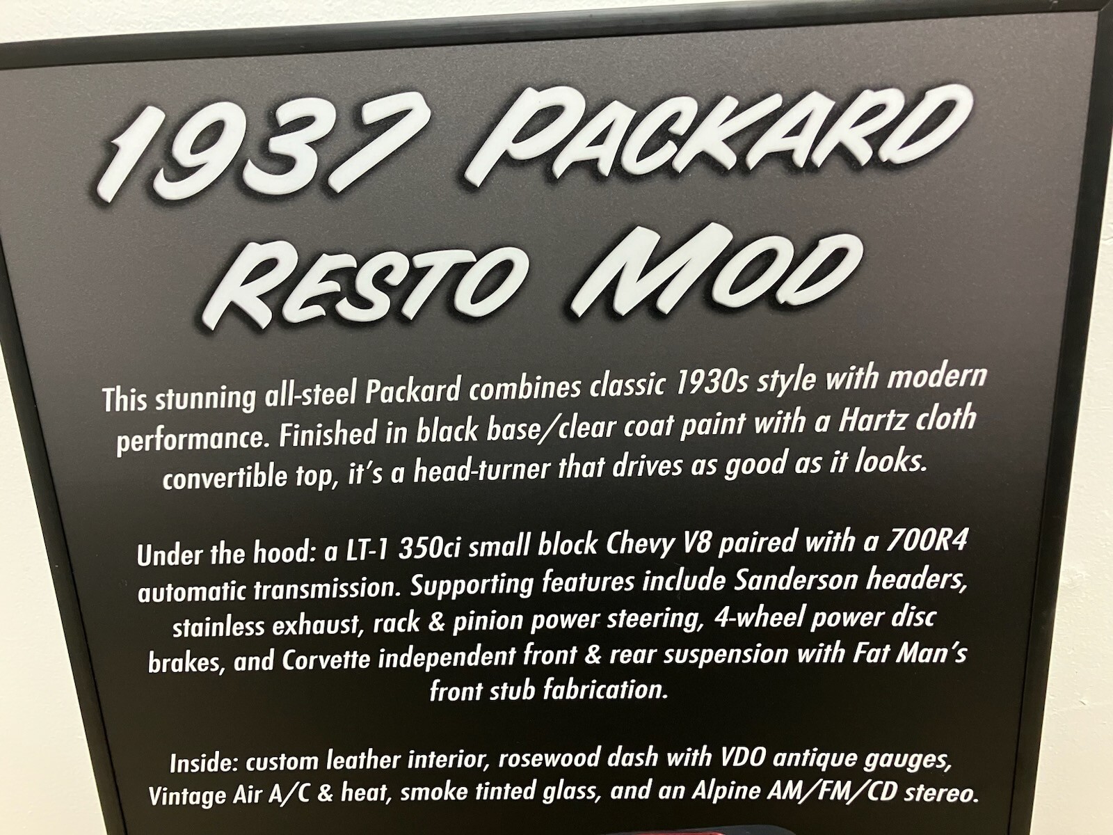 1937 PACKARD 115C - CORVETTE POWERROADSTER CONVERTIBLE RESTO MODThis Stunning All-Steel Packard combines Classic 1930s stylewith Modern Performance. Finished in Black Base/Clear Coat Paintwith Hartz Cloth Convertible Top.It's a Head Turner that Drives as Good as it Looks. a Lt-1 350 ci Small Block Corvette V8 Paired with a 700R4 Automatic Trans. Supporting features include Sanderson Headers, Stainless Exhaust, Rack & Pinion,Coil Overs, Power Steering, 4 Wheel Power Disk Brakes, and CORVETTE Independant Suspension with Fat Man's front stub fabrication. Half Shafts, Interior is Full Custom Leather Seating, Rosewood Dash with RDO Antique Gauges. Vintage Air A/C & Heat, Smoke Tinted Glass, and an Alpine AM/FM/CD Stereo. PERFECT FOR SHOWS, CRUISING, or YOUR COLLECTION. Call: 954-629-8332