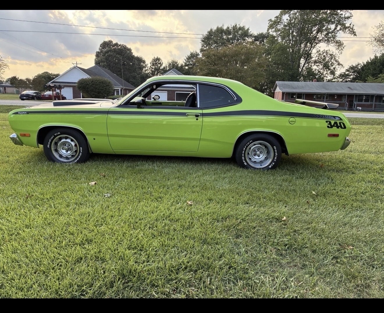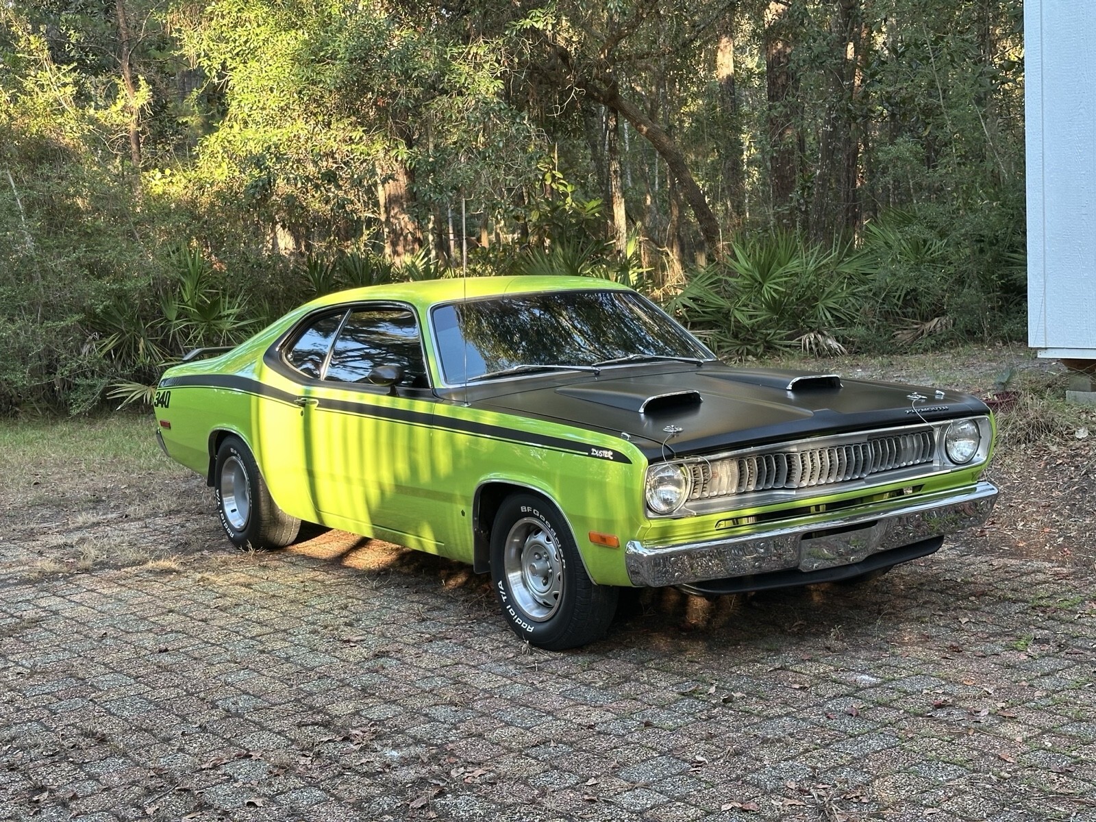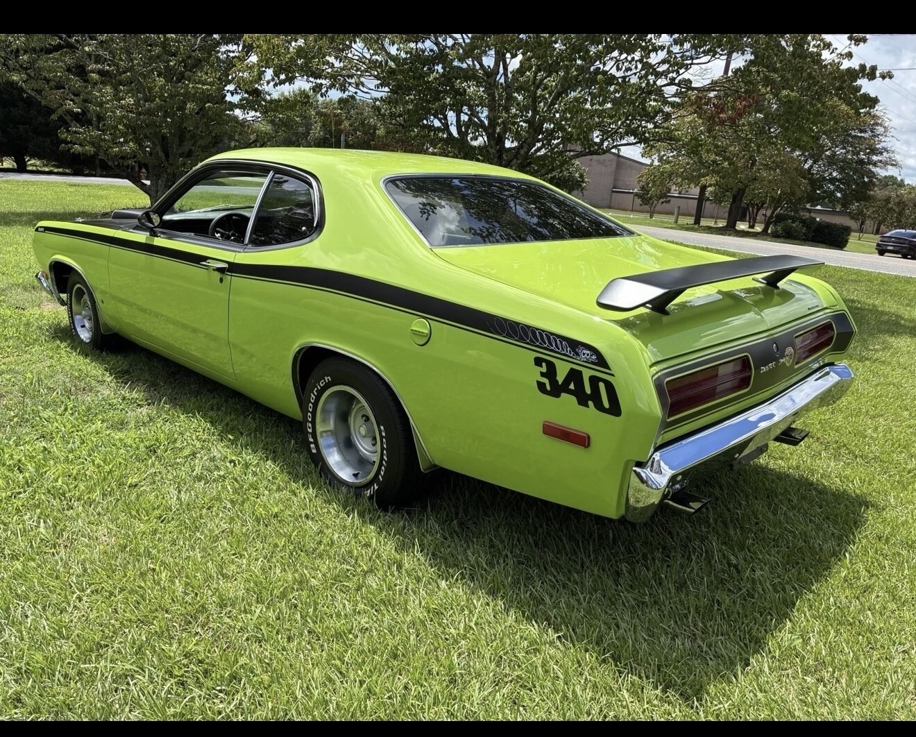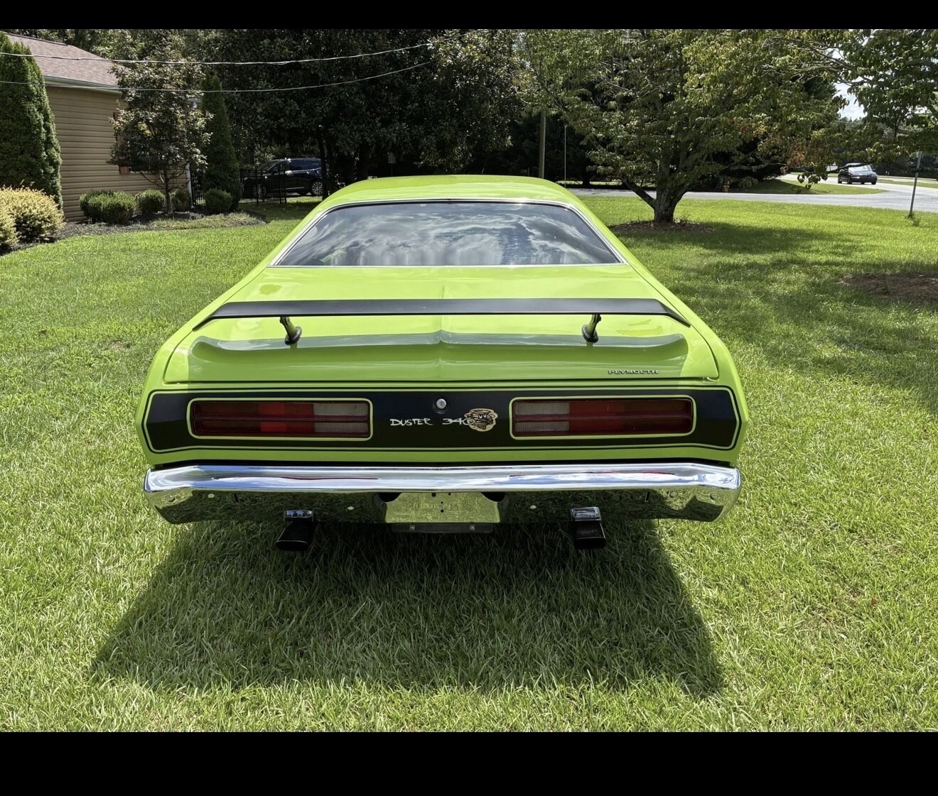 The Valiant-based Duster was introduced in late 1969 for the 1970 model year. For 1972, Plymouth built 227,992 Dusters, only 15,681 of which were produced with a 340ci V8, as was this car. Amber Sherwood Metallic (GF3) paint originally adorned this vehicle, and it was repainted in lime green during the aforementioned refurbishment. A blackout hood treatment is complemented by a matching front spoiler, body-side tape stripes, rear wing, and tail panel. The hood also has dual scoops and securing pins. Other exterior equipment includes fender-mounted turn-signal monitors, dual exhaust outlets, rigid mud guard and chrome bumpers. The windshield-wiper motor and linkage were replaced during the refurbishment, and so was the windshield itself. Cracks and scratches are noted in the paint but worse thing is on driver side rear quarter edge there is a small dent and crack in paint.