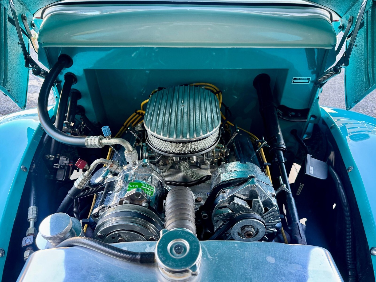 The interior is upholstered in matching teal and white vinyl with a custom center console! It truly is one of a kind and also features autometer gauges, tilt steering column, power windows, an AM FM CD Bluetooth stereo, and nice cold vintage air conditioning. The fit and finish is great and it is a comfortable ride thanks to the plush bench seat.