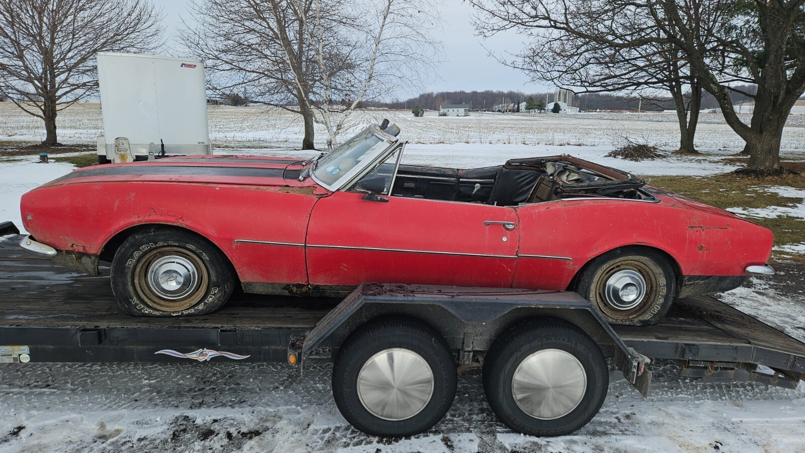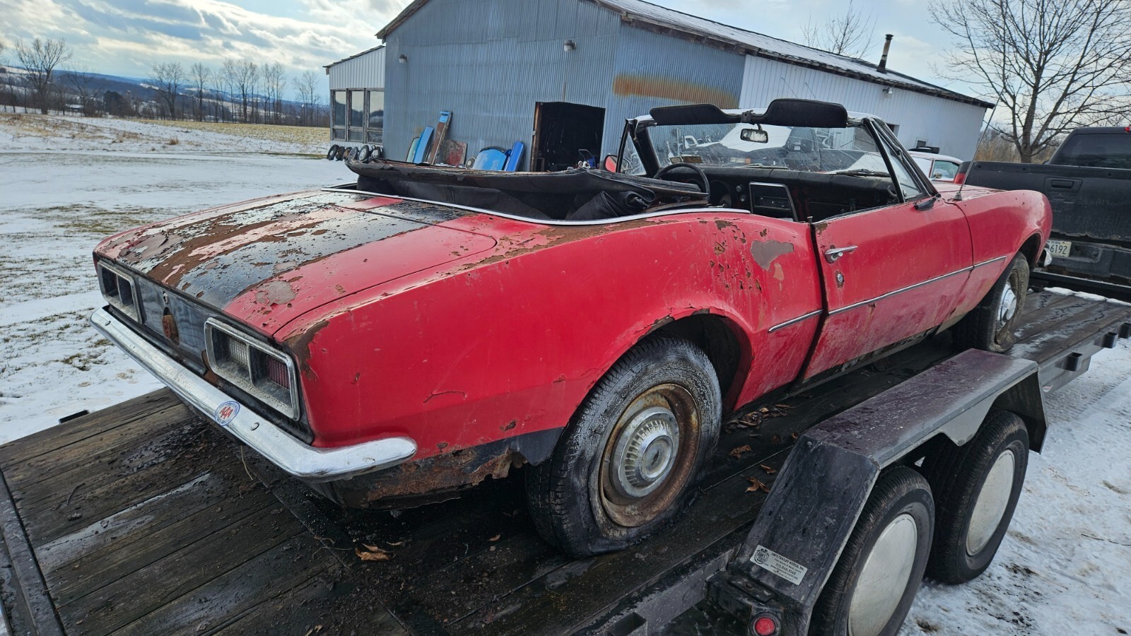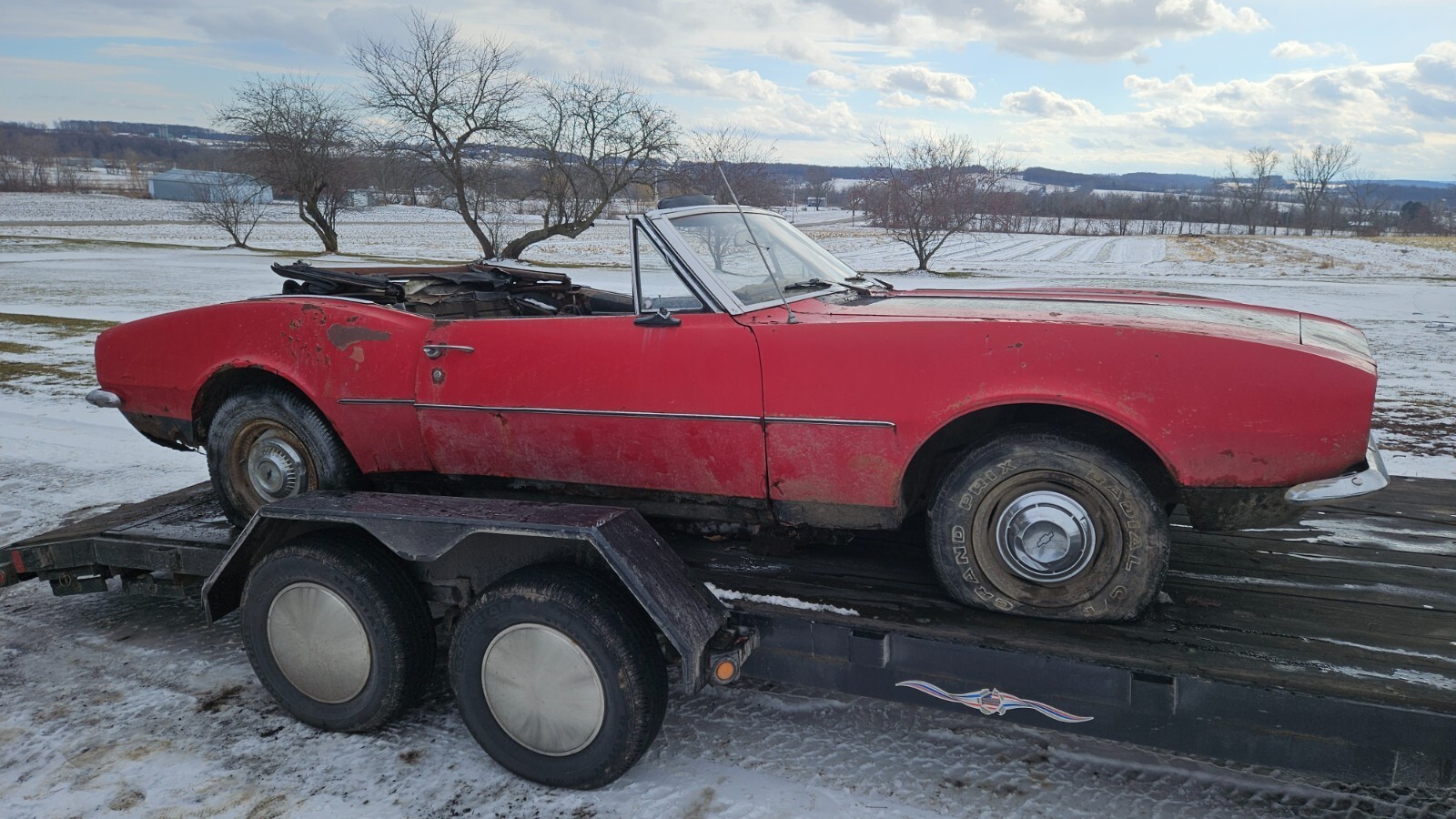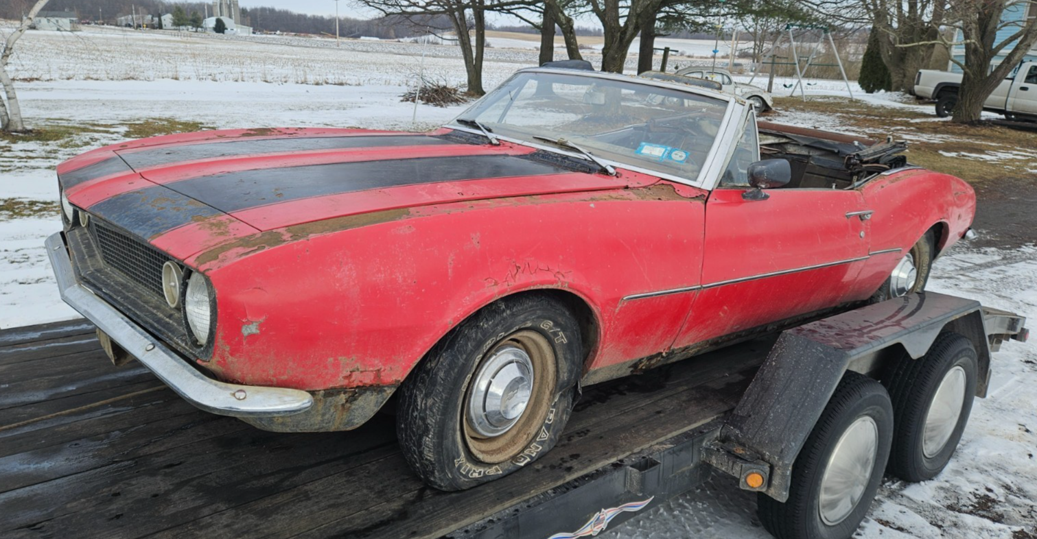 NO RESERVE. Please only bid if you are a serious buyer, look into transportation costs before bidding. Will hold until you find transportation with a deposit. Selling a 1967 Chevy Camaro convertible. It is pretty much complete besides the front seats. This is a rough project or parts car, originally white with red interior. It has been off the road and sitting for about 35 years. It is very rough and rusty underneath, floors, unibody, rear subframe, and most lower sheet metal is very rough. The front of the left rear spring is pushing up through the floor, doors do not shut properly due to sag. There is not a whole lot keeping the car together. All convertible specific parts are present, the top frame is in good shape. Has all 4 cocktail shakers in place. It is currently off the trailer, sitting on the wheels/tires seen in the main picture, will also come with the stock ones if wanted. It rolls and steers. It has what I assume is the original 6 cyl engine, it cranks and has compression but doesn't have spark. Powerglide transmission, fluid is clean. This has no title/registration or paperwork, but it would be easy to get in New York, could possibly assist if out of state. Pickup in Stanley NY zip 14561. I have more underside pictures available upon request.
