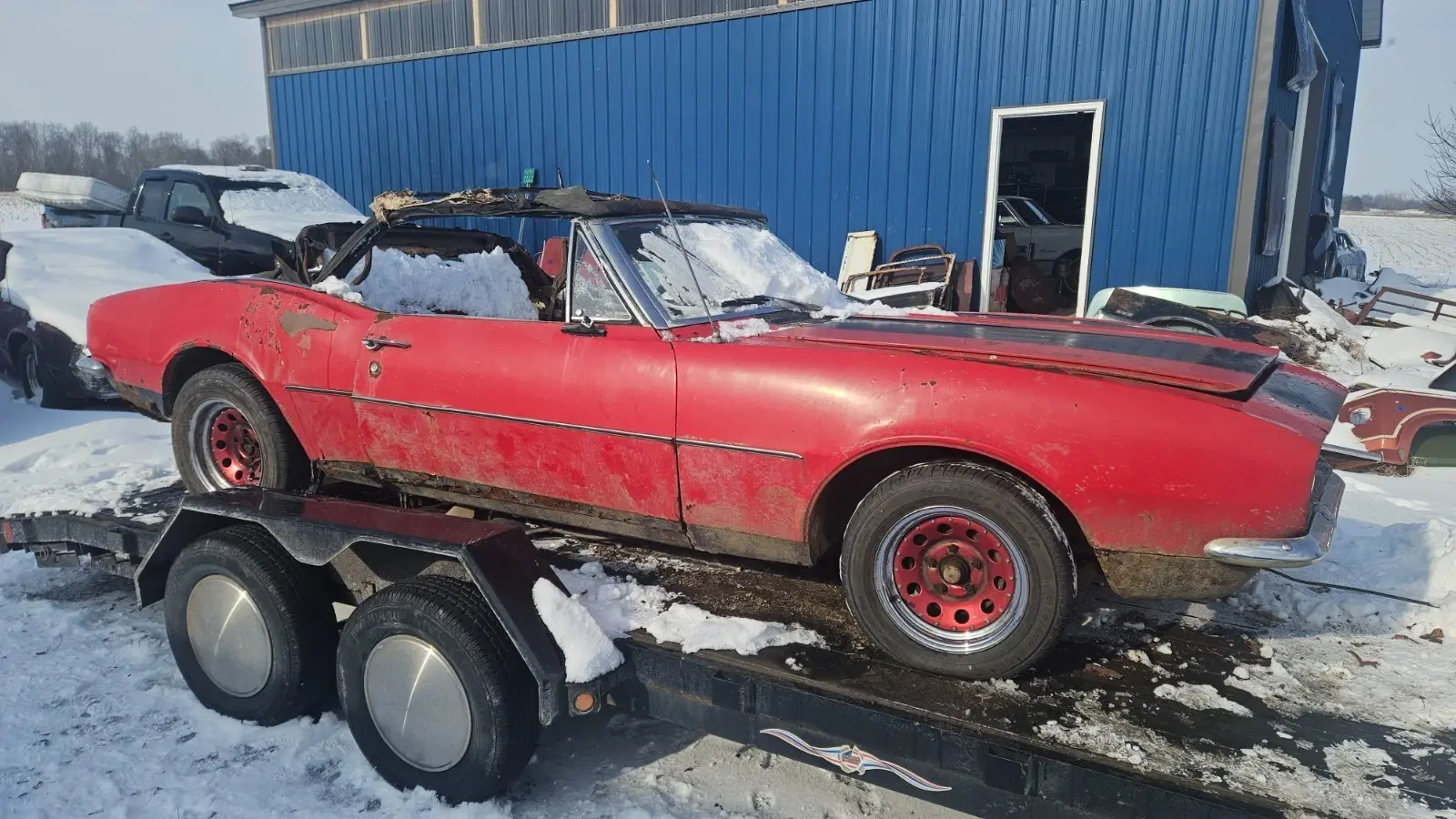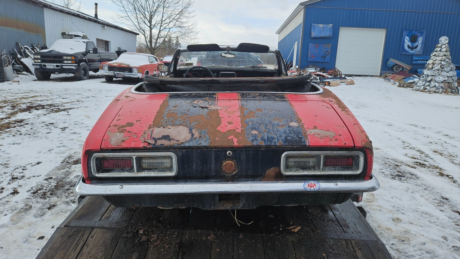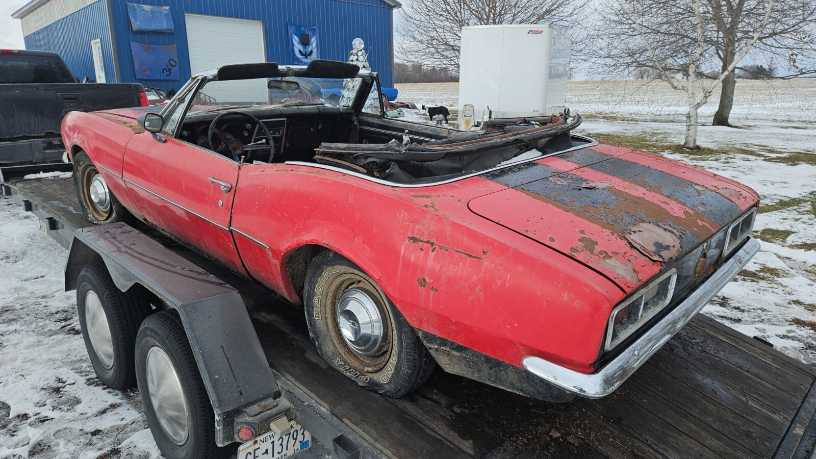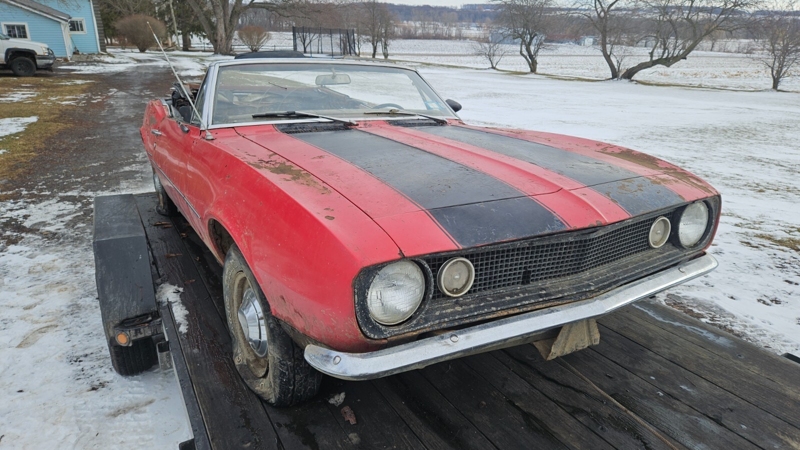 NO RESERVE. Please only bid if you are a serious buyer, look into transportation costs before bidding. Will hold until you find transportation with a deposit. Selling a 1967 Chevy Camaro convertible. It is pretty much complete besides the front seats. This is a rough project or parts car, originally white with red interior. It has been off the road and sitting for about 35 years. It is very rough and rusty underneath, floors, unibody, rear subframe, and most lower sheet metal is very rough. The front of the left rear spring is pushing up through the floor, doors do not shut properly due to sag. There is not a whole lot keeping the car together. All convertible specific parts are present, the top frame is in good shape. Has all 4 cocktail shakers in place. It is currently off the trailer, sitting on the wheels/tires seen in the main picture, will also come with the stock ones if wanted. It rolls and steers. It has what I assume is the original 6 cyl engine, it cranks and has compression but doesn't have spark. Powerglide transmission, fluid is clean. This has no title/registration or paperwork, but it would be easy to get in New York, could possibly assist if out of state. Pickup in Stanley NY zip 14561. I have more underside pictures available upon request.