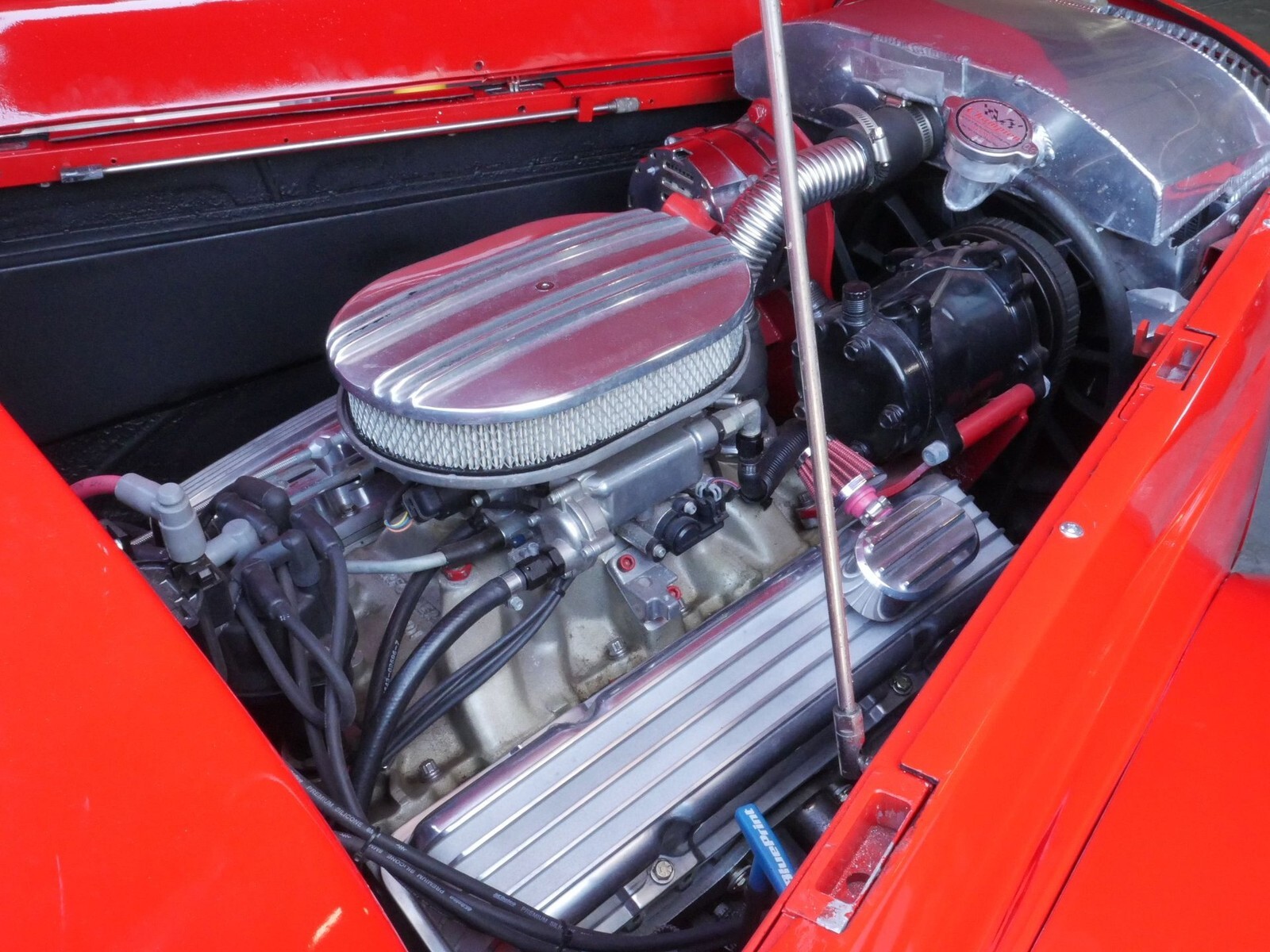The exterior of this well built fiberglass bodied street rod is painted in a Bright Red with alloy wheels with faux knock off center caps. The chopped roof, Ford V8 emblem step plates, and shaved handles give this 33 a clean and slick look!