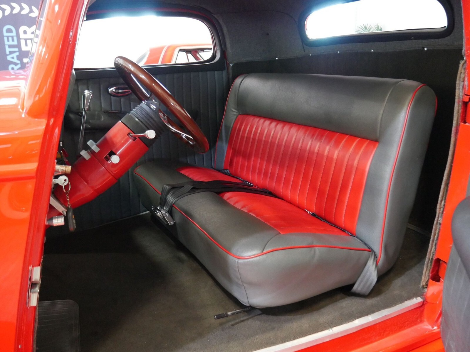 Inside you will find a comfortable bench seat done in red and charcoal gray ultraleather. Move the tilt steering wheel up to make getting in and our through the suicide doors a breeze. Get behind the wheel and you'll see a full set of Auto Meter gauges with a vintage look, a wood look steering wheel, a JVC AM/FM/CD player overhead, power window switches on the armrests, and seat belts for you and your passenger!