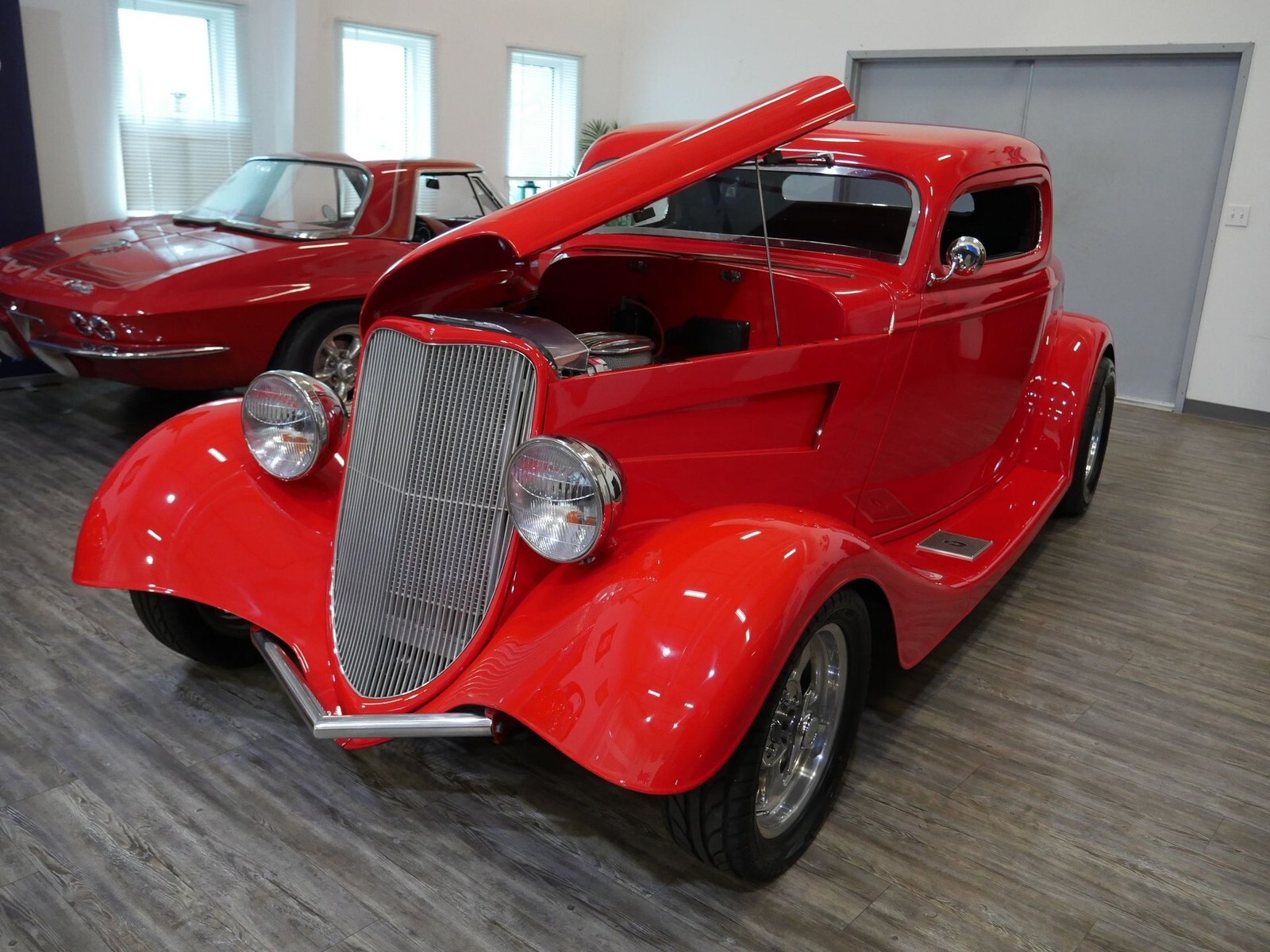 This gorgeous 1933 Ford 3-Window Coupe is built to show and enjoy! With a Blue Print Crate engine with 350 cubic inches of raw power ready to move you down the highway. That healthy V8 is topped with RPE aluminum heads, Holley Sniper fuel injection system, and a Dereal Performance aluminum radiator with dual fans to keep it cool. Finned valve covers and air cleaner go well with the touches of chrome under the hood. This is a hood you will be proud to leave open at car shows!