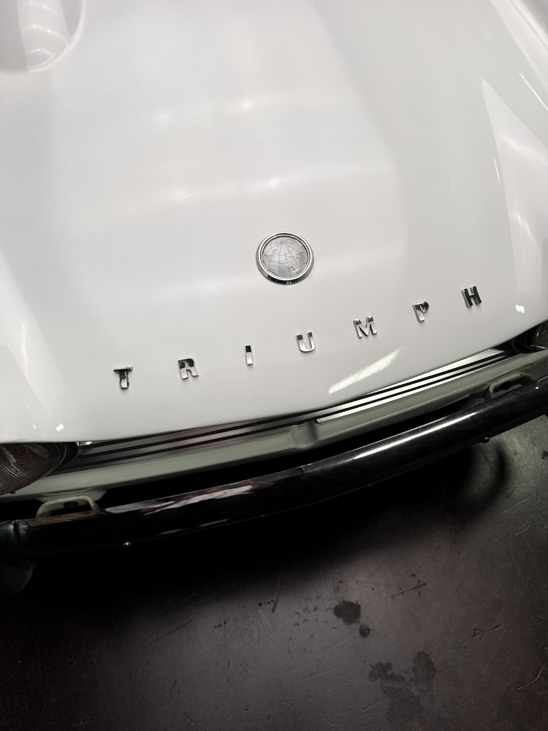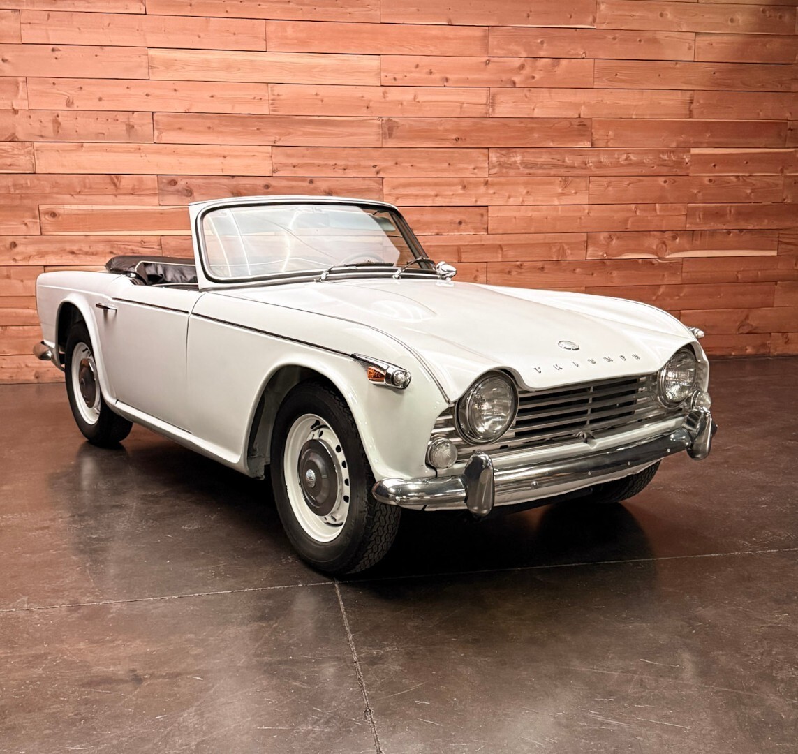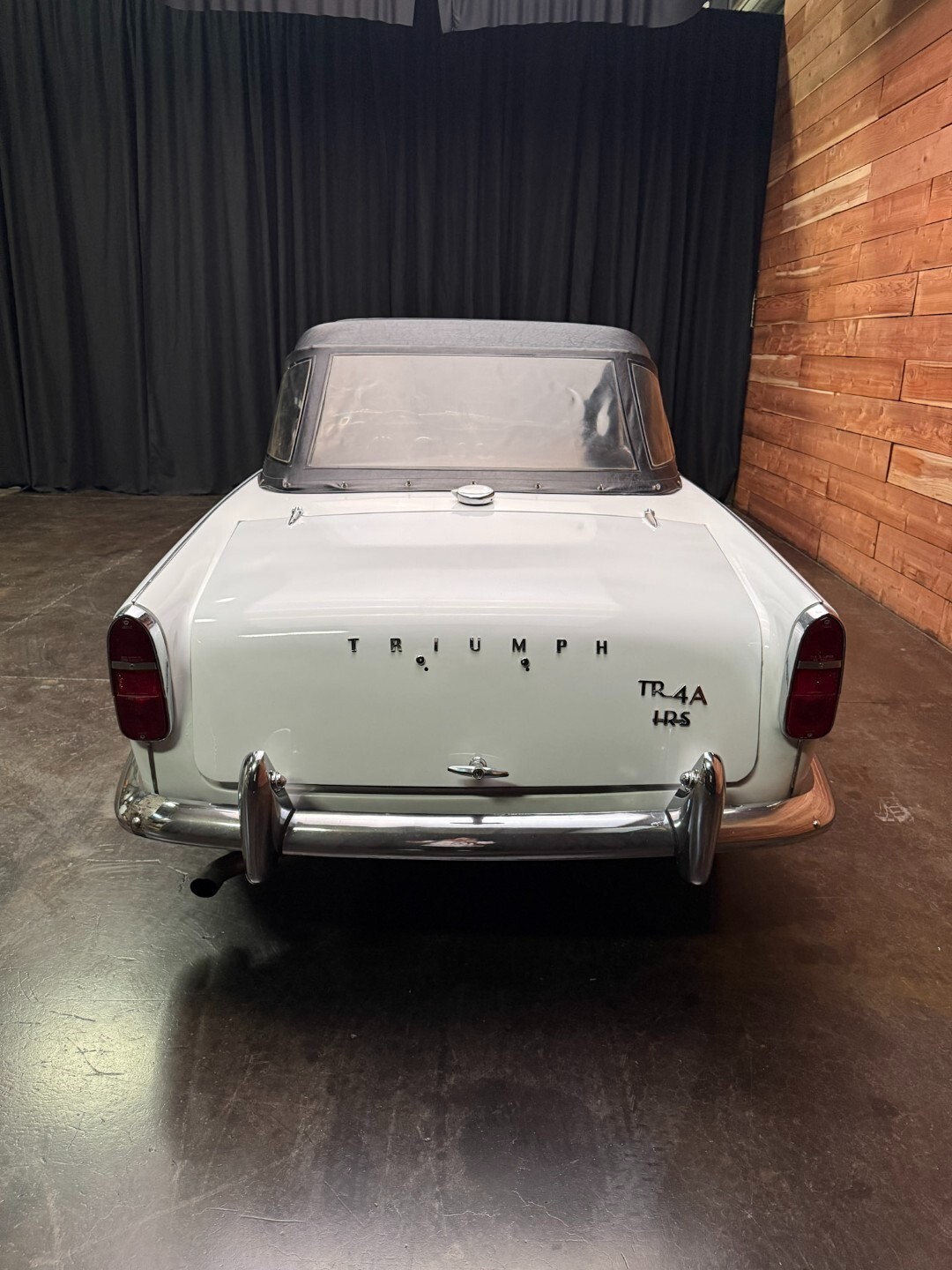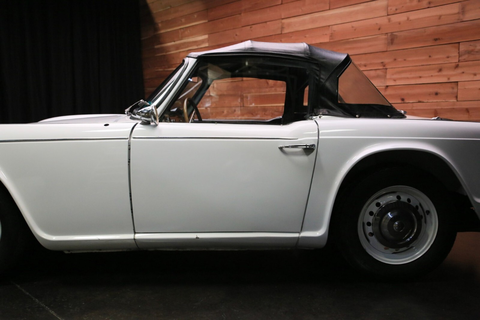 This 1967 Triumph TR4A underwent a body-off refurbishment under previous ownership, with work reportedly completed in 2020. During the restoration, the body was removed from the frame and refinished in white, and the 2.2-liter inline-four was rebuilt. The car is equipped with a four-speed manual transmission, independent rear suspension, dual SU carburetors, a black soft top, and white-finished steel wheels.