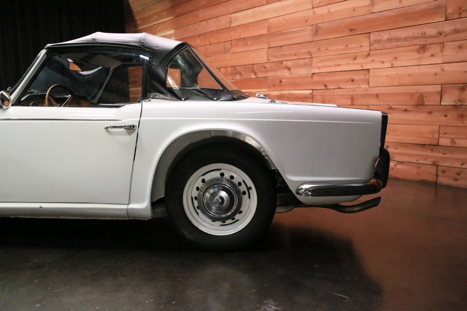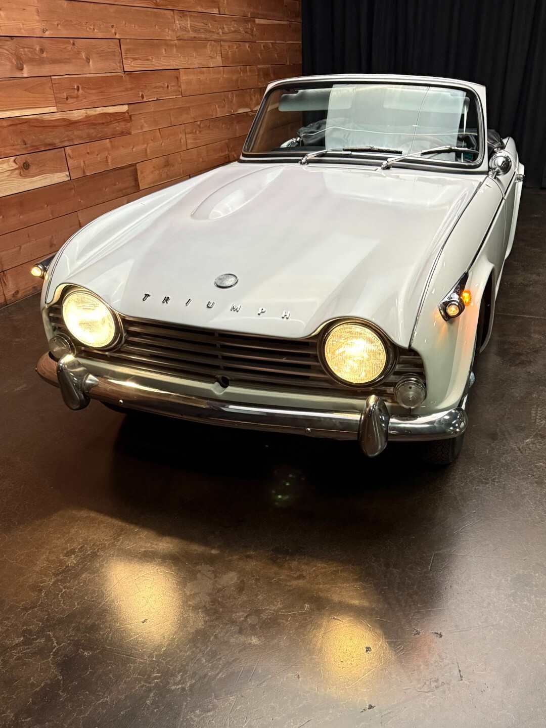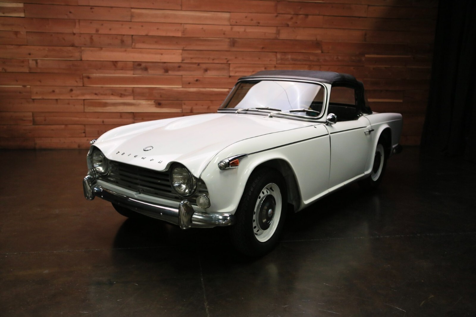 This 1967 Triumph TR4A underwent a body-off refurbishment under previous ownership, with work reportedly completed in 2020. During the restoration, the body was removed from the frame and refinished in white, and the 2.2-liter inline-four was rebuilt. The car is equipped with a four-speed manual transmission, independent rear suspension, dual SU carburetors, a black soft top, and white-finished steel wheels.
