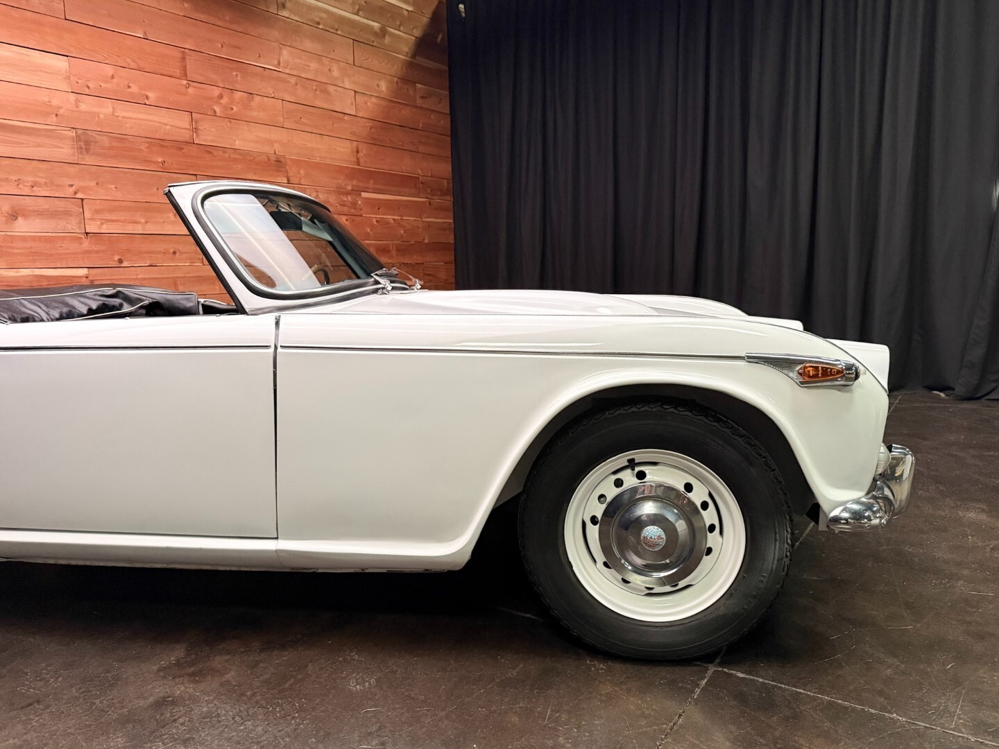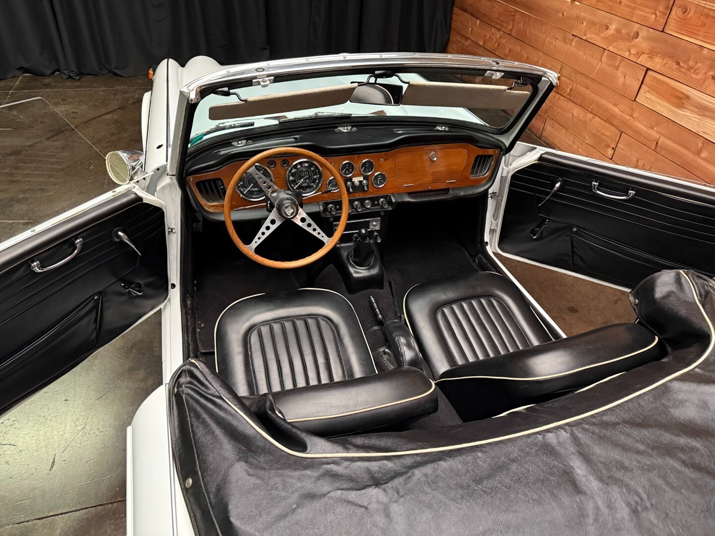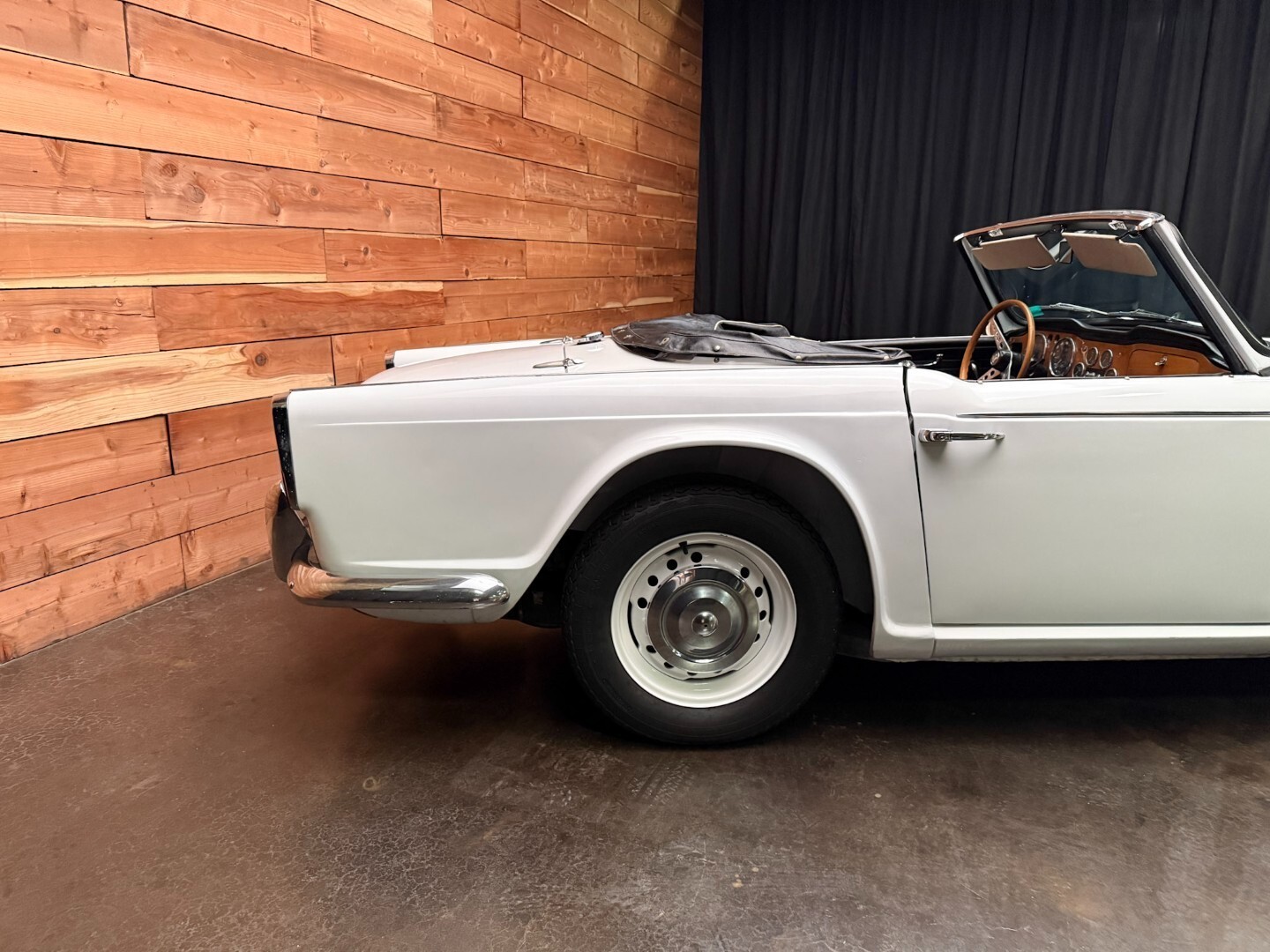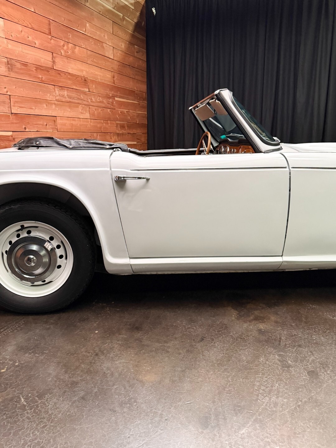 This 1967 Triumph TR4A underwent a body-off refurbishment under previous ownership, with work reportedly completed in 2020. During the restoration, the body was removed from the frame and refinished in white, and the 2.2-liter inline-four was rebuilt. The car is equipped with a four-speed manual transmission, independent rear suspension, dual SU carburetors, a black soft top, and white-finished steel wheels.