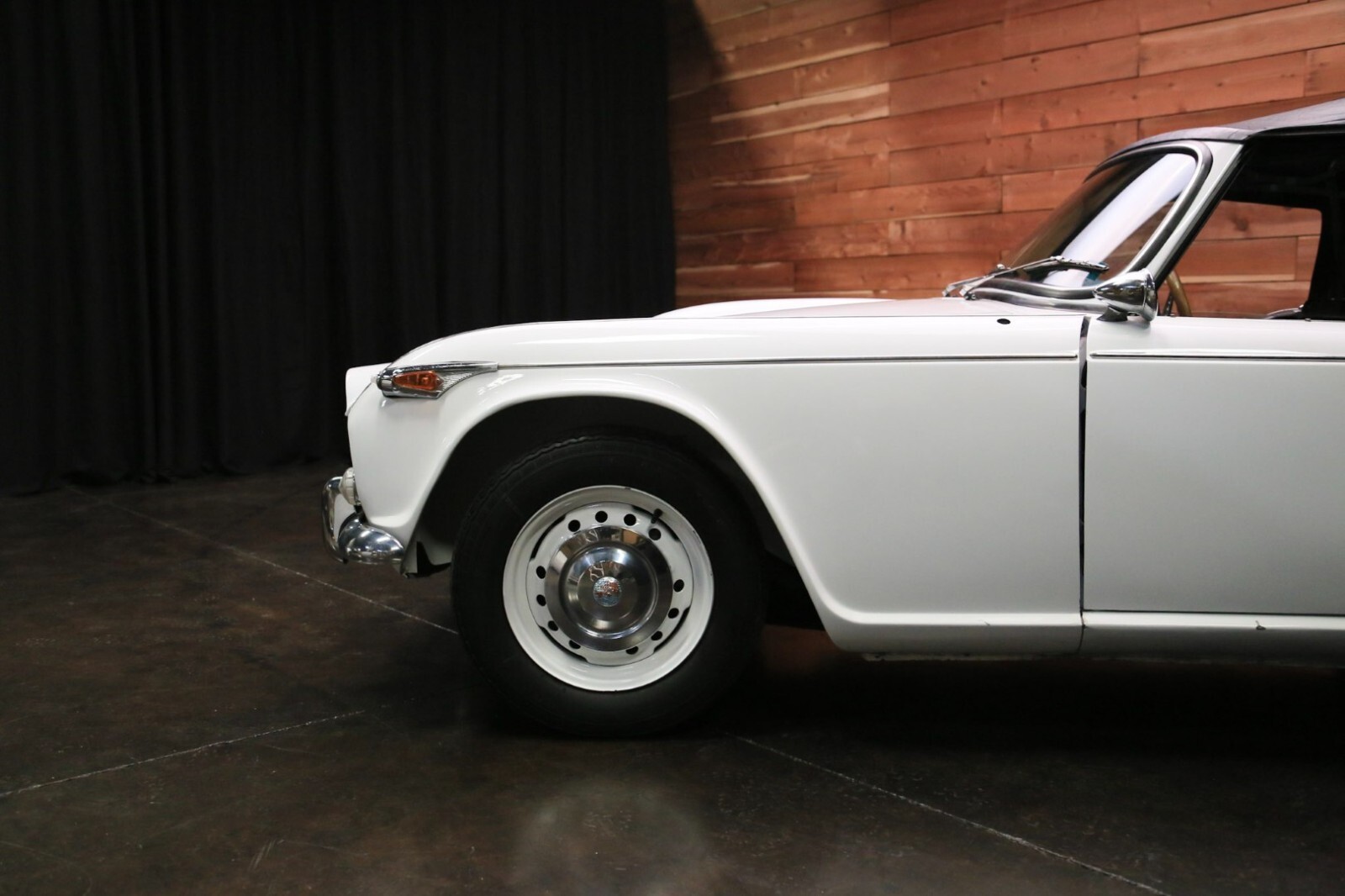 The steel wheels were refinished in white and are fitted with chrome hubcaps and an older set of Goodyear tires. The factory spare wheel and tire are no longer with the car. The TR4A retains its desirable independent rear suspension configuration.
