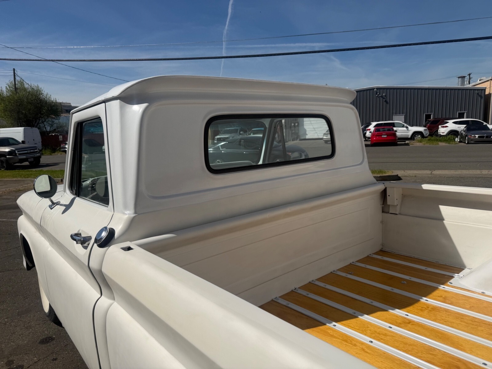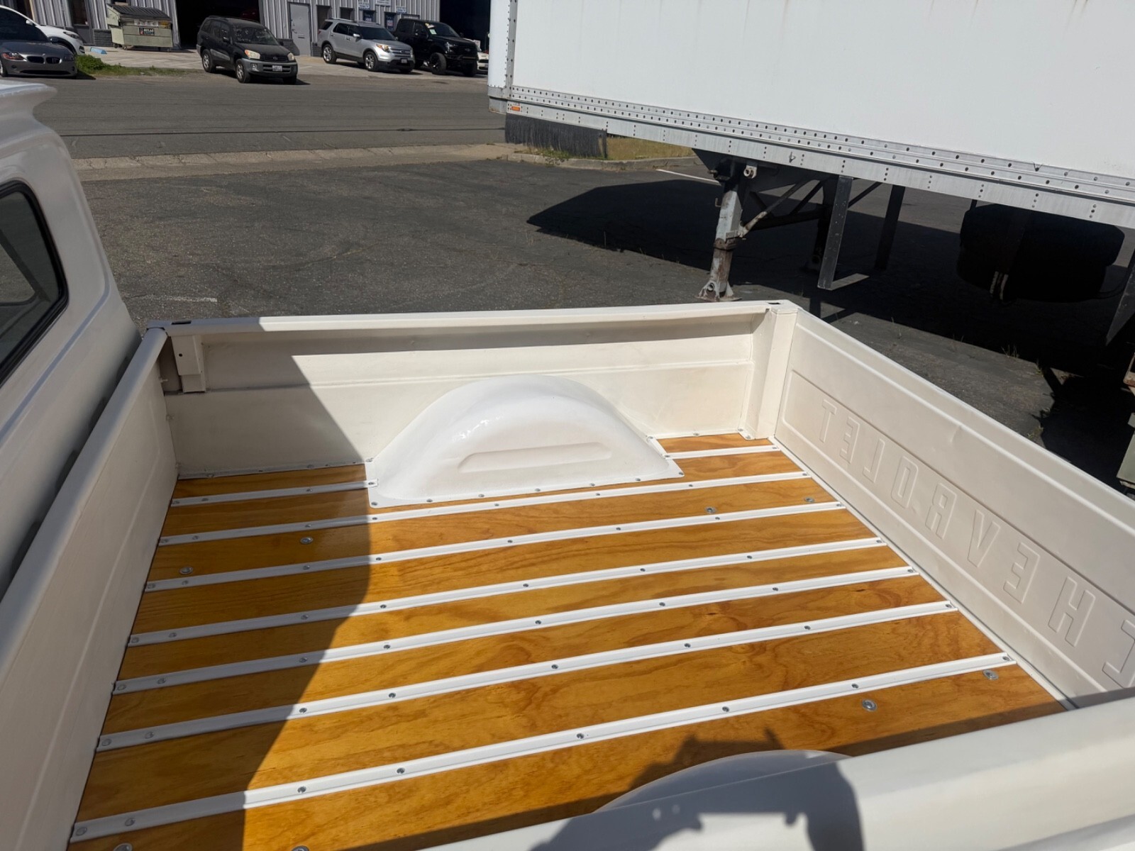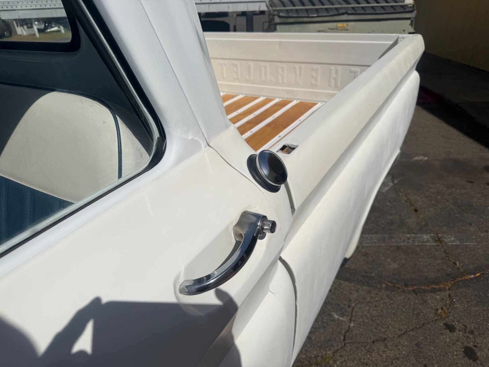 Exteriorflat white paint, gloss white roof and bumpers and wheelsNew bed rails are gloss white with new wood & hardwarenew chrome mirrors, new rear bumper with brackets new license plate bracket with lightHeadlights work turn signals work brake lights workNew gas, cap and fuel filler sealWipers work no arms or blades new chrome bullet covers