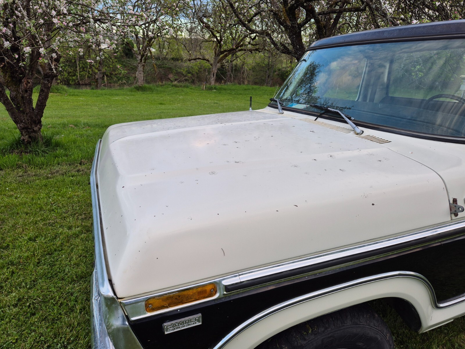 The spare tire cover and air cleaner were robbed off this vehicle when it was parked. I sourced a spare tire cover, but needs to be painted to match. The truck is original paint otherwise, has a few bumps and bruises. The hood has some blisters from tree sap and leaves.