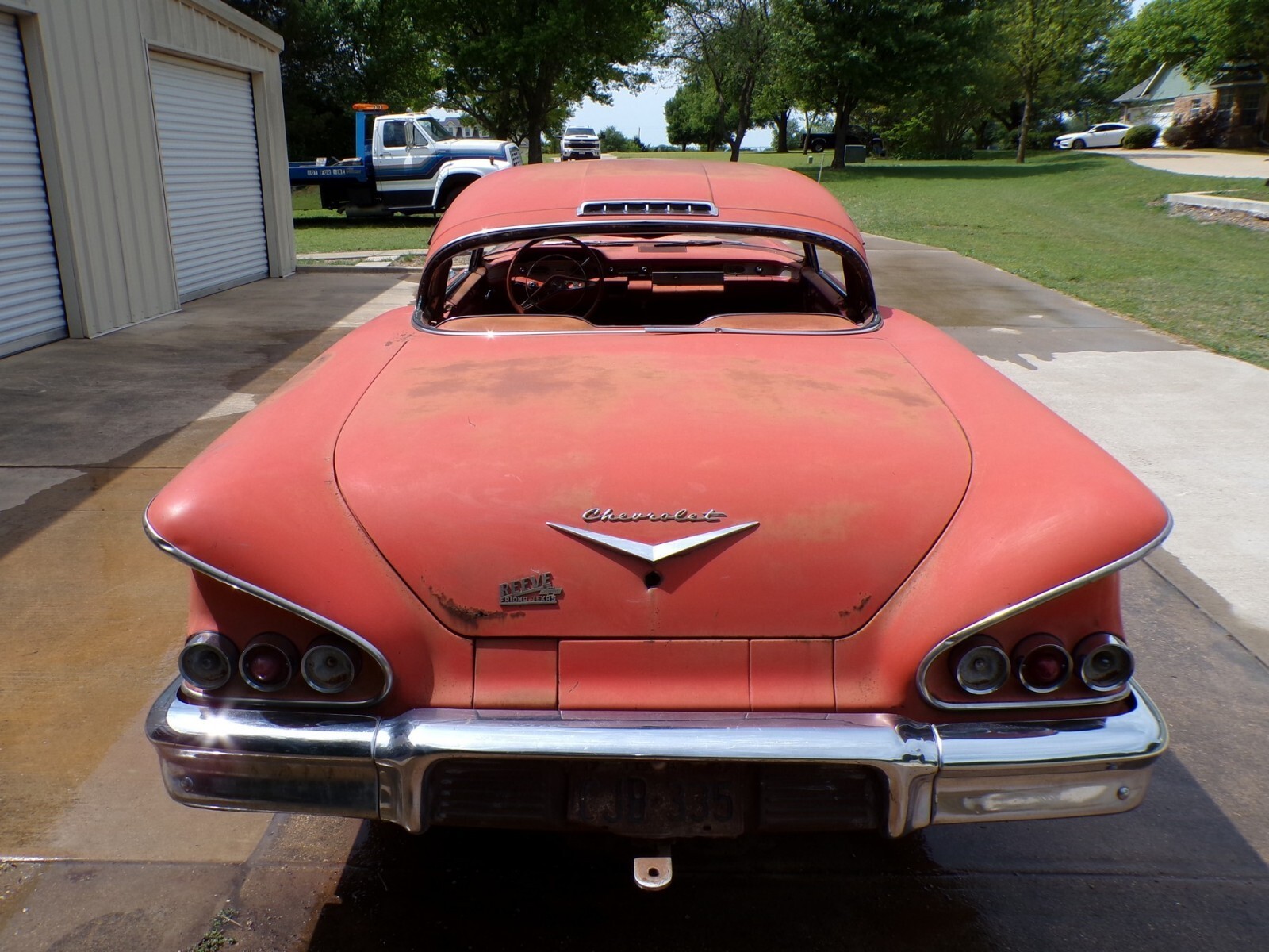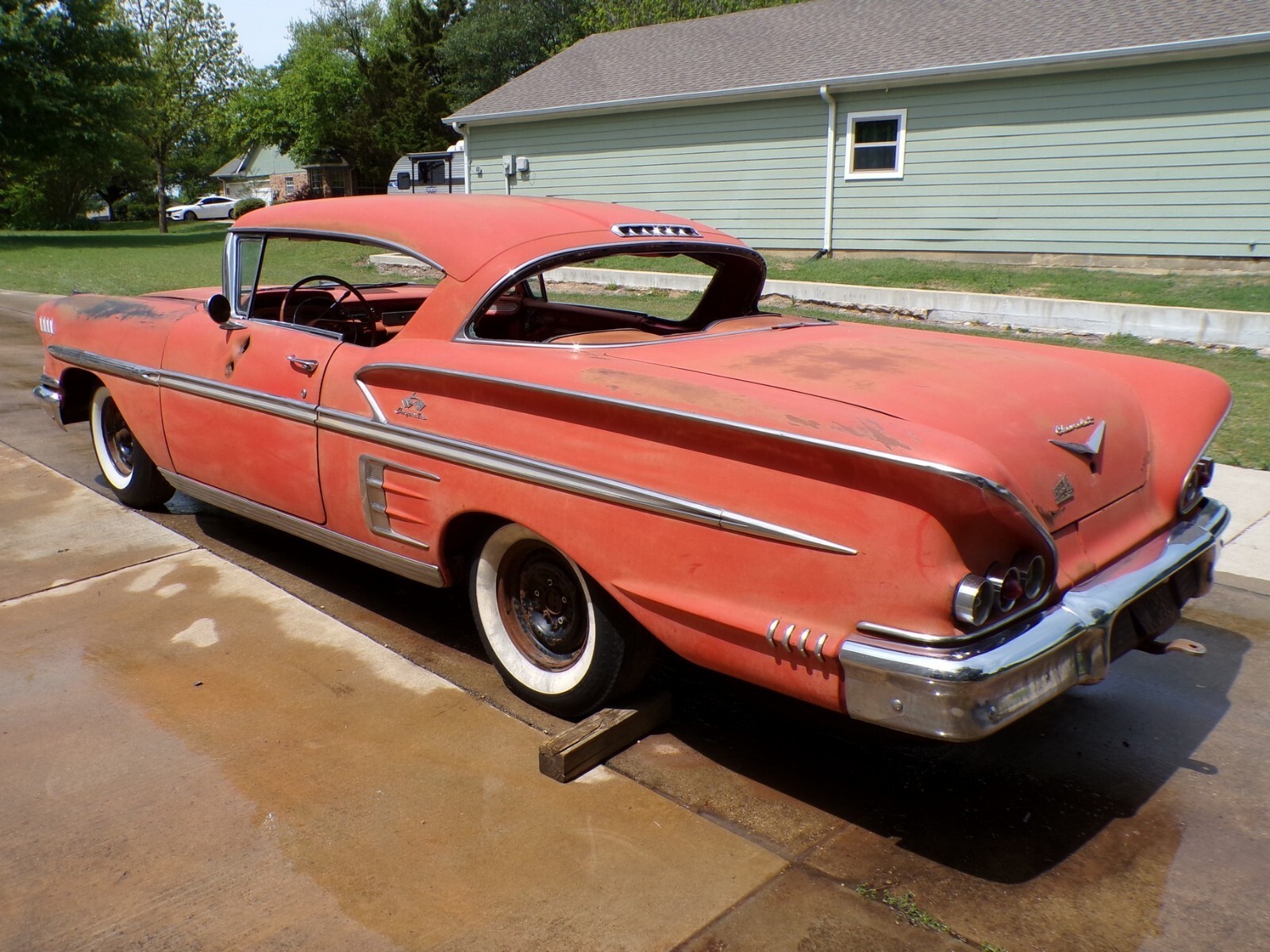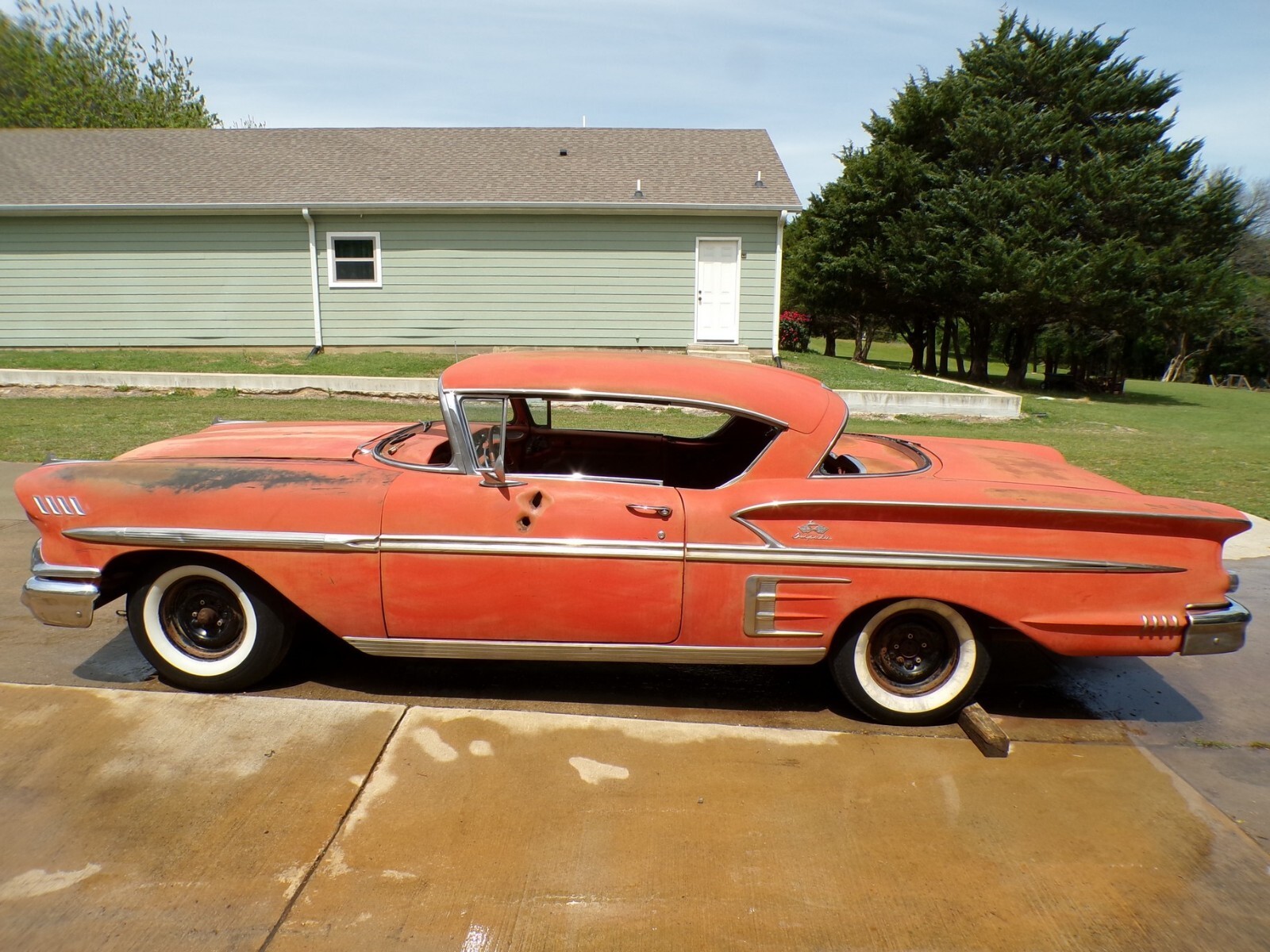 SEE 90 DETAILED PHOTOS ON MY WEBSITE WWW.PETESCLASSICCARS.COM NO TRADES. NO FINANCIN, NO CARAMEL /EBAY SECURE PAYMENTS. BEST WAY TO GET IN TOUCH IS BY A SIMPLE PHONE CALL.. NO LOW BALL OFFERS. PRICE IS FIRM. I SELL WORLDWIDE. CAR CAN BE EXPORTED FROM HOUSTON, TX. HERE IS THE DESCRIPTION 1958 CHEVROLET IMPALA SPORT COUPE- ONE OWNER CAR SOLD BY REEVE CHEVROLET ON 5/29, 1958 . HAVE THE ORIGINAL TITLE AND LICENSE RECEIPTS . LAST ON THE ROAD IN 1969. MOSTLY ORIGINAL PAINT. SHOWS 70,000 MILES. FACTORY ROMAN RED WITH GRAY, BLACK,RED INTERIOR, WAS PROBABLY A 283 CA, WAS A 3 SPEED MANUAL. SOMETIME BEFORE IT WAS PARKED, A OLDSMOBILE 324 V8 FROM THE 50'S AND AN AUTOMATIC TRANSMISSION WAS INSTALLED. NOT RUNNING. THE OUTER BODY IS SOLID. IT DOES HAVE A SHOTGUN BLAST IN THE DRIVER DOOR. THE FLOOR PANS ARE RUSTED OUT EXCEPT FOR DRIVER SIDE REAR. THE TRUNK PAN HAS SOME CRACKS . ALL THE GLASS EXCEPT FOR THE TINTED VENT WINDOWS WAS BROKEN YEARS AGO BY KIDS THE WINDOW FRAMES ARE GOOD. PARTS MISSING- HUBCAPS, ORIGINAL MOTOR/TRANS., FRONT SEAT TRACK, WINDSHIELD INSIDE MOLDINGS.,REAR SEAT SPEAKER GRILL, ONE ROCKER MOLDING. ORIGINAL TEXAS TITLE IN HAND SOLD AS IS. EBAY BUY IT NOW DEPOSIT NON REFUNDABLE. BALANCE OF PAYMENT IN 3 DAYS UNLESS OTHER ARRANGEMENTS MADE BEFORE HAND. BALANCE BY CASH IN PERSON OR BANK WIRE TRANSFER. VEHICLE AND TITLE RELEASED WHEN FUNDS CLEAR. GO TO MY WEBSITE WWW.PETESCLASSICCARS.COM FOR PHONE NUMBER AND MORE PHOTOS.