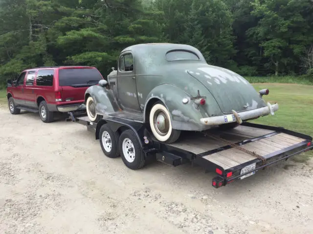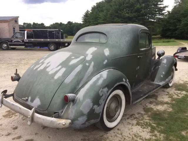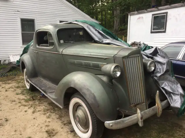 1937 Packard 115C coupe as stored in 1963 but brought back to life to make it a driving example. Minor rust and usable wool interior. All components work, even the vacuum wipers with the cool push in to return them to park. The rear and passenger side glass is cracked and the drivers window is broken, but there. The primer dabbed spots have been mostly removed now.