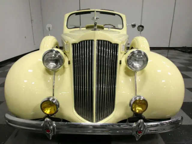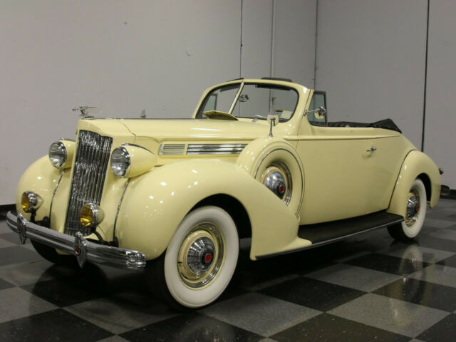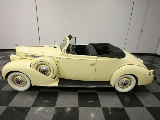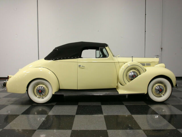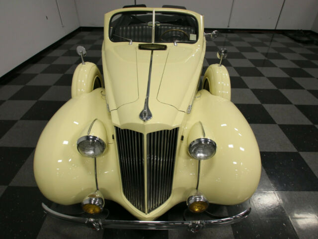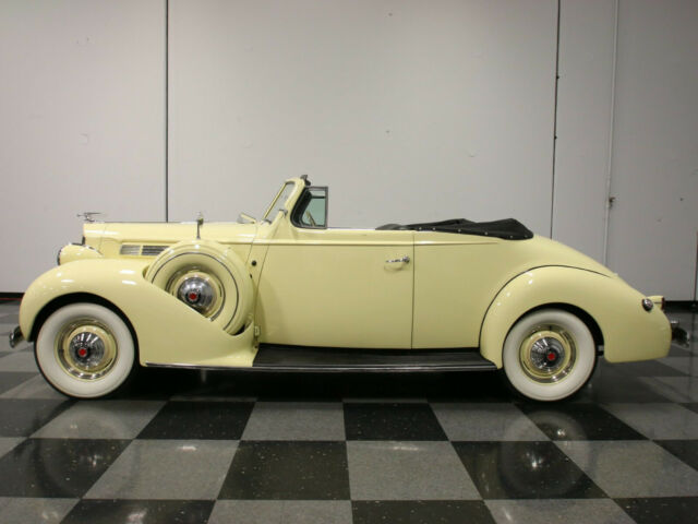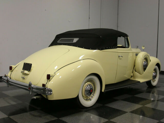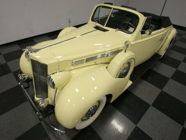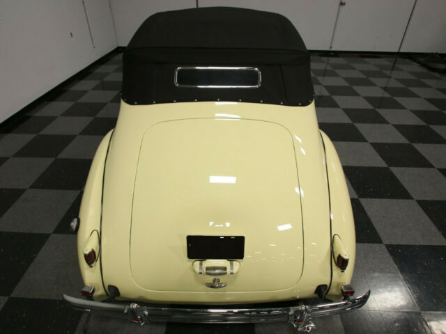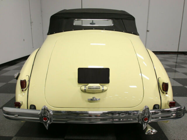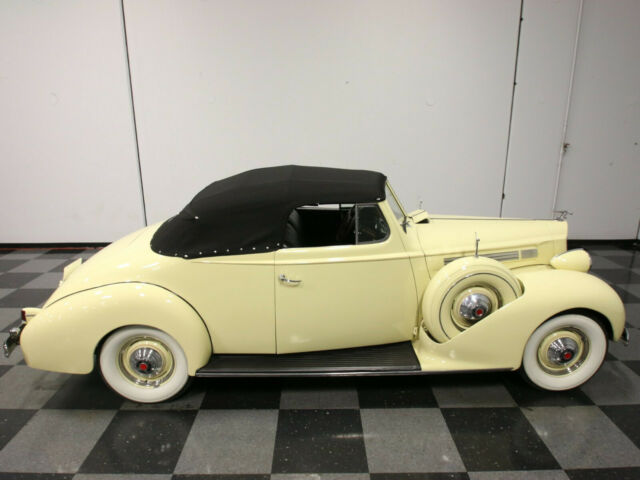 The 120 uses a 282 cubic inch straight-8, which makes, naturally, 120 horsepower. It's as smooth and torquey as you'd expect and moves the trim convertible with genuine enthusiasm. It's detailed with proper Packard olive green paint and we see no deviations from the original spec under the hood. There's an oil bath air cleaner, fabric-wrapped coolant hoses, and a single downdraft carburetor that offers great throttle response. The three-speed manual transmission shifts easily thanks to synchromesh on 2nd and 3rd gears and it's pretty happy at 55 MPH. The 120's innovative Safe-T-Flex independent front suspension was now standard across the line, but it was still a great handling car with a lot of confidence on the road. The brakes were similarly powerful and reliable for the period. Handsome steel wheels with more red pinstripes, trim rings, and Packard hubcaps are wrapped in 7.00-16 whitewall tires for the perfect period look.