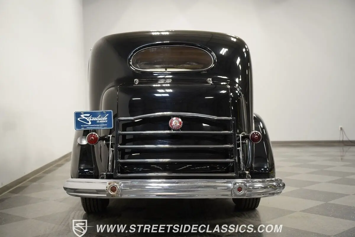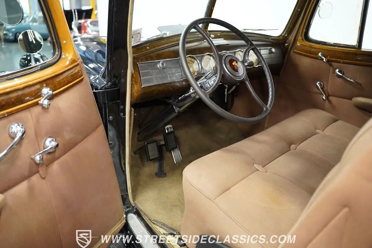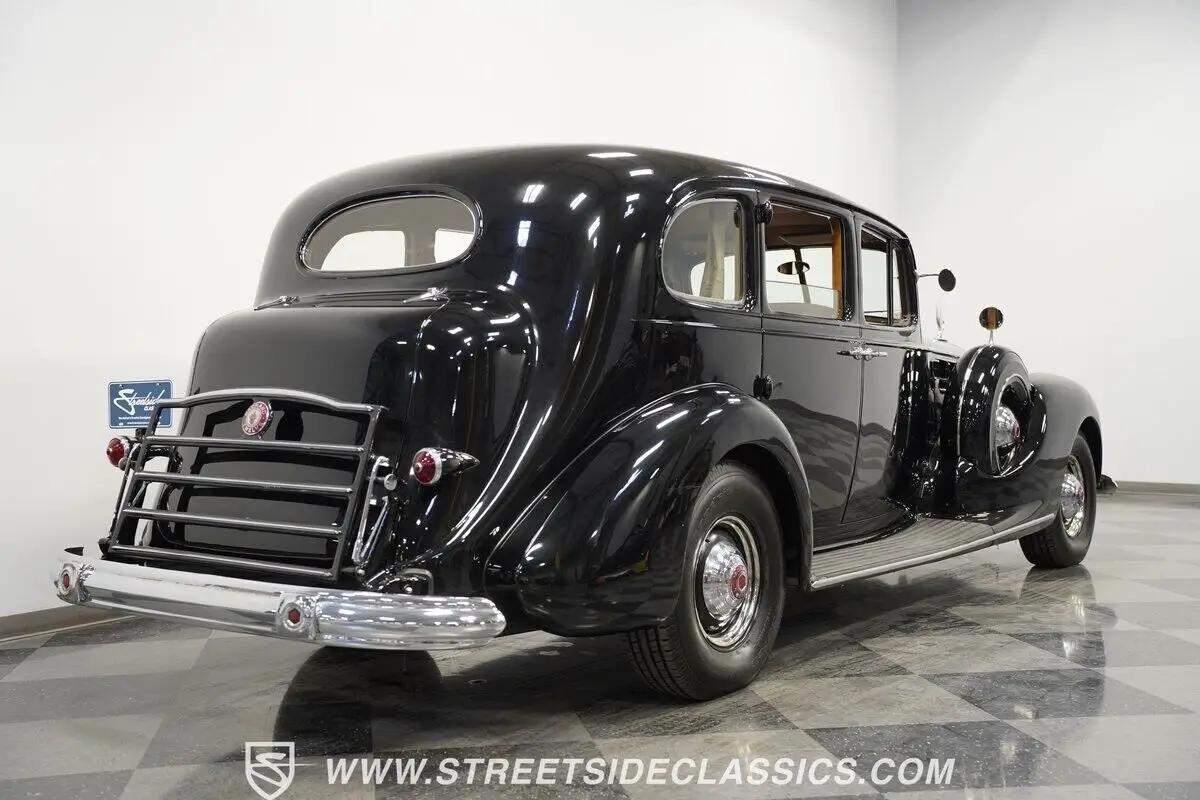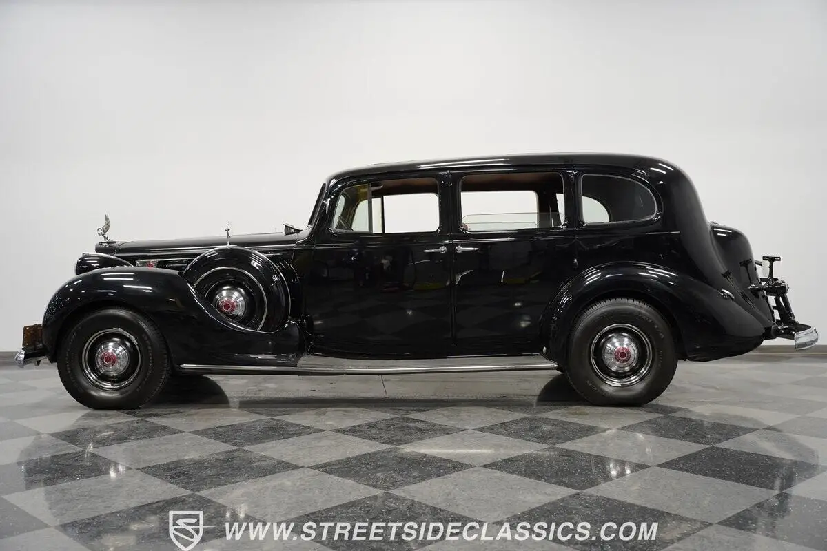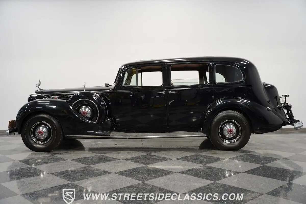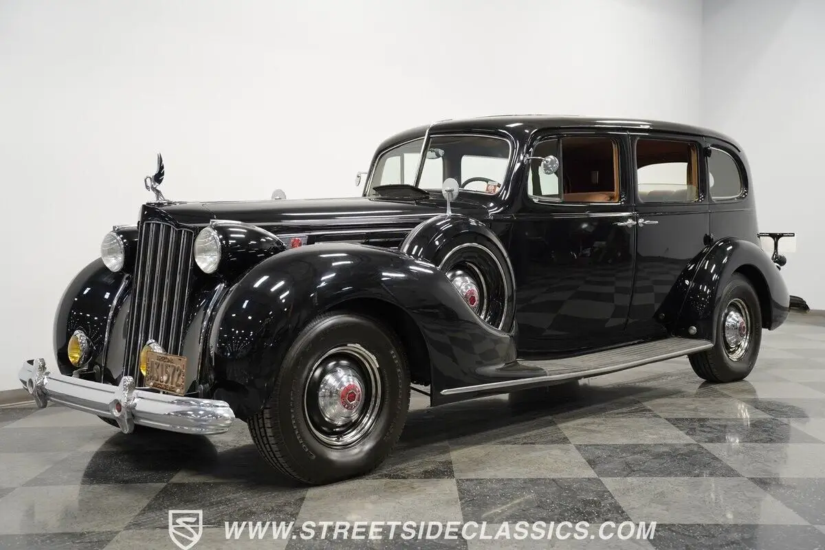 Marking the grand finale of Packard's V12 era, 1939 Packard Twelve Touring Sedan carries automotive royalty in its DNA. Massive in scale and unrelenting in presence, this black-clad titan features suicide doors that open to reveal its luxurious cabin. Four perfectly maintained outside mirrors flank the body, while giant headlights and fog lamps create an unmistakable face. The symmetrical fender-mounted spare tires with distinctive Packard mirrors above add old-world character. A folding luggage rack extends functionality, while 16" steel wheels wrapped in BFGoodrich 235/85/R16 tires support the substantial frame. The black finish gets extra character from a tasteful vinyl roof insert – a true rolling masterpiece from a bygone American luxury tradition.