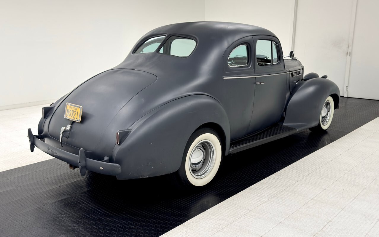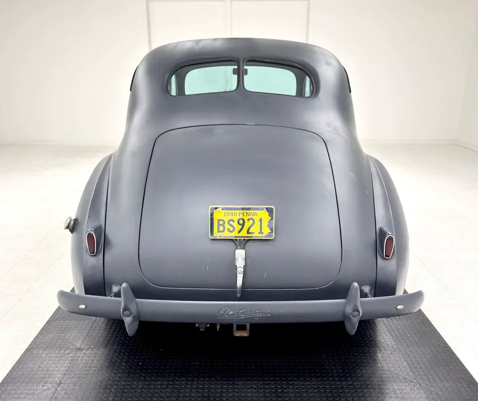 We're liking the flat black primer coat as is, but it will also serve as the base for the color of your choice and the sky's the limit! The tall vertical grille with an art deco crown is flanked by side grilles constructed with finer gauge splines in the shape of opposing castle doors. A unique configuration of triple bumper guards line the chrome bar which has lost much of its shine but is fully intact and straight. Some Greek influence can be found on the crest of the engine vents which is shaped like an Olympic discus, embossed with the "110" designation and capping an incredible multi ported side vent. A split window floats over the sloped luggage compartment, flanked by modestly flared rear fenders that wear diminutive tail lights, underscored by a straight primered bumper with Packard script stamped into the metal and we note a trailer hitch below. 15-inch Chevrolet Rally wheels carry white wall tires. There is some bubbling on lower panels, a dent, and some cracked filler.