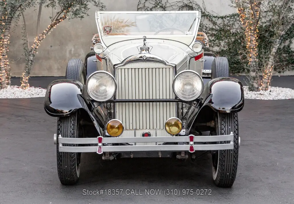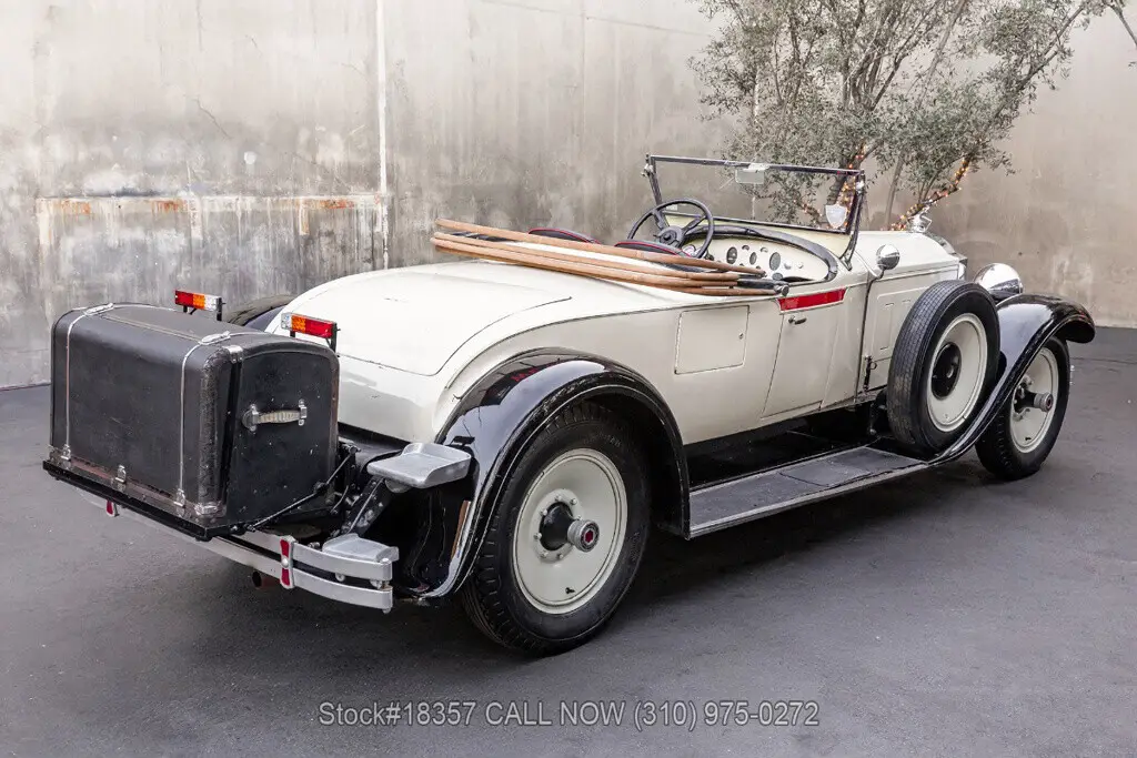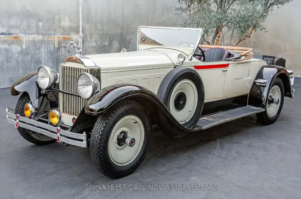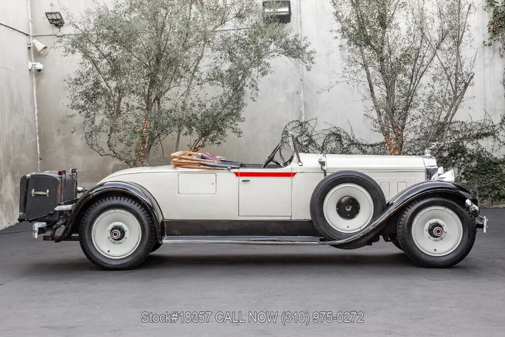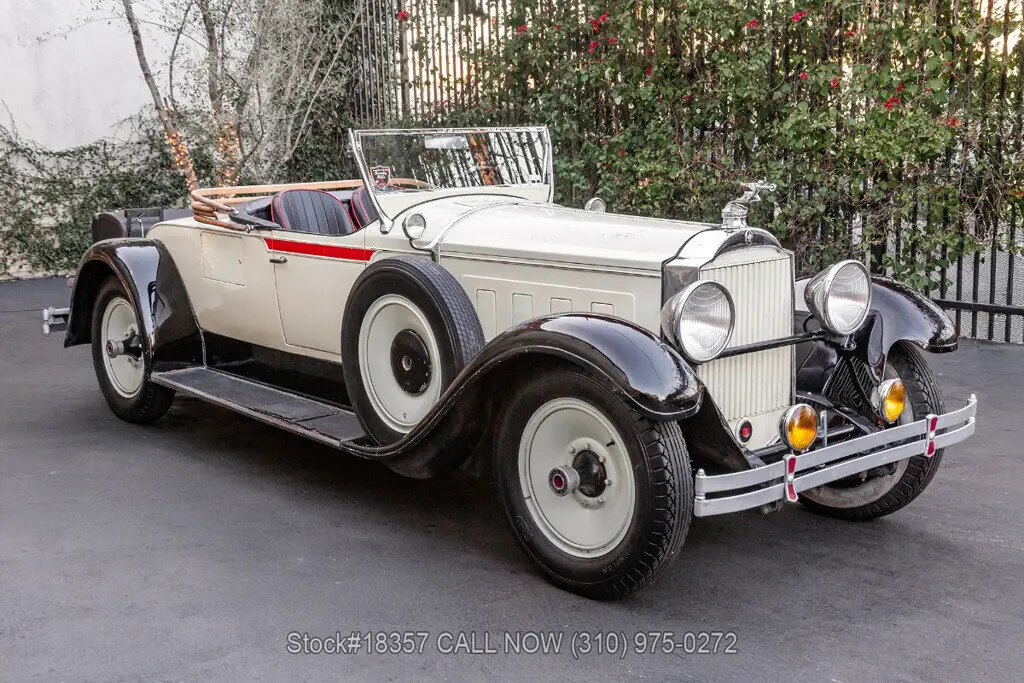 1929 Packard 640 Custom Eight Roadster Introducing this pre-war 1929 Packard 640 Custom Eight Roadster with a "Rumble Seat" that is finished in an ivory exterior with black fenders complemented by a black interior. Equipped with a floor-shifted automatic transmission, upgraded with a 305ci V8 engine, single exhaust outlet, hood louvers, four-spoke steering wheel, convertible soft-top frame, chrome bumper, side steps, Denman tires, 20-inch solid wheels, and two full-sized spare tires that are side-mounted. Step inside this classic Packard and you'll be greeted with bucket seating with red stitching, providing comfort and style. Featured amenities include body side-steps, an analog clock, and a rear luggage mount.