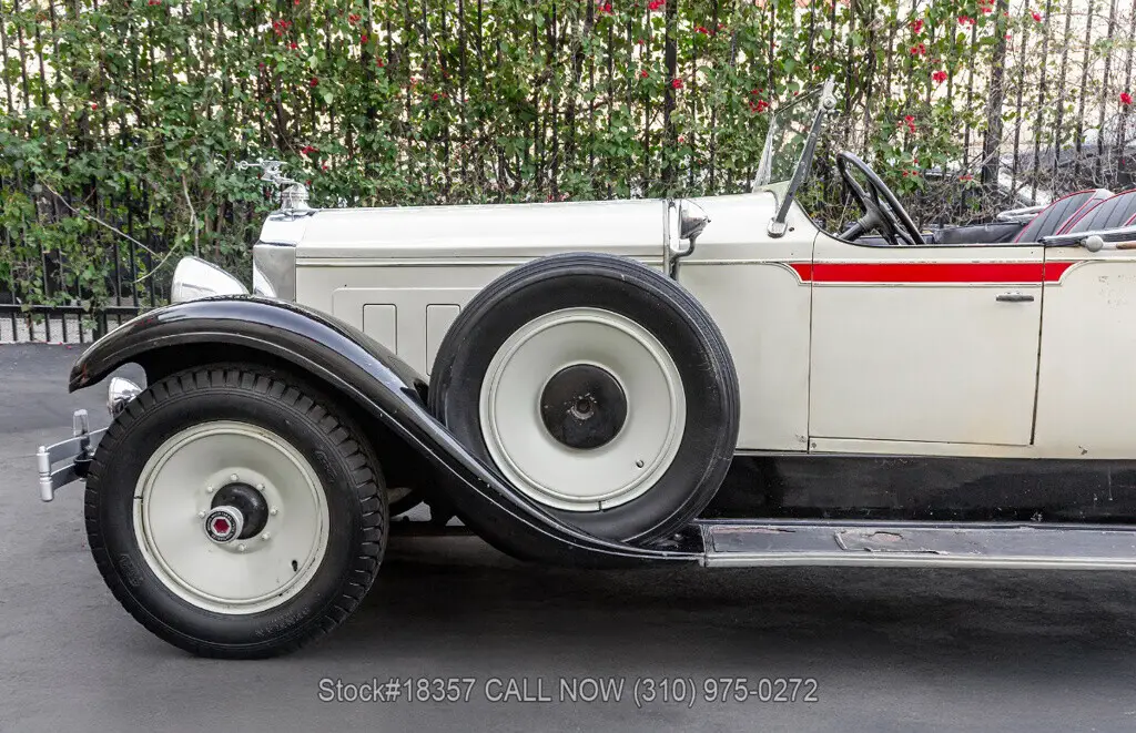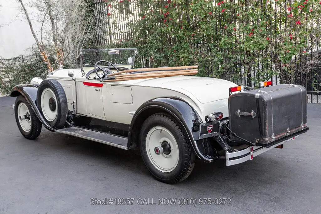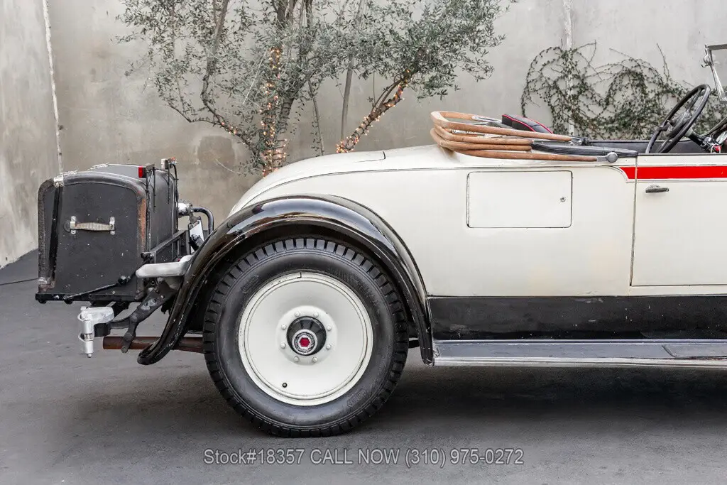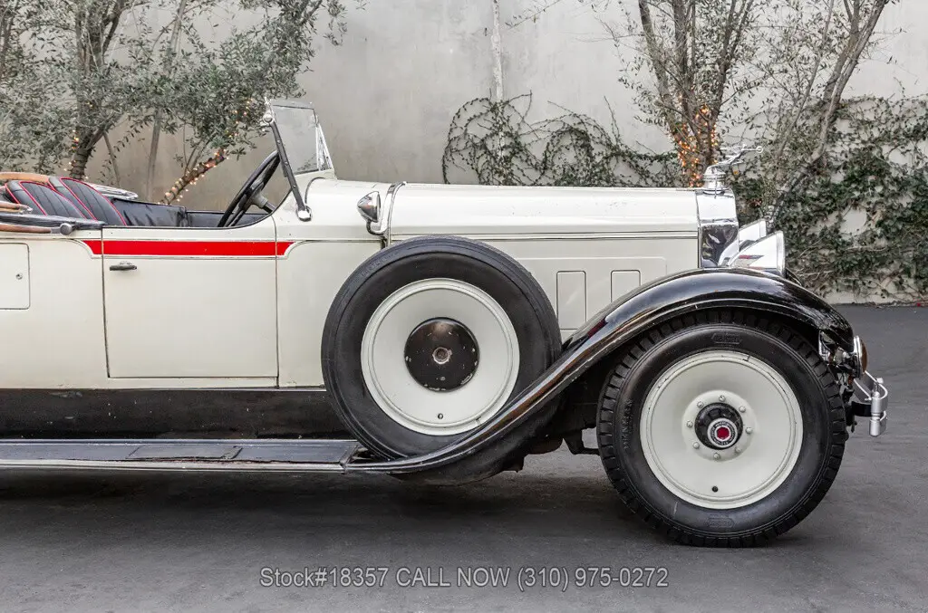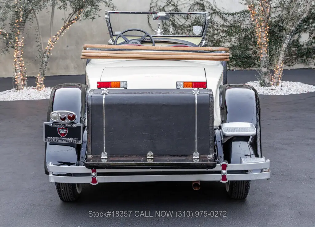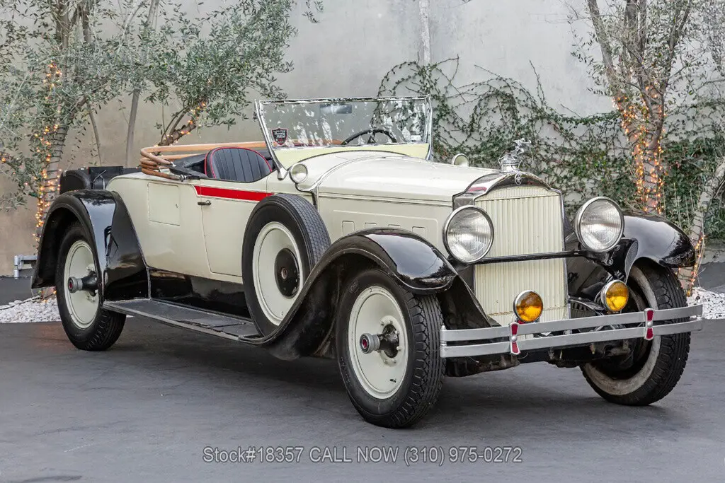 1929 Packard 640 Custom Eight Roadster Introducing this pre-war 1929 Packard 640 Custom Eight Roadster with a "Rumble Seat" that is finished in an ivory exterior with black fenders complemented by a black interior. Equipped with a floor-shifted automatic transmission, upgraded with a 305ci V8 engine, single exhaust outlet, hood louvers, four-spoke steering wheel, convertible soft-top frame, chrome bumper, side steps, Denman tires, 20-inch solid wheels, and two full-sized spare tires that are side-mounted. Step inside this classic Packard and you'll be greeted with bucket seating with red stitching, providing comfort and style. Featured amenities include body side-steps, an analog clock, and a rear luggage mount.