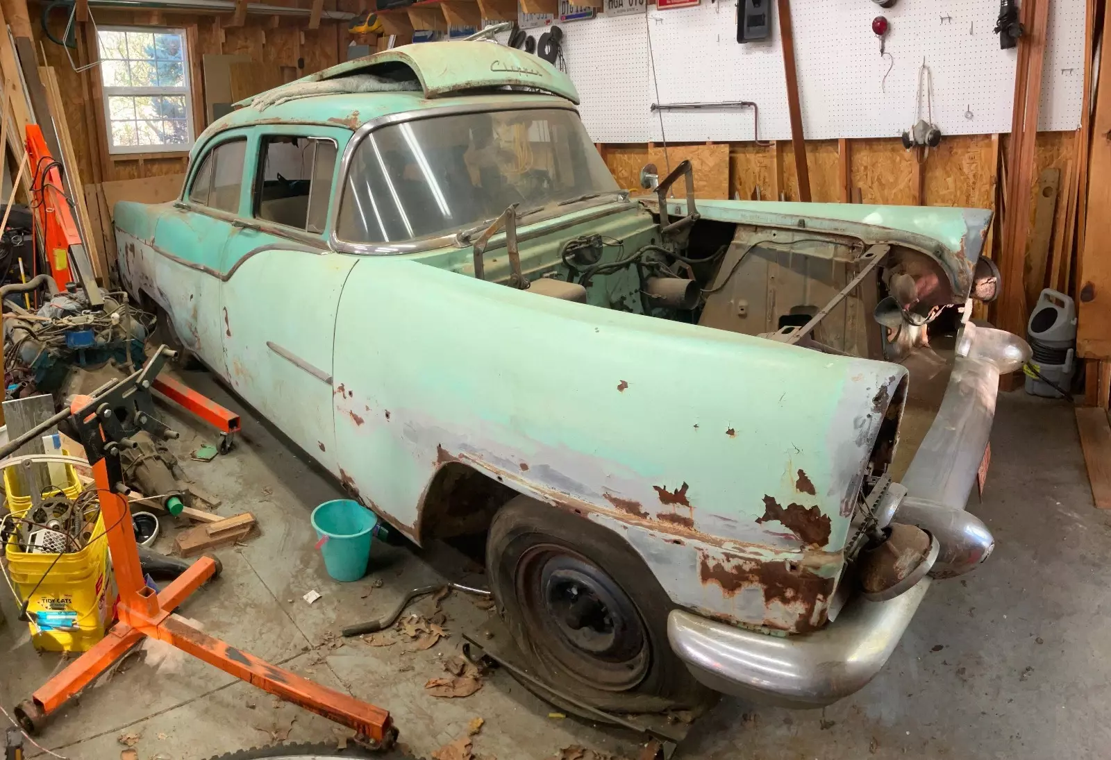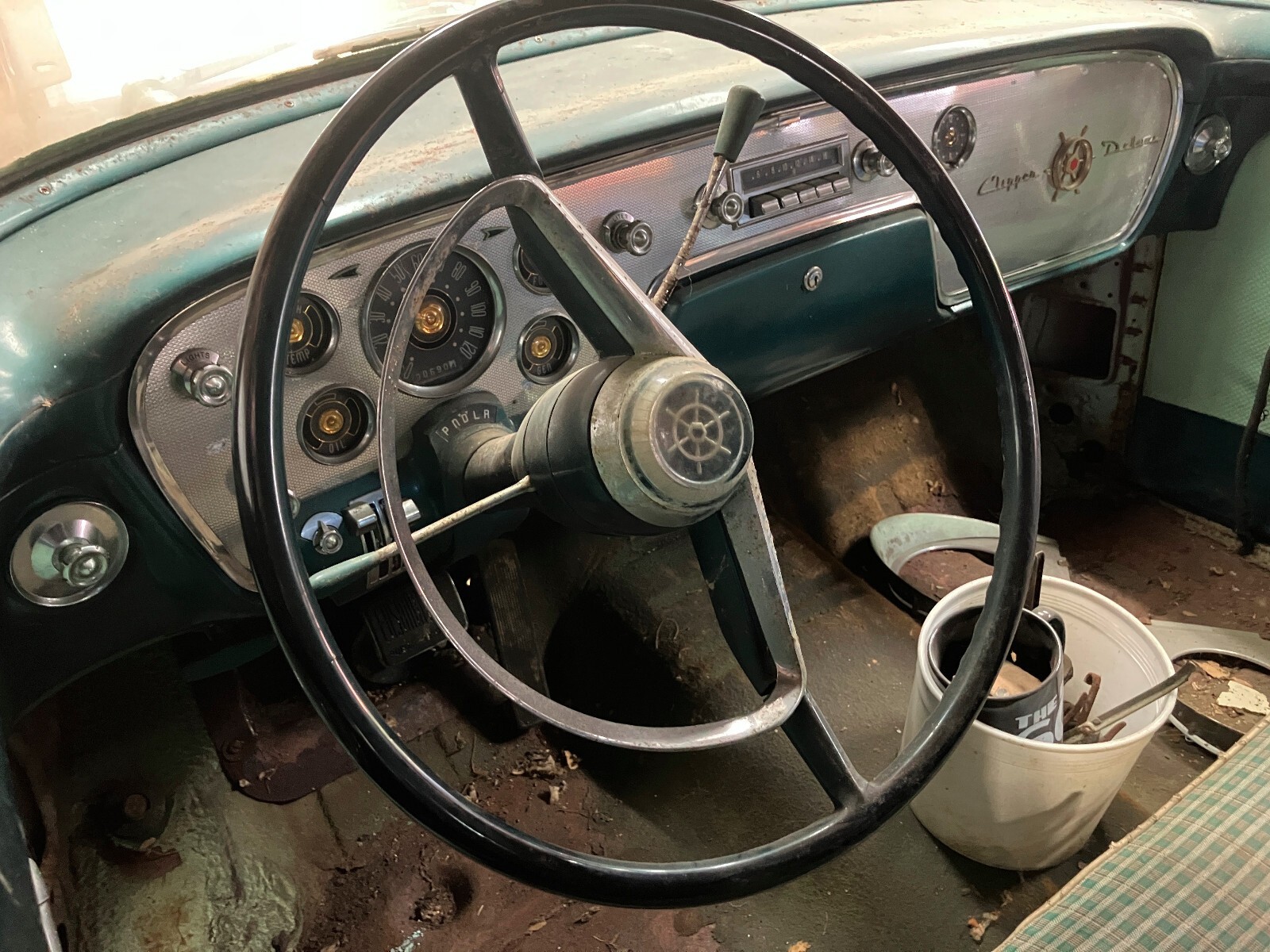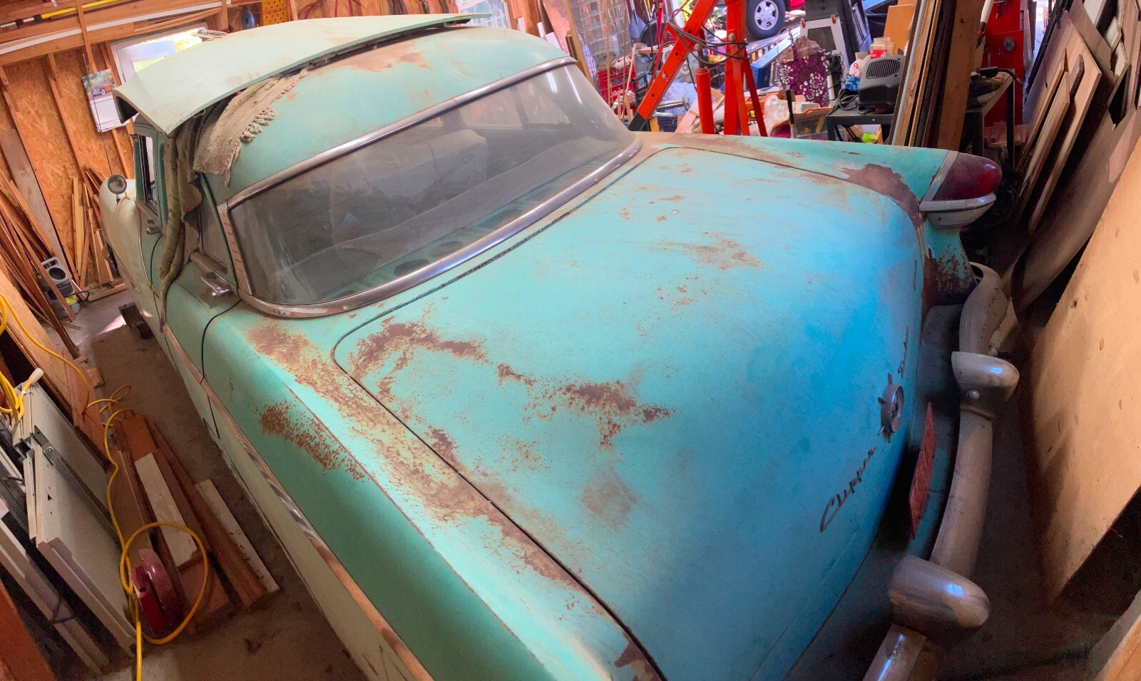 This is a 1955 Packard Clipper that I pulled out of a barn in Washington Court House, Ohio. It had previously lived its life in Columbus, Ohio, which is where it is now. I have removed the engine, but have not made much more progress than that, so it is time to move it on to someone else. The frame is solid, but the floors and the bottoms of the body panels have some rust. The right front fender has also been hit at some point. The trim for the fender is in the trunk. So are the read wheel skirts. The interior is complete, but the seats are torn and the headliner is mostly gone.