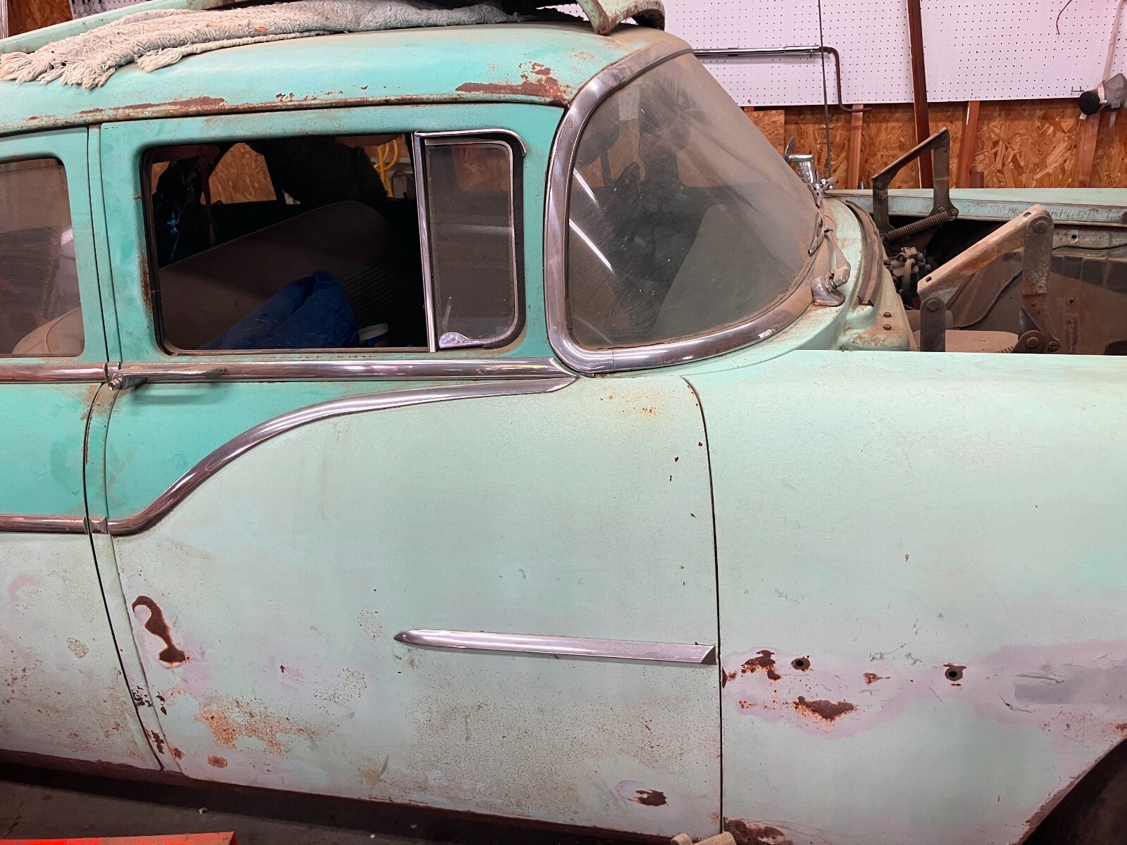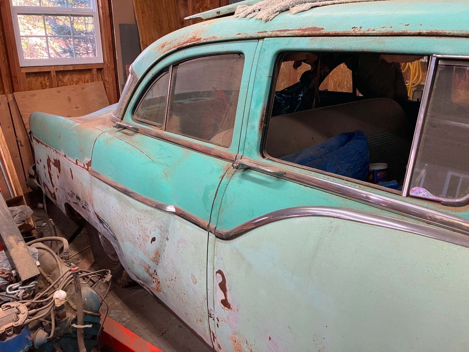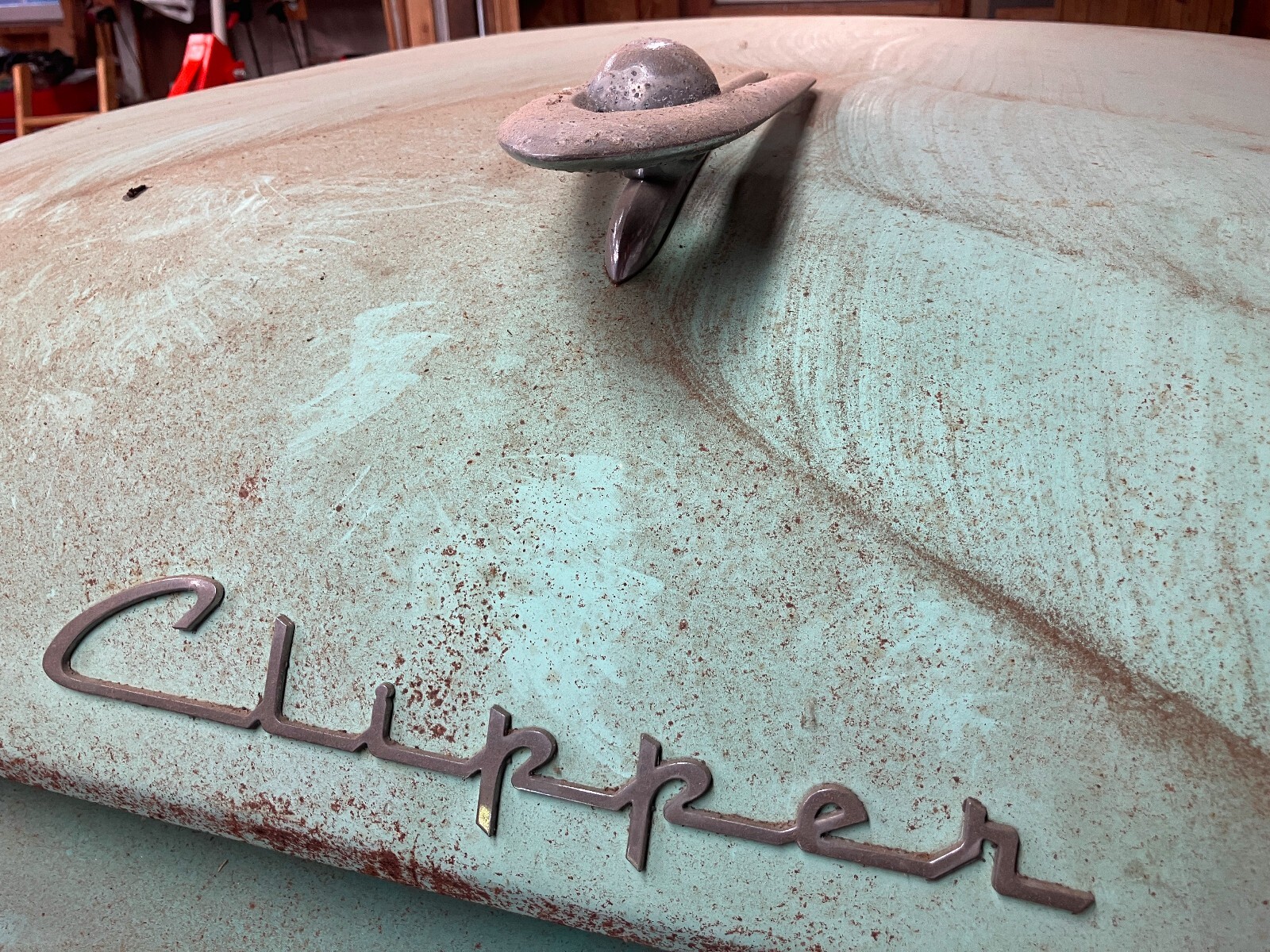 This is a 1955 Packard Clipper that I pulled out of a barn in Washington Court House, Ohio. It had previously lived its life in Columbus, Ohio, which is where it is now. I have removed the engine, but have not made much more progress than that, so it is time to move it on to someone else. The frame is solid, but the floors and the bottoms of the body panels have some rust. The right front fender has also been hit at some point. The trim for the fender is in the trunk. So are the read wheel skirts. The interior is complete, but the seats are torn and the headliner is mostly gone.