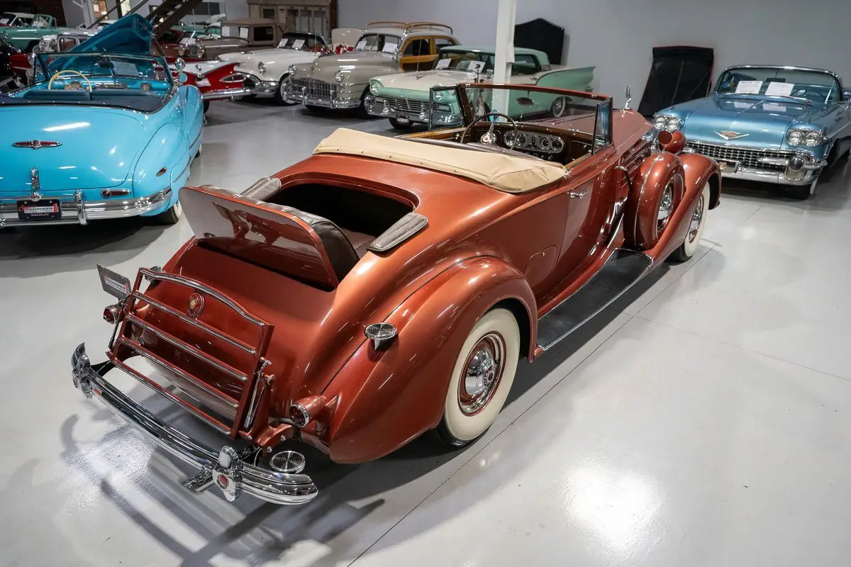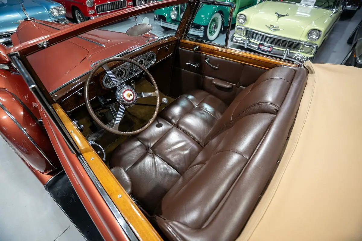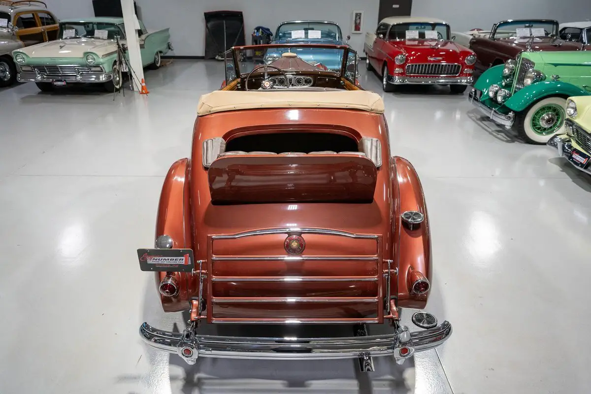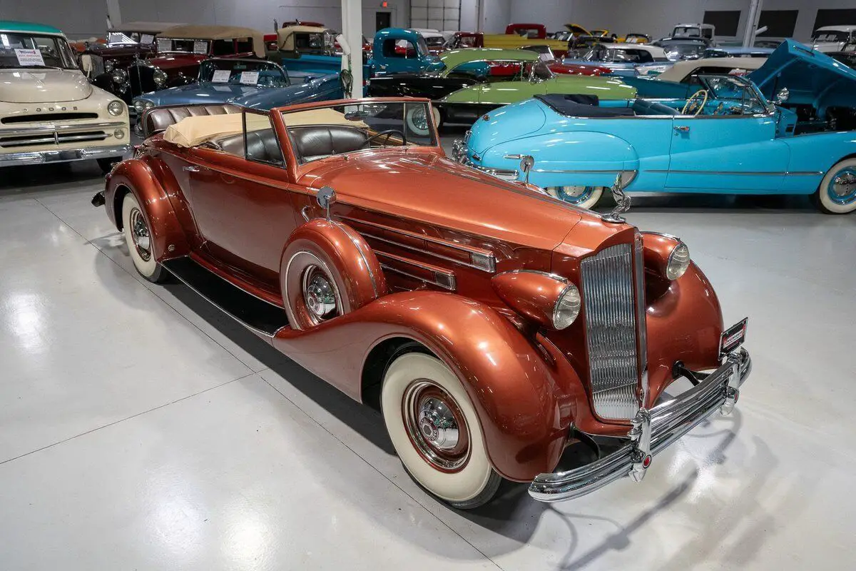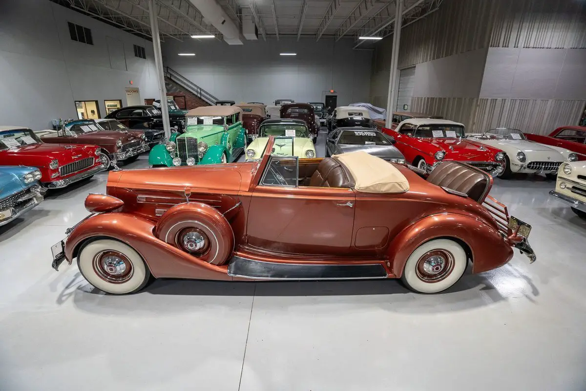 This 1937 Packard Twelve Model 1507-1039 Coupe-Roadster is an absolutely gorgeous V-12 Packard with impressive CCCA touring history. 1937 was an important year for Packard, the American luxury automaker who rose to prominence building some of the finest automobiles on US roads for decades. Like all American automobile manufacturers in the early 30s, Packard suffered significantly from the poor economic conditions and effects of the Great Depression. However, unlike virtually all of its luxury car manufacturer contemporaries, such as Marmon, Stutz, Auburn-Cord-Duesenberg, Peerless, and Pierce-Arrow, all of whom went bankrupt, Packard was able to survive and by 1937 Packard was thriving. Packard's ability to persevere through the Great Depression was due in large part to Packard's entry into the intermediate-priced car market. While Packard experienced impressive success selling its more affordably-priced Packard 120, the luxury automaker never completely abandoned its "Senior Packard" lines. In September 1936, the Fifteenth Series Packard Twelve models were introduced alongside the lower-level Super Eight models, however, the Packard Eight was gone. The 1937 Packards' most important and notable improvements were the mechanical upgrades. Up front, Packard swapped its single front axle for its new "Safe-T-Flex" independent front suspension that delivered a much smoother ride cruising down the road. In addition, Packard upgraded the braking system to a 4-wheel hydraulic setup, replacing the antiquated mechanical brakes that adorned Packard's previous generations. In addition, Packard modernized the doors on its Twelve models now outfitted with front hinges which was not only forward-looking but also much safer, compared to the suicide-style doors found on the earlier Packards. With the introduction of the 6 cylinder Packard 115 and the sales success of the more established 120, Packard sold the most cars in its history. Nonetheless, Packard produced a mere 1,300 Twelves, of which, included a believed 69 Model 1039 Coupe-Roadsters, which makes this particular vehicle a particularly rare automobile. The 1937 Packard Twelve's beauty and rarity means that it's recognized by the Classic Car Club of America (CCCA) as a Full Classic meaning that it qualifies to participate in CCCA events and CARavans. In addition, this particular Coupe Roadster comes to us from a prominent collector of Full Classics who is believed to have been the steward of this car for 40 years and won the CCCA William F. Crossett Award in this car on its debut CARavan. Powering this '37 Packard Twelve is a 473.3 Cubic Inch V-12 engine fed by a Stromberg single 2 barrel carburetor that was said to have created 175 horsepower when new. The 473 V12 is mated to a 3 speed manual transmission that is shifted using a floor mounted shifter. Braking is supplied to all four wheels via vacuum-assisted hydraulic brakes which makes bringing this 5,000+ pound Coupe Roadster to a complete stop much easier. This Fifteenth Series Packard is well appointed with options further elevating this particular roadster above many others. With dual side-mounted spare tires and matching side-mount covers, this 1937 Packard 12 has truly luxurious curb appeal. Moreover, each side-mount cover is topped by a chrome mirror which makes squeezing into a tight spot at the local car show or drive in much easier. The rear mounted luggage rack is another welcome addition so that you can easily carry all of your belongings with you on an overnight trip or cruise. The front bumper is also appointed with the optional bumper guards further elevating the exterior appearance of this impressive automobile. Golf club access doors are also incorporated into both sides of the Coupe Roadster which was a neat novelty of many Pre-War classics and makes this Senior Packard a car that you could take to the country club for a round on the links. Riding on a set of wide whitewall bias-ply tires mounted on wheel discs accented by Packard Twelve wheelcovers, this Full Classic has a stunning look whether parked at the car show or cruising down the road. The exterior has been refinished in a beautiful Copper Mist hue and was a tasteful update to this nearly 90 year old convertible. The beige cloth convertible top is manual operated and is in fantastic condition as well. The chrome and brightwork around the exterior of this 1937 Packard Twelve is in wonderful condition and complete the exceptional exterior look of this car. The interior of this 1937 Packard Model 1039 Roadster is absolutely stunning! The front bench seat and rear rumble seat have been reupholstered in elegant Walnut Brown leather. The matching upholstered door panels with armrests and burl woodgrain accents, burl woodgrain dash, and full-size banjo-style steering wheel are in outstanding condition as well and appear to be in their stock coniguration. This '37 Packard Twelve Roadster is outfitted with full instrumentation including a 120 MPH speedometer, temperature gauge, oil pressure gauge, amp gauge, and fuel gauge. Also incorporated into the instrument cluster is a clock and optional AM radio. Likewise, an optional heater is mounted neatly under the dash as well. The dash is completed with a pair of locking gloveboxes, starter button, headlight controls, throttle controls, and a cigar lighter. Whether you're adding to an existing collection of CCCA Full Classic or you are buying your first classic car, this 1937 Packard Twelve Model 1507-1039 Coupe-Roadster would make an excellent choice. Give Ellingson's a call today at 763-428-7337!