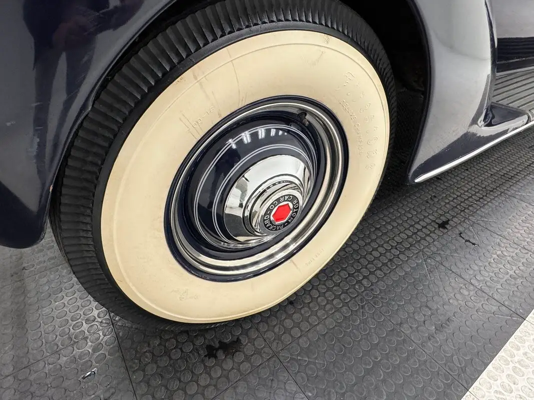 A tall chrome grille sits perpendicular to the vented engine covers and no angle of this car is without some type of contrasting trim to the Algiers Blue, a dark shade that enhances the metalwork. That includes the light rings and Centurion like trim on their buckets, the rocket mascot on the nose, and even the shiny rails on the luggage rack. Elegant wheels are body colored with dual pinstripes, beauty rings, and the red hexagon of Packard. In profile, it's a tall vehicle with a running board to assist entry, front opening doors, and proportionally narrow windows. Both ends feature smooth rounded chrome bumpers and typically small tail lights matched with large cased headlights. Imperfections include chips, areas of dull paint, various bubbling, abundant crazing, scratches, and cracking paint.